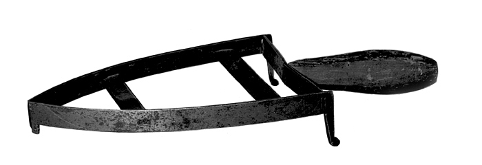 STRYKJÄRNSFOT Av järn, med träskaft. Bestående av en kantställd hjärtformig ram på tre fötter, en i vardera av bakre hörnen och en i spetsen; fötterna fyrsidiga, avsmalnande nedåt samt med hoprullad nederände; inuti ramen två tvärgående, på bredsidan liggande skenor. Skaft av furu, spolformigt, rakt utstående från ramens bakre ände samt fäst på en tånge. Ram, höjd: 4 cm.; längd: 19,6 cm.;bredd: 13,6 cm. Skaft, längd: 11 cm. Inköpt av Wilhelmina von Hallwyl, före år 1886, obekant var.