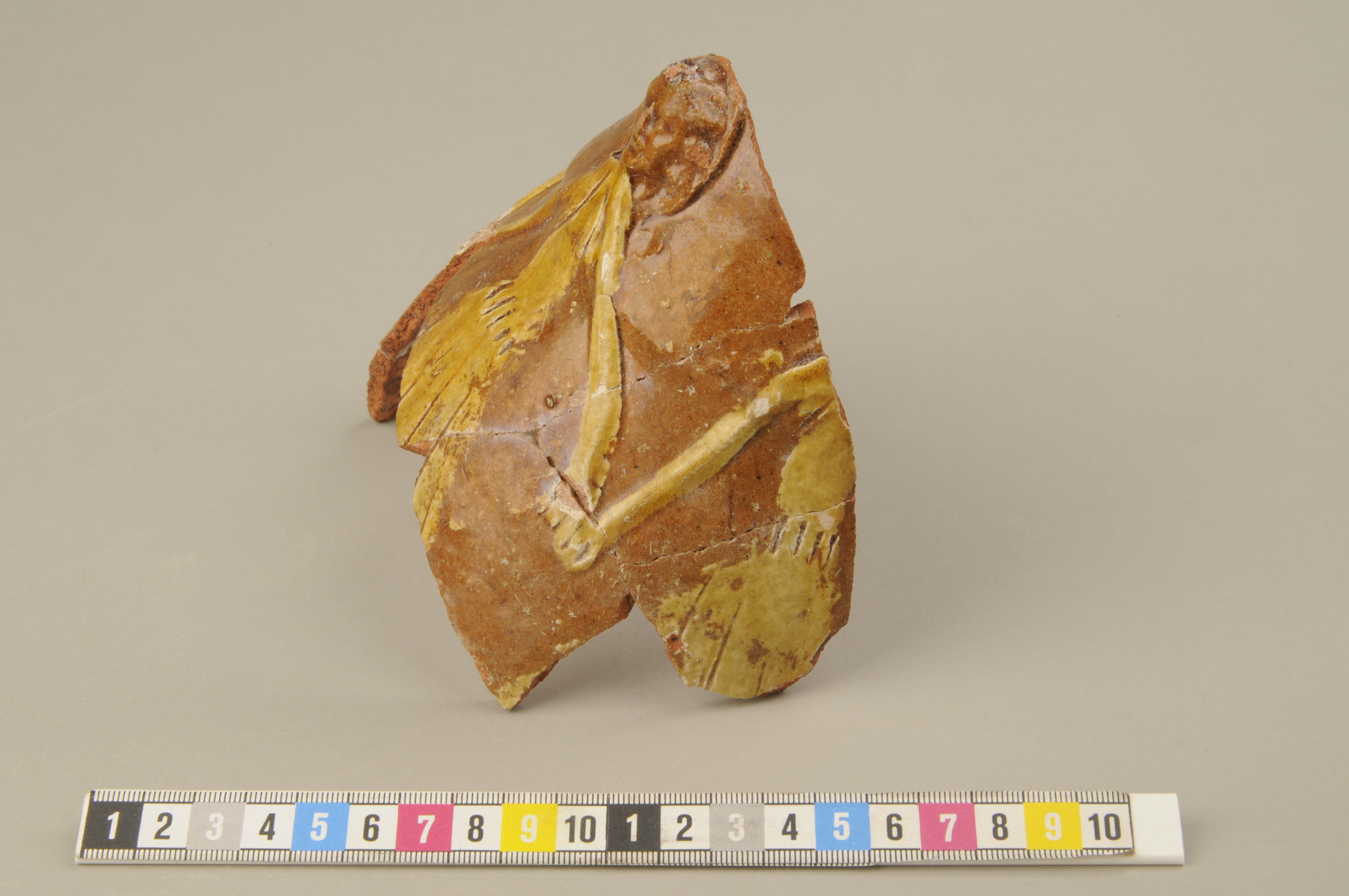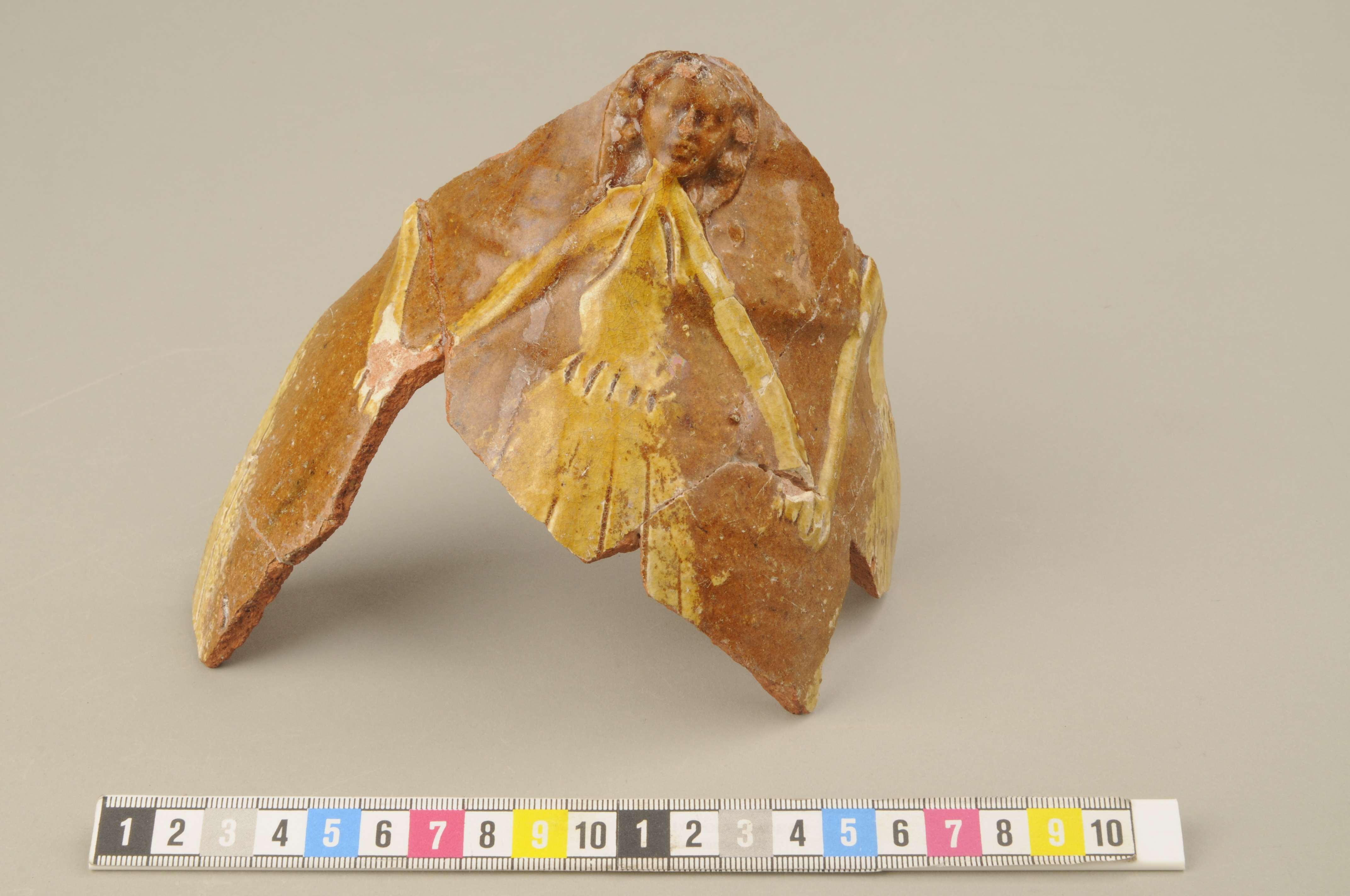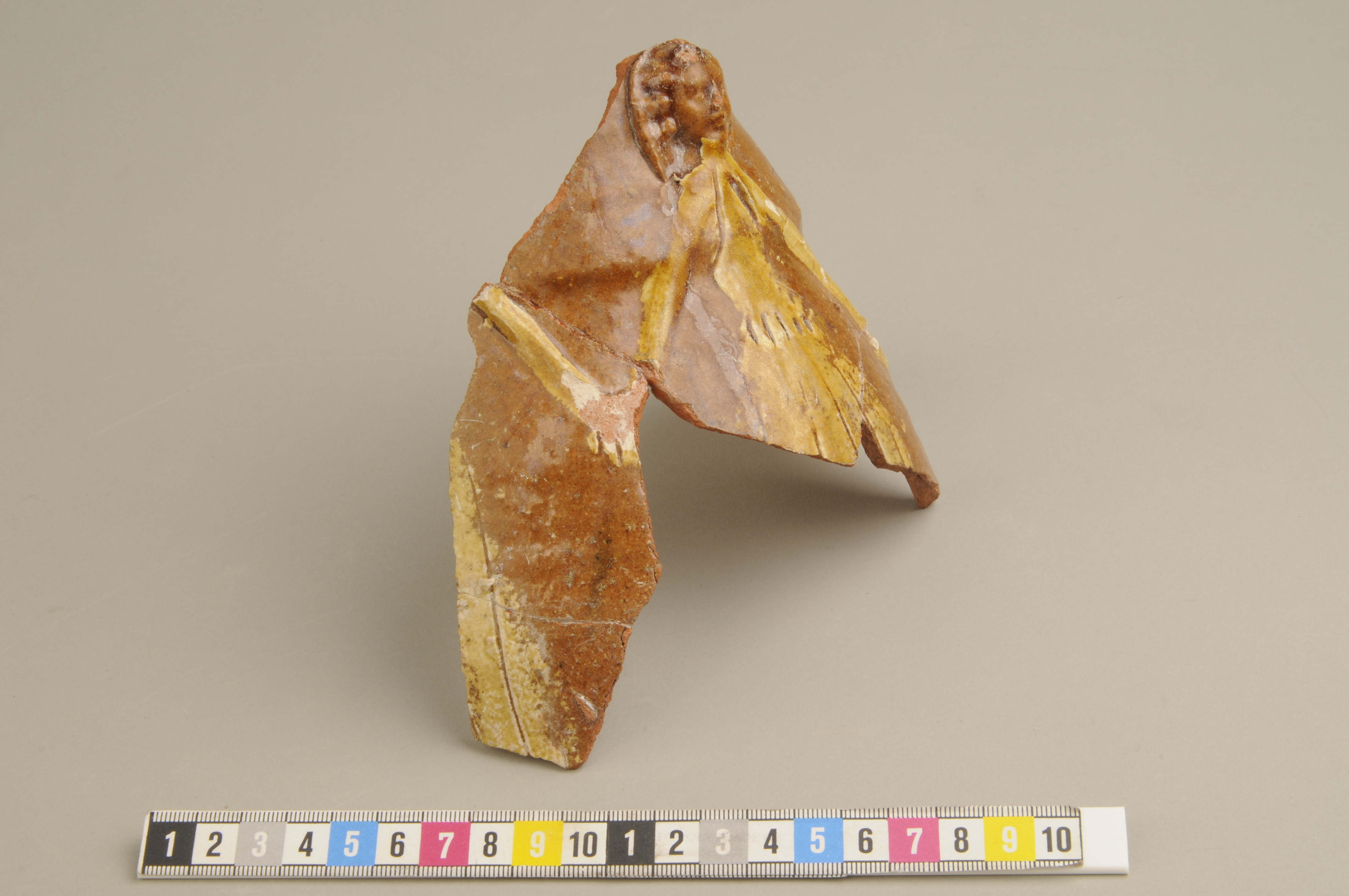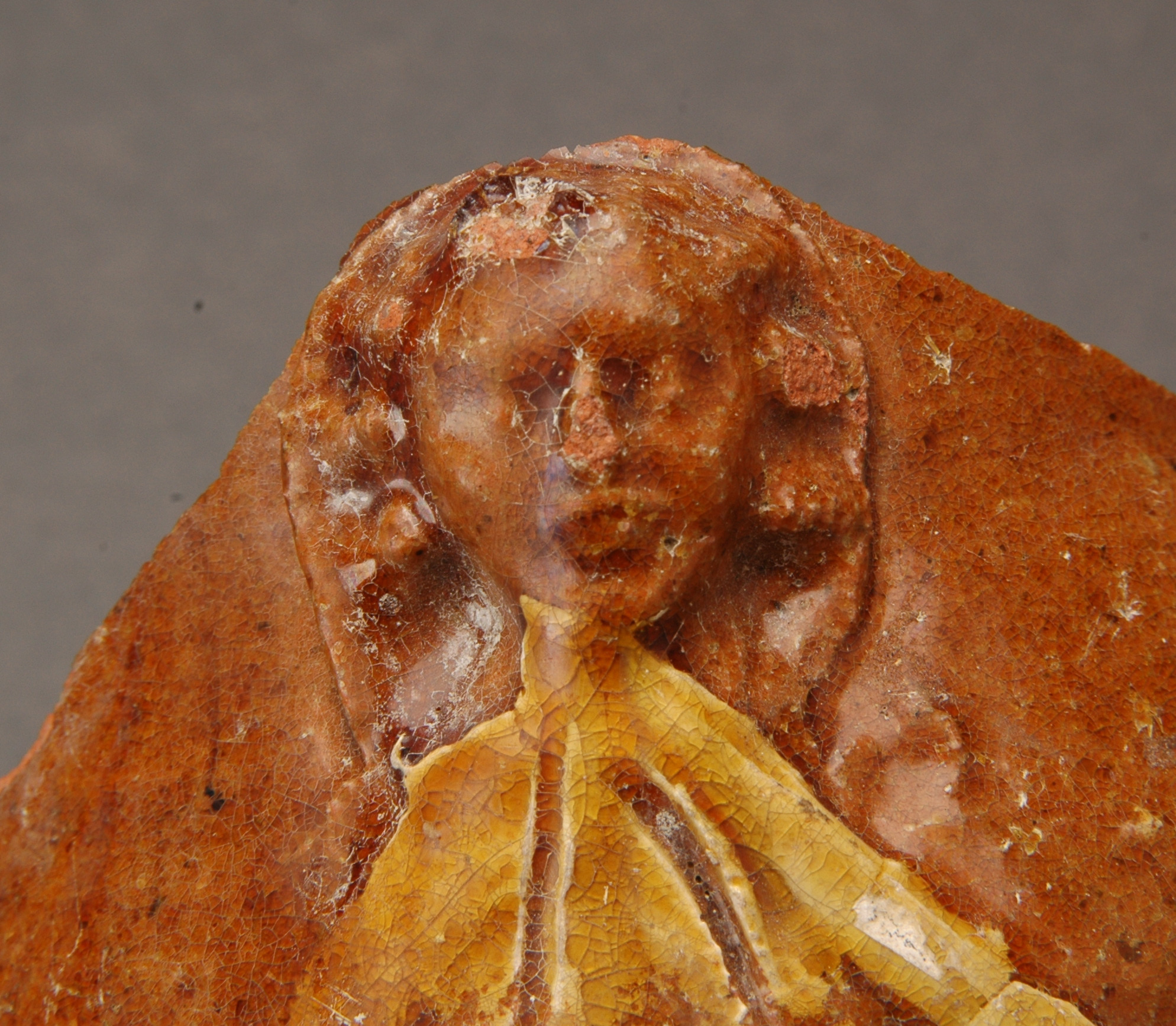 utsida: människomotiv i vit engobe med klar glasyr, formpressat plastiskt ansikte