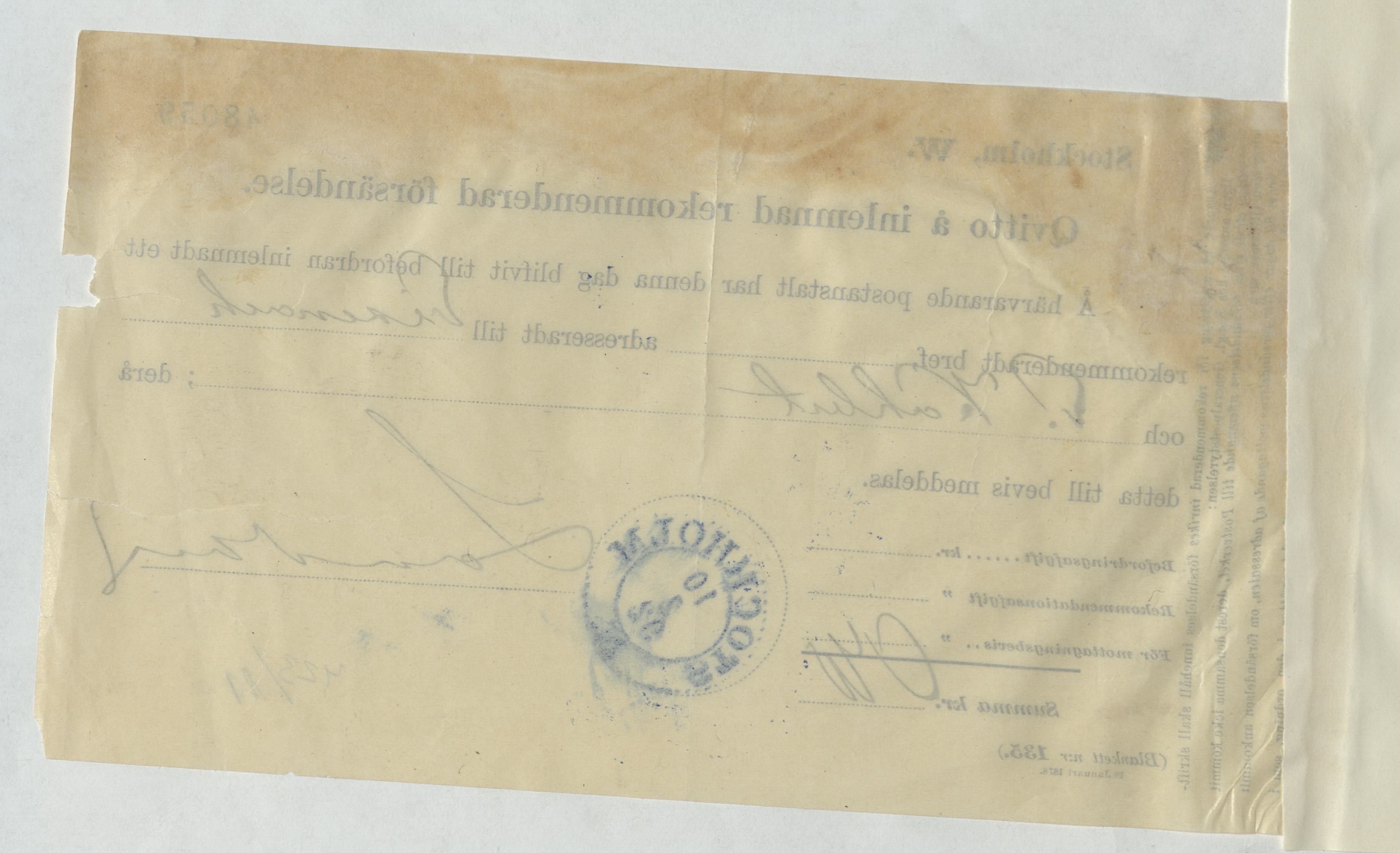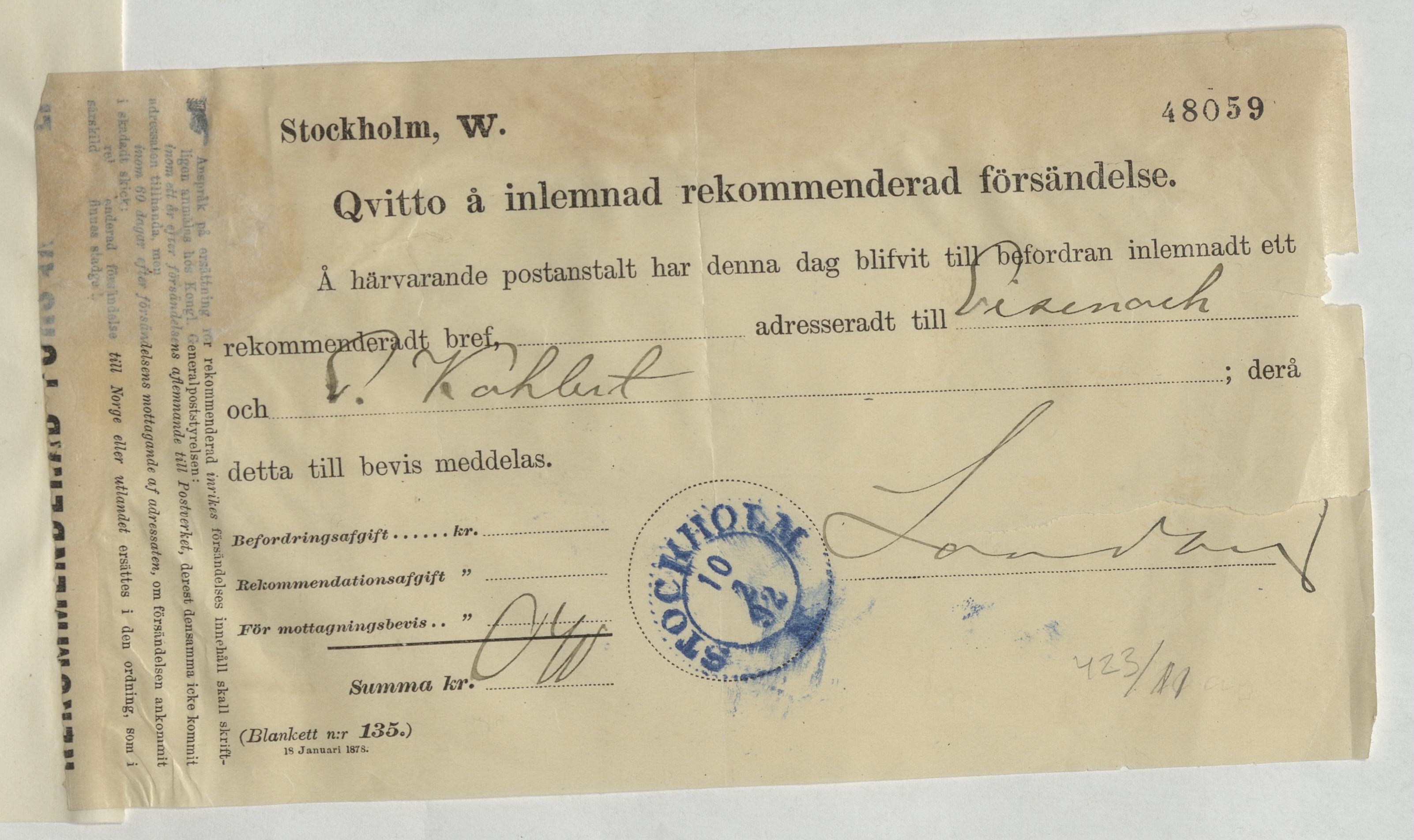 Kvitto för inlämnad rekommenderad försändelse gällande E. Kahlert