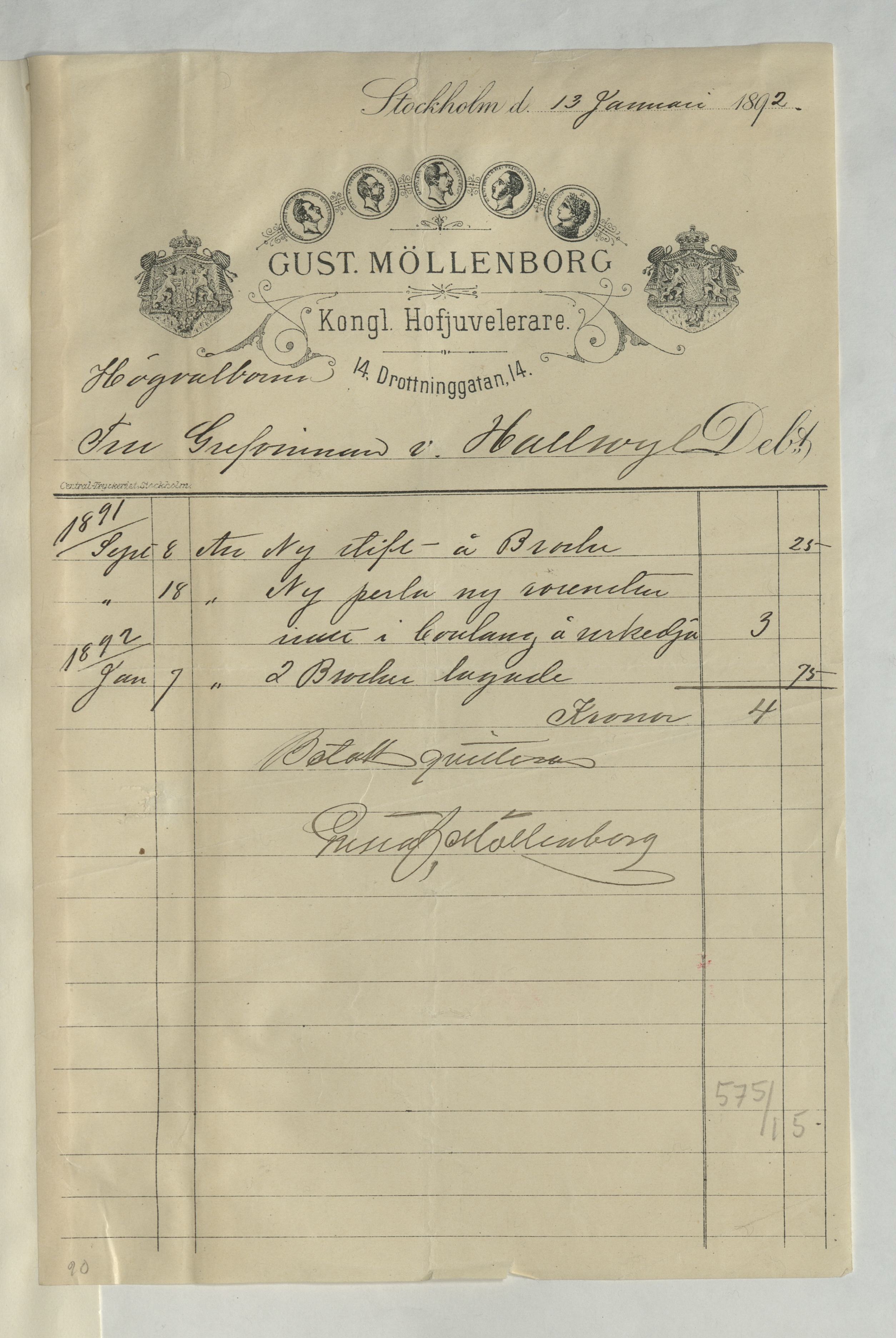 Kvitto från Gustaf Möllenborg, Juvelerare, 1892