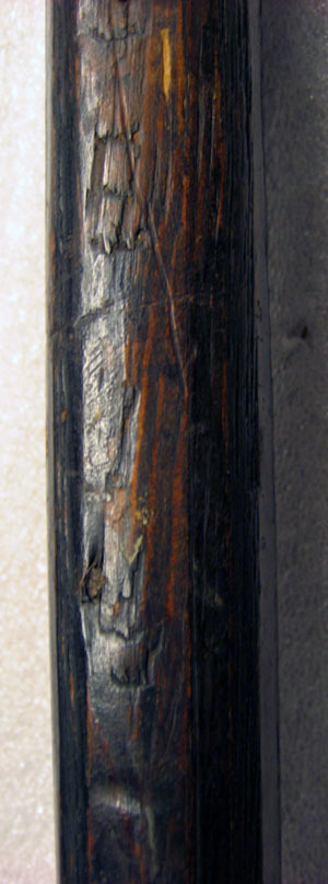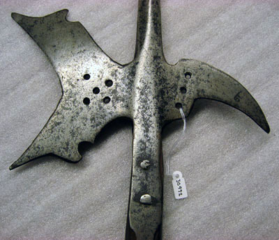 Huvud av blankt stål smidd i ett stycke. Klinga rak, fyrsidig med rombiskt tvärsnitt, uppåt avsmalnande med spetsig udd. Holk, h ca 50 mm, med nertill smidda skenor, l 380 resp. 220 mm. Skenorna upptill 20 mm breda, efter 80 mm kraftigt avsmalnande. Yxblad med halmåneformig konkav egg, mittenpartiet mjukt V-formigt. Grunda urtagnngar i ändarna gör dessa spetsiga. Innan för dessa rundad urtagnigar bildandes två inåt riktade vingar, h 10 mm. På bladet fem hål i grupp. Haken lätt böjd, riktad utåt och snett nedåt. Bredare bas med nertill klack och upptill mindre rundad urtagning, i mitten tre hål i rad. Stång av svartmålat trä med cirkulärt tvärsnitt, diam 26 mm. Nedåt svagt avsmalnande.