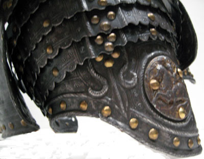 TILLÄGG Ärmens delar hör samman med vänster axelstycke men är monterat på höger axelstycke. Nuvarande montering är utförd under 1900-talet. Skenorna har också ursprungligen varit monterade på tre breda läderremmar med nitar. I kanterna har funnits läderremmar för fästande av dekorband. De olika lamellerna har en inbördes numrering med triangulära punsmärken för att kunna montera dem i rätt i ordning.