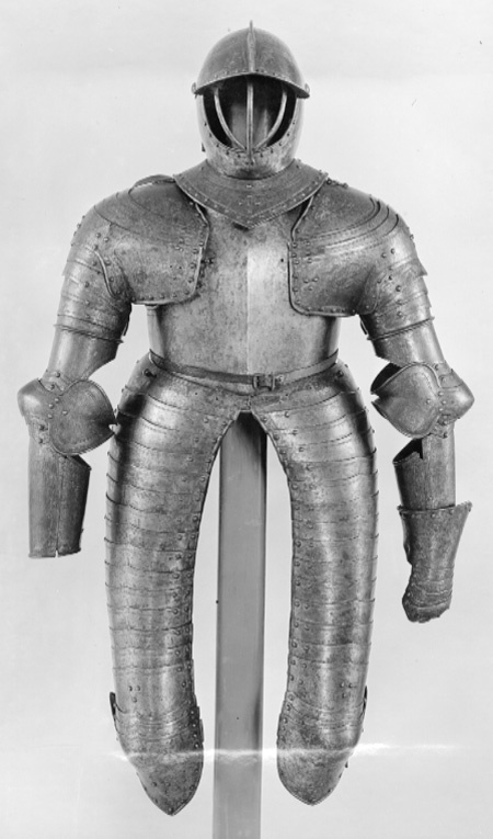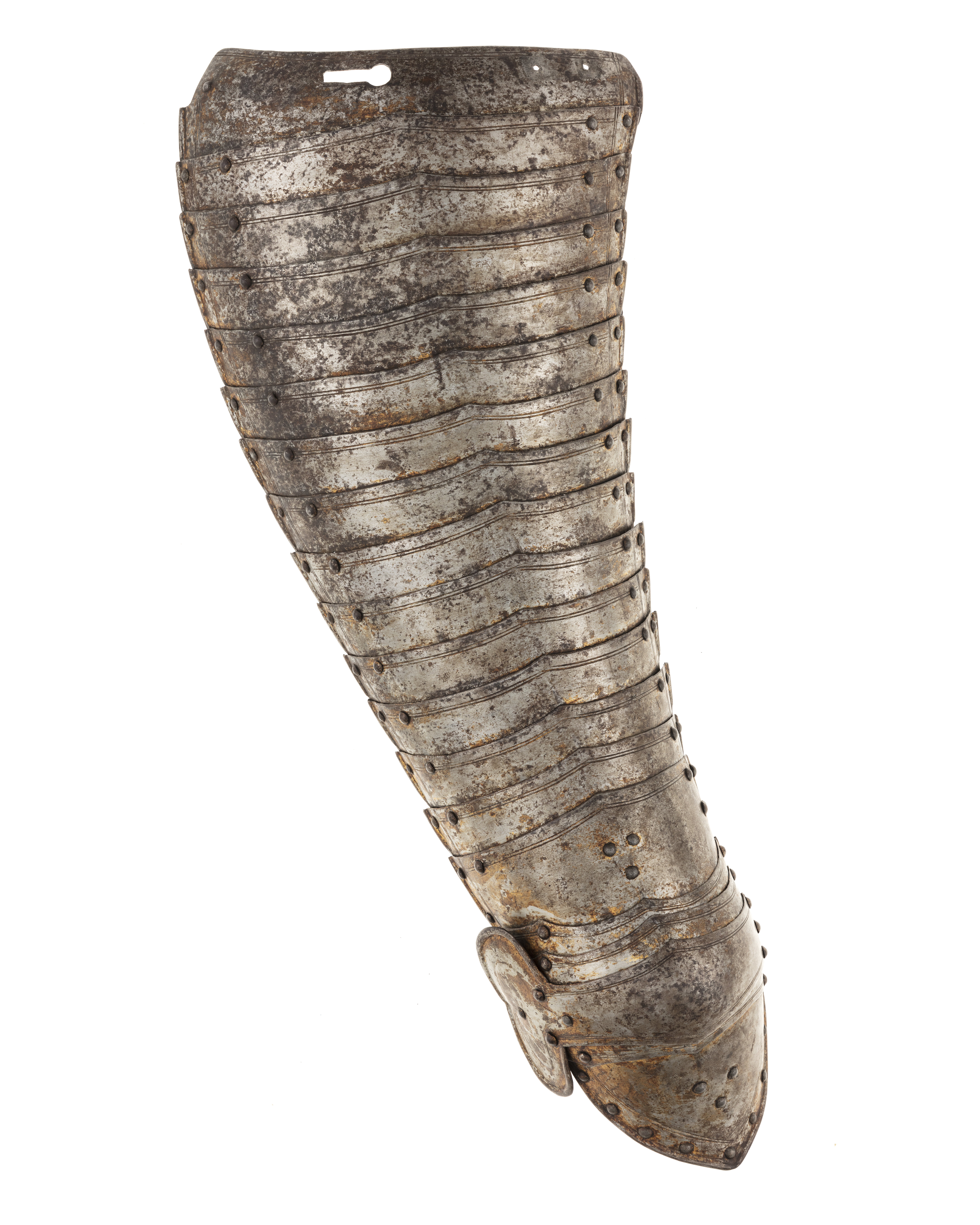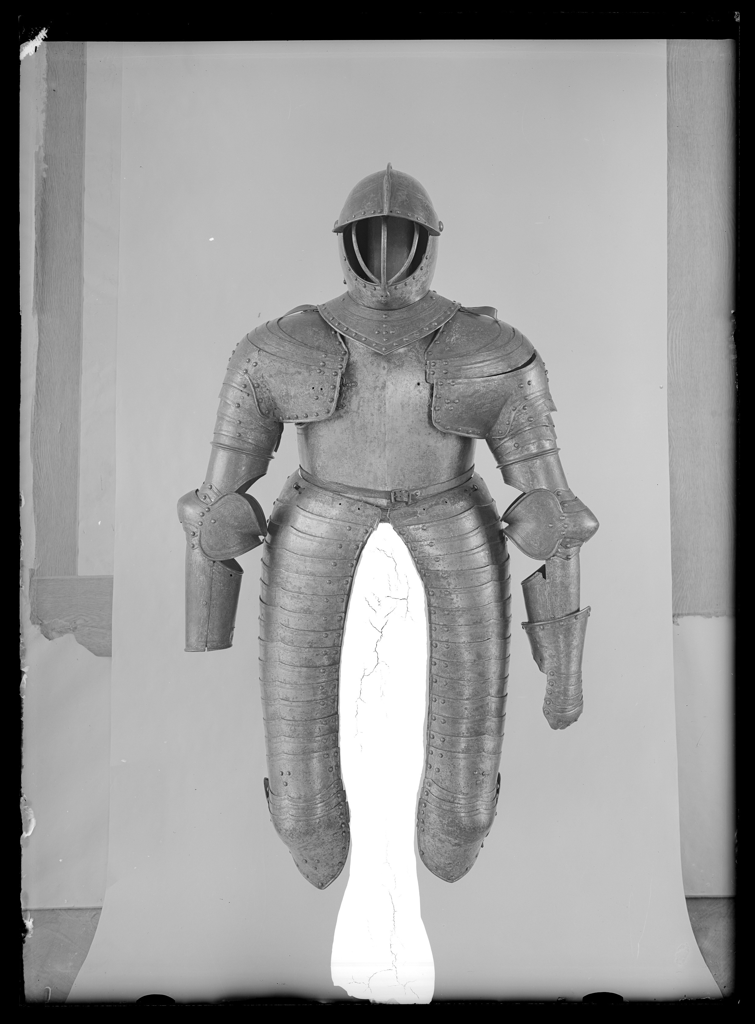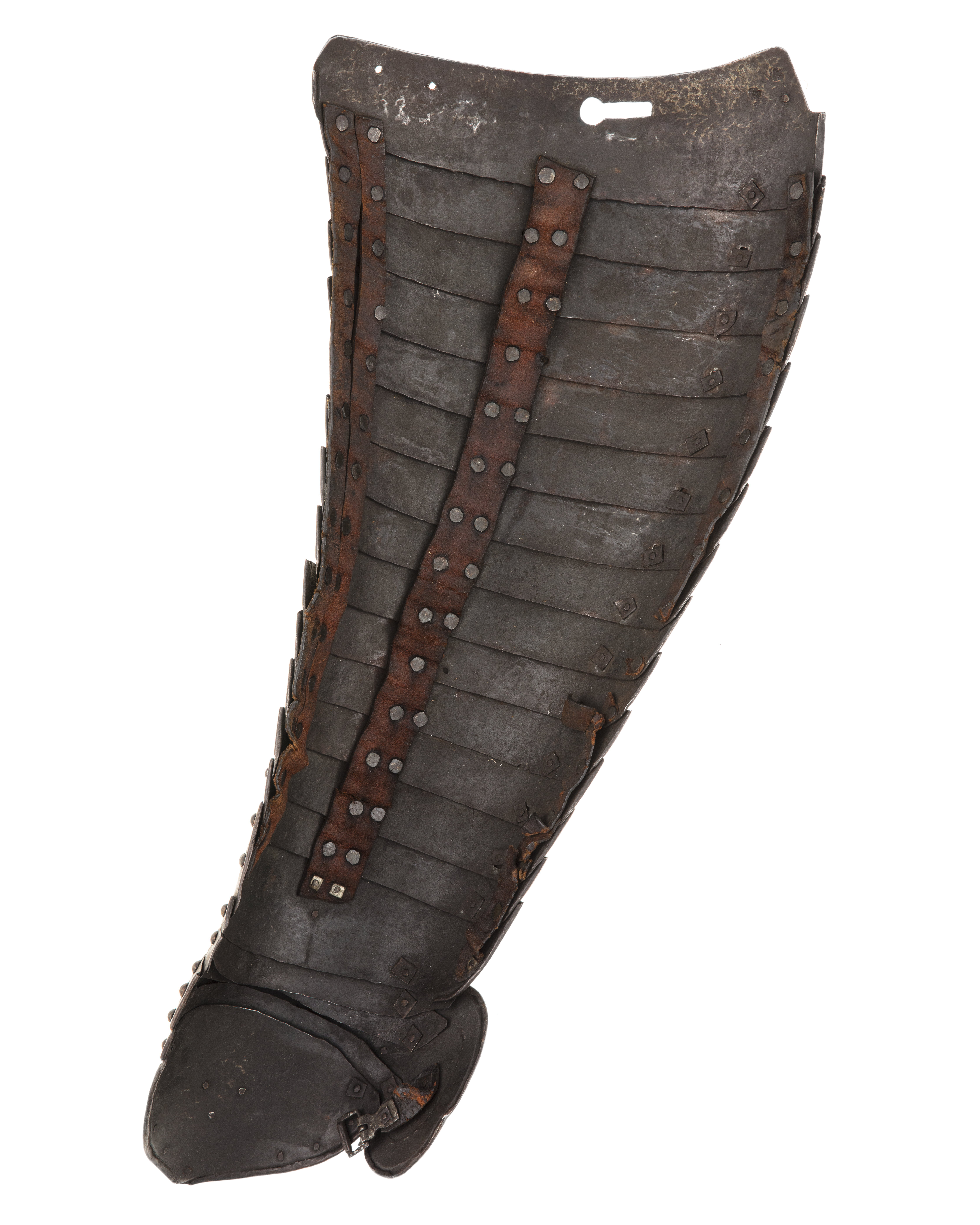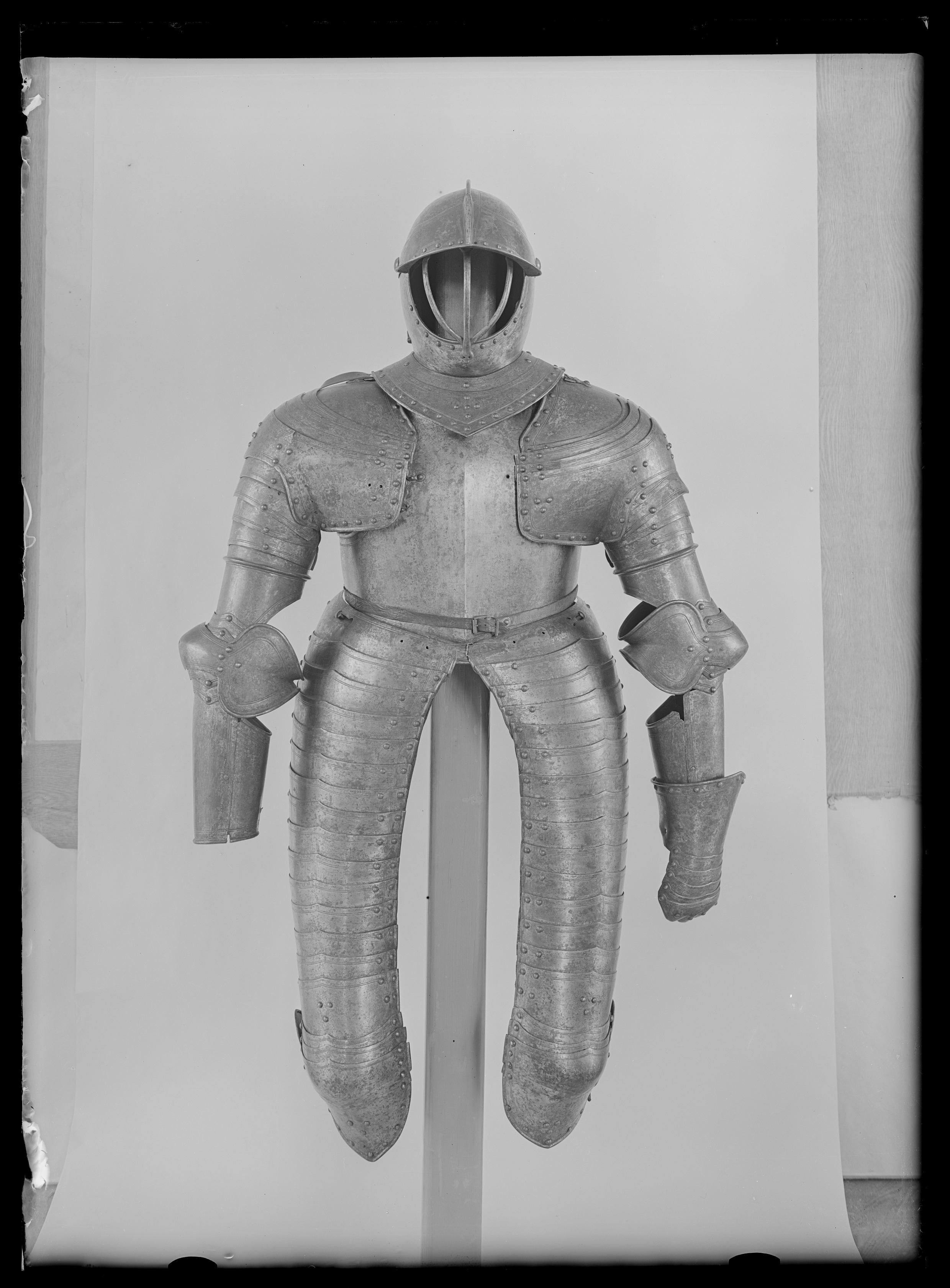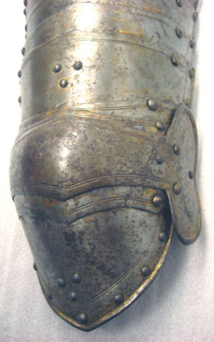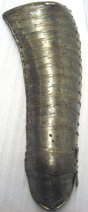 Driven stålplåt, tjocklek 3 mm. Utsida med rester av förgyllning. Sammanlagt 20 delar. Lårstycke av 14 välvda skenor nedåt avsmalnande i bredd. Sammanfogade omlott med nitar fästade på insidan i kanterna och i mitten med läderband, b 53-23 mm. Ytterkanterna omvikta och rundsmidda och övre kanten i mitten utdragen till svag spets. I sidorna och övre kant ristad dubbellinje. Översta skenan med i yttre kanten vertikal urtagning, i mitten nyclelhålsformat hakhål, l 43 mm. Knäbuckla, väld med övre och undre kant utdragen till svag spets. Mot utsidan utdragen till oval mussla, h123, b 73 mm, mot insidan tvärt avslutad. På musslans insida ett svart läderband med i änden sölja av stål, l 60 mm. Söljan med rektangulär platt ram och utåt rulle. Upptill förlängning av två mindre och en större skena, nertill av en mindre och en större. De mindre skenorna med övre kant utdragen till tre spetsar. Nedersta skenan avsmalnande nedåt till spets. Runt kanterna ristade linjer och nitar.