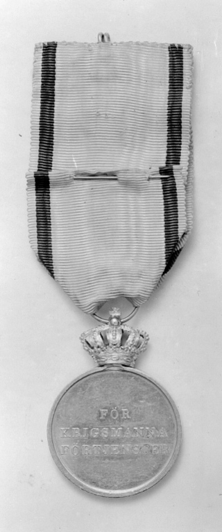 Krönt guldmedalj. Åtsida: Rund platta med bågformigt böjd skraffering, därpå i relief svärd och tre kronor, omskrift:"KONUNG OCH FÄDERNESLAND". Frånsida: Relieftext: "FÖR // KRIGSMANNA // FÖRTJENSTER".