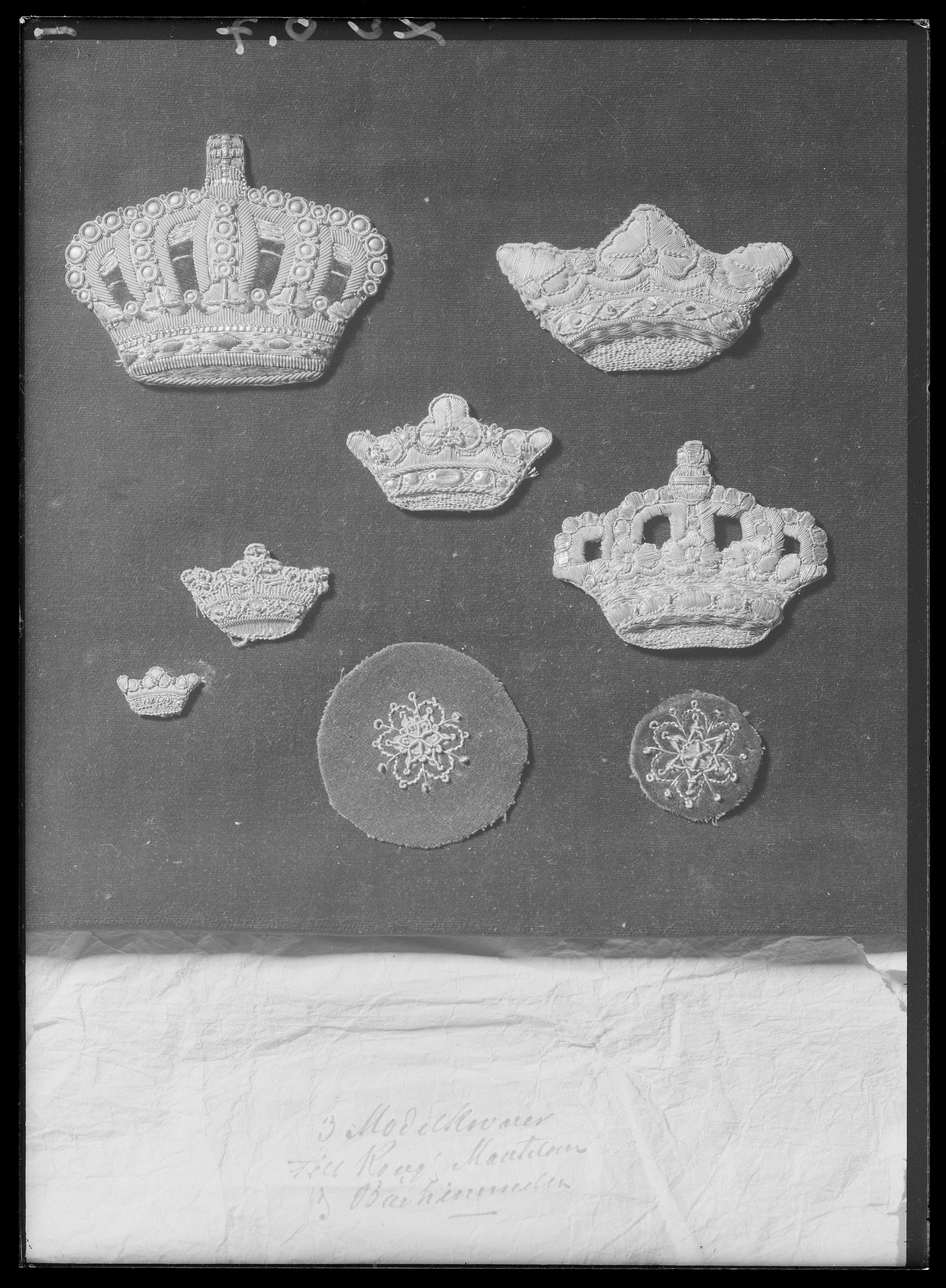 Dräktornament på scharlakansröd sammet, stjärna broderad med paljetter och kantiljer, broderat på linne och förstärkt med papper och lim.