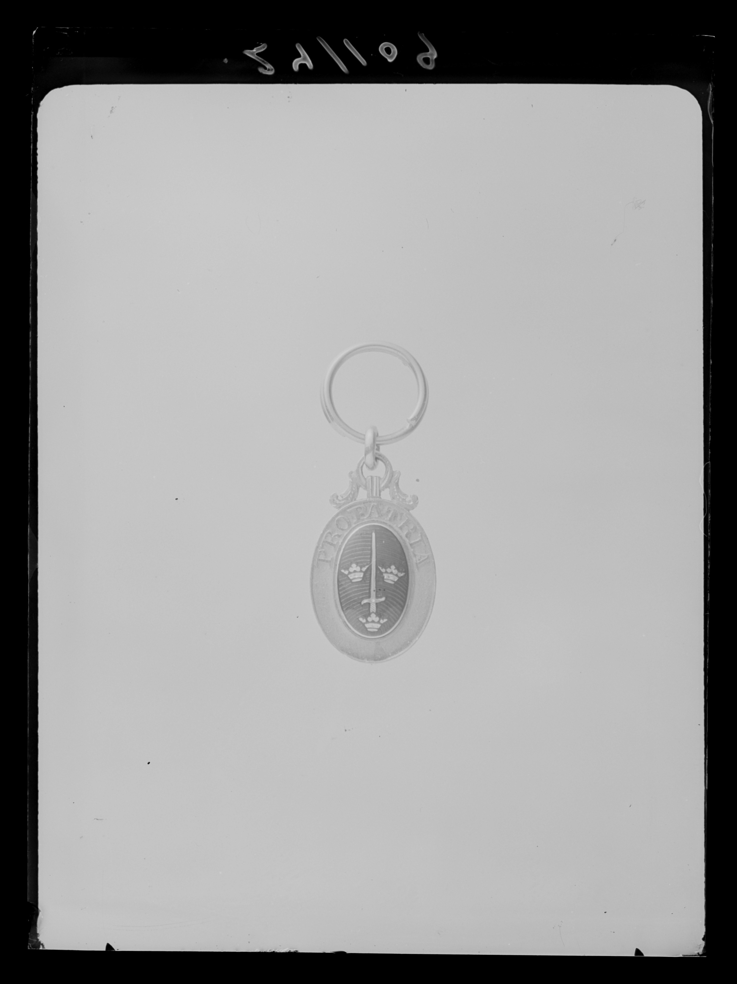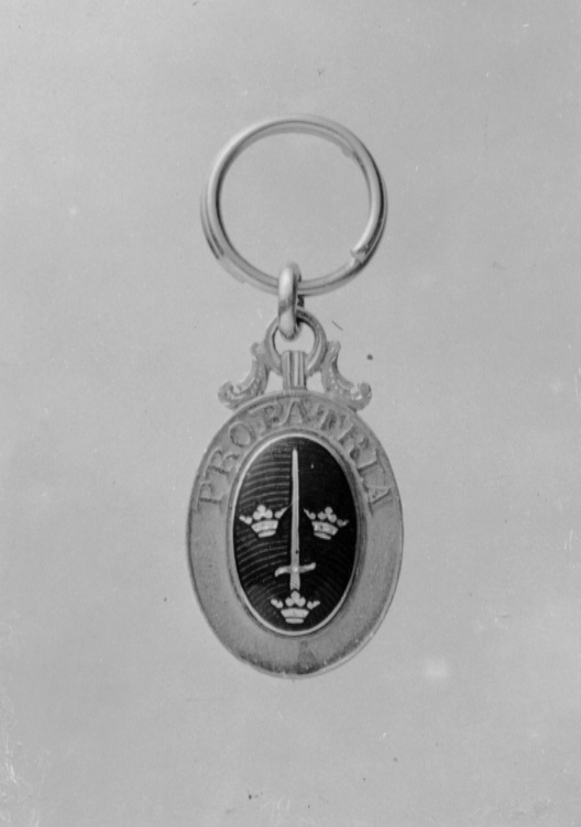 Dubbelsidig oval medaljong av guld med i mitten svärdet och tre kronor mot mörkblå emaljbotten. Runtom ram med upphöjd versaltext mot punsad botten: "PRO PATRIA". Upptill oval ring flankerad av vingar, däri fäst oval ring och rund spiralformig guldring.