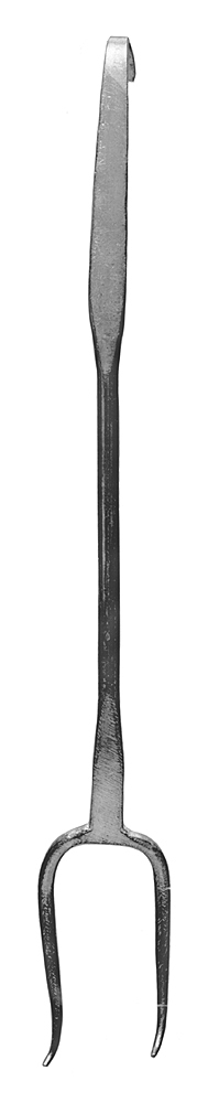 STEKGAFFEL Av förtent järn. Tvåkloig, med böjda spetsiga runda klor. Skaft långt, mellersta delen rundstavig, änddelarna platta samt avsmalnande utåt, den yttre med ytteränden omböjd till en lång hake. Längd: 38,3 cm.; bredd: 5 cm. Skaft, längd: 30 cm. Fransk tillverkning.