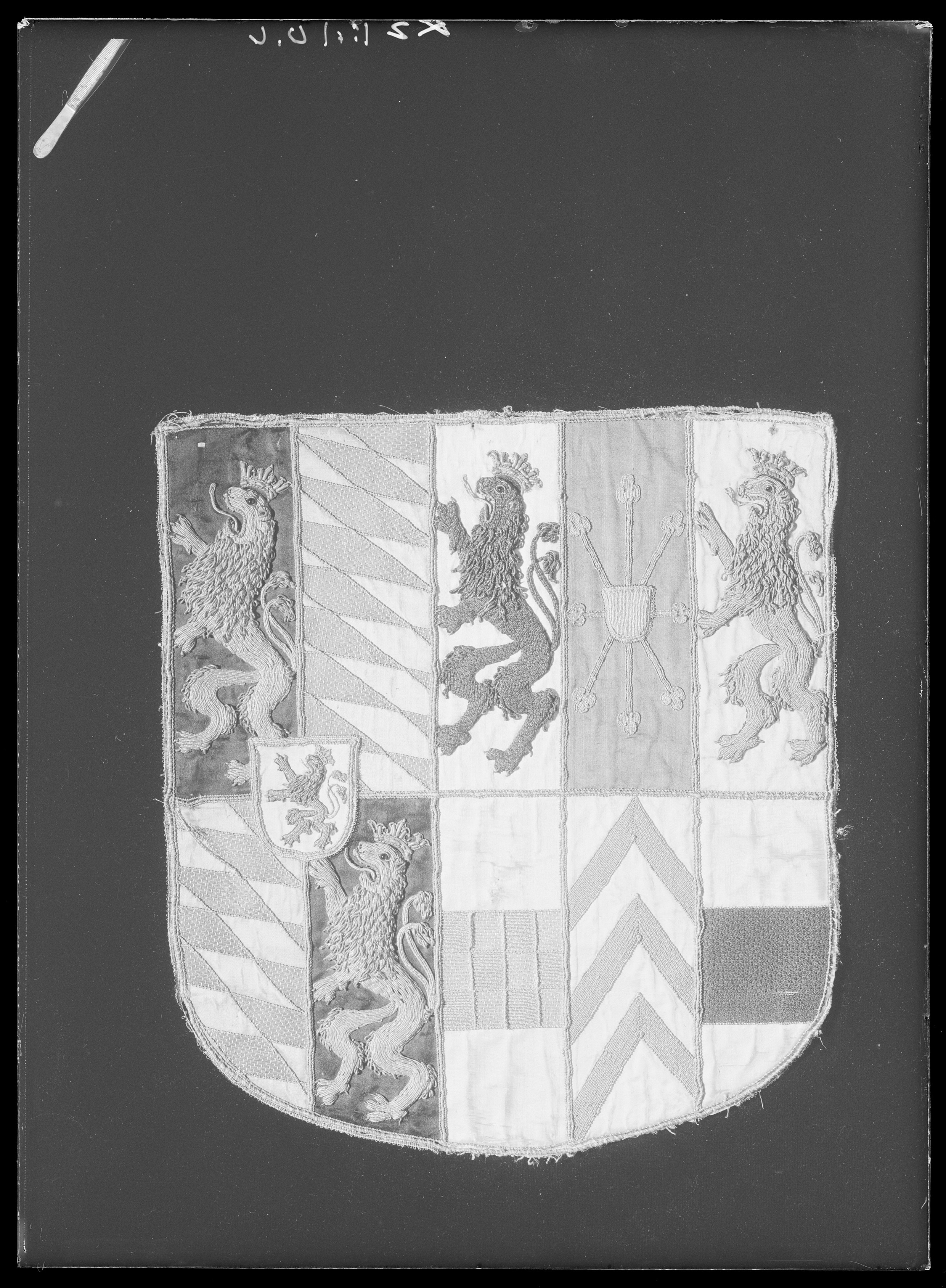 Delad sköld, fyra gånger kluven. Ruta 1, 2, 6 och 7 är kvadrerade för sig med pfalz lejon av förgylld tråd mot svart sidenatlas och Bayerns vapen, med ett snedrutat schackmönster av silvertråd mot blå sidenatlas. Därpå en hjärtsköld med Bergs vapen, ett lejon av blå silkestråd och silvertråd mot vit sidenatlas. Ruta 3, Gülichs vapen, med ett broderat lejon av svart silkestråd mot ljusgul sidenatlas. Ruta fyra är av röd sidenatlas med Cleves vapen, en sköld samt stiliserade liljestänglar av förgylld silvertråd mot röd sidenatlas. Ruta fem utgörs av Bergs vapen, ett lejon av gul silkestråd och förgylld silvertråd mot vit sidenatlas. Veldens vapen med en schackrutad balk i rött och silver mot gul sidenatlas, utgör ruta åtta. Ruta nio utgörs av Marks vapen, tre sparrar av brun silkestråd mot gul sidenatlas. Ruta tio utgörs av Ravensteins vapen, en balk broderad med svart silkestråd mot gul sidenatlas. Ruta tio utgörs av Rawenstein vapen, en bjälke av svart silkestråd mot ljusgul sidenatlas. Samtliga broderier är utförda i plattsöm samt med lejonens man och hårbeklädnader av krusad tråd. Detaljer är utförda med kantiljer och en svart pärla får tjäna lejonens ögon. Samtliga rutor kantas av tre smala snoddar av förgylld silvertråd. Skölden kantas runtom av en tjockare och en smalare snodd av förgylld silvertråd samt av vit silkestråd omvirad av silvertråd utdragen i små öglor. Vapnet kröns av en broderad grevekrona av förgylld silvertråd. Kronringen kantas liksom vapnet av en tjockare och en smalare snodd av förgylld silvertråd. På kronringen är broderat fem blommor med stenimitationer av silverlan omvirad av blå- respektive röd silkestråd, kantade av skruvade, förgyllda lan samt av kantilj. Mellan blommorna är broderat små prickar av kantilj av förgylld silvertråd. Kronspetsarna utgörs av fem stiliserade blad på vilka är broderat stenimitationer med blå silkestråd. Även dessa kantas av kantilj och skruvade lan samt av små prickar av kantiljer av förgylld tråd. Mellan kronspetsarna är utfyllt med svart silkestråd. Vapnet är fodrat med beige linnelärft samt med ljus makulatur.