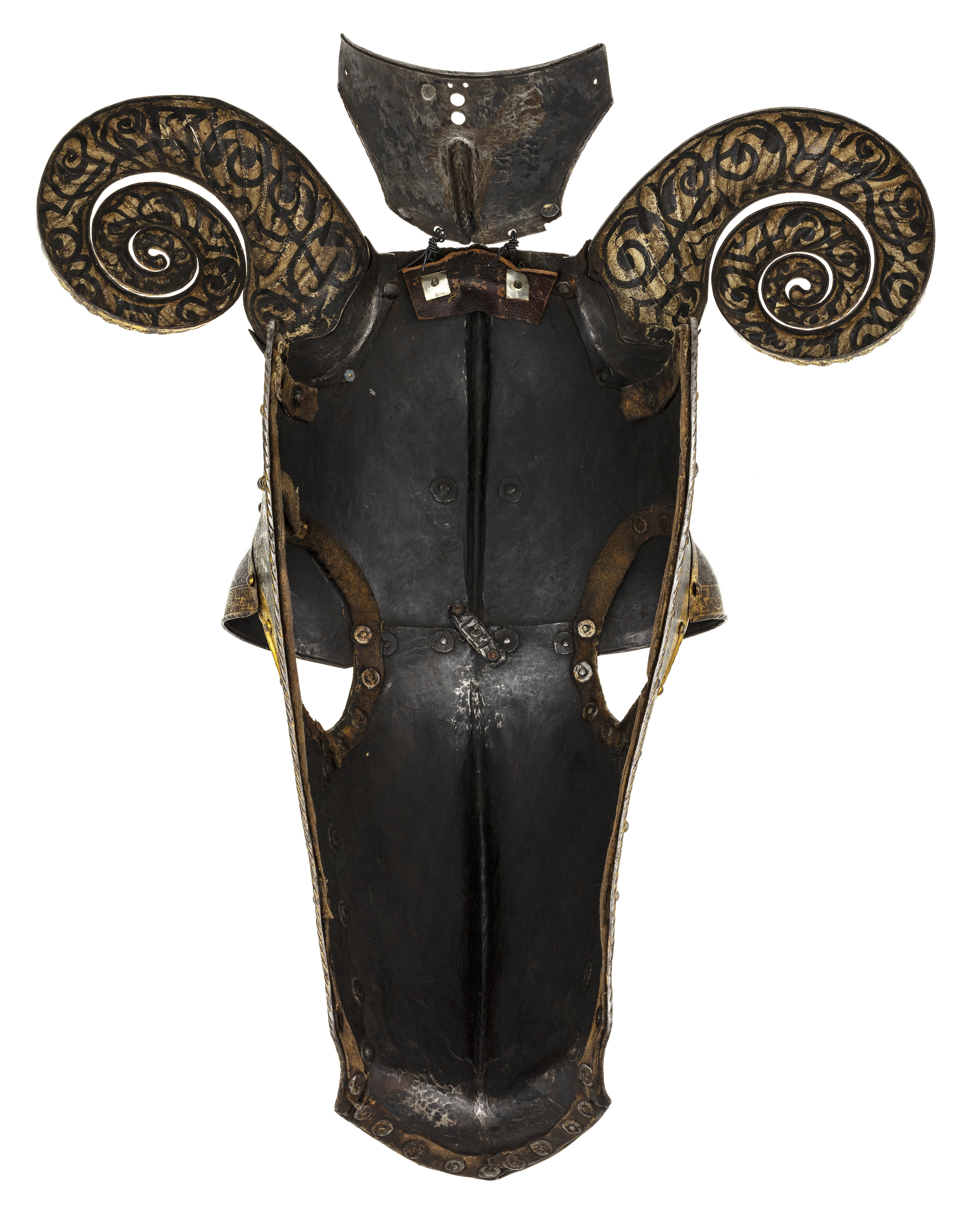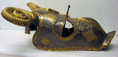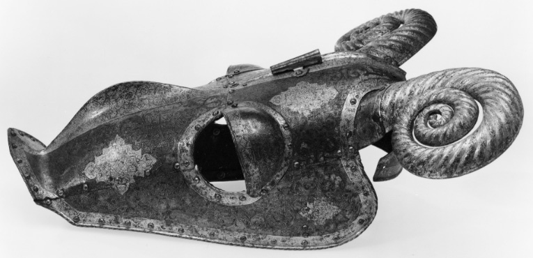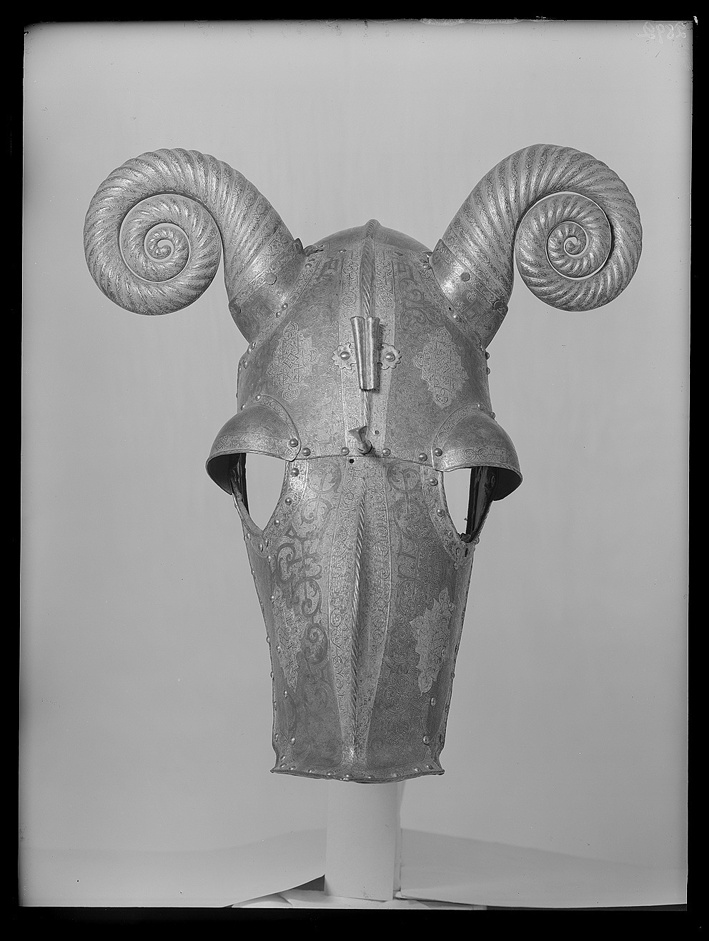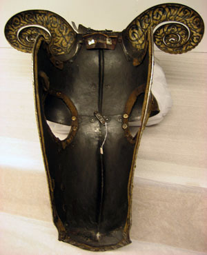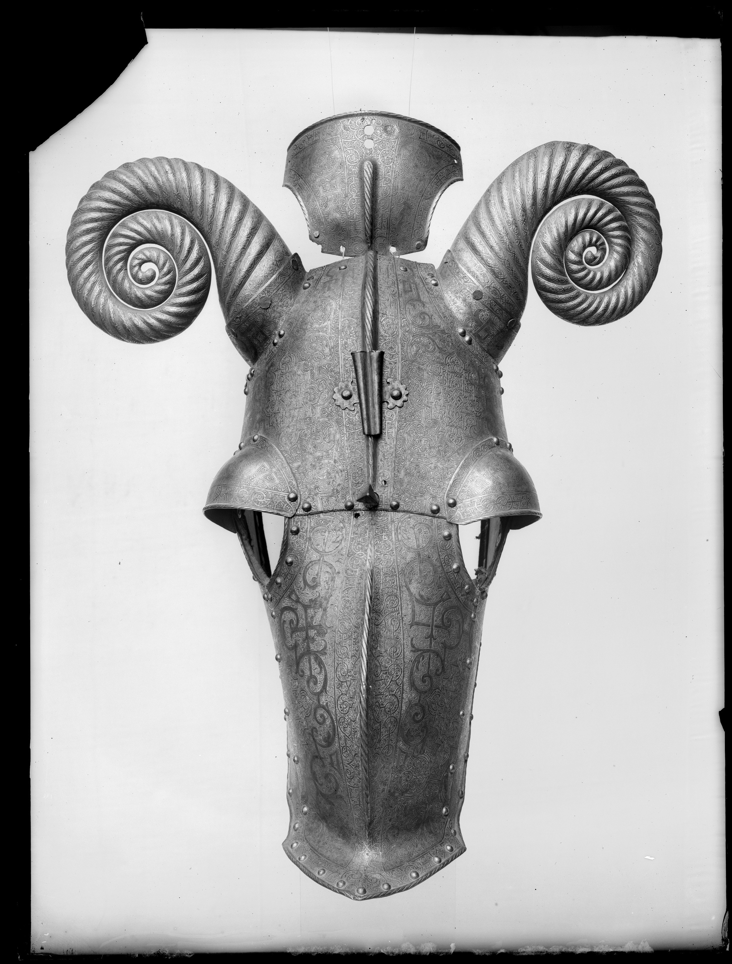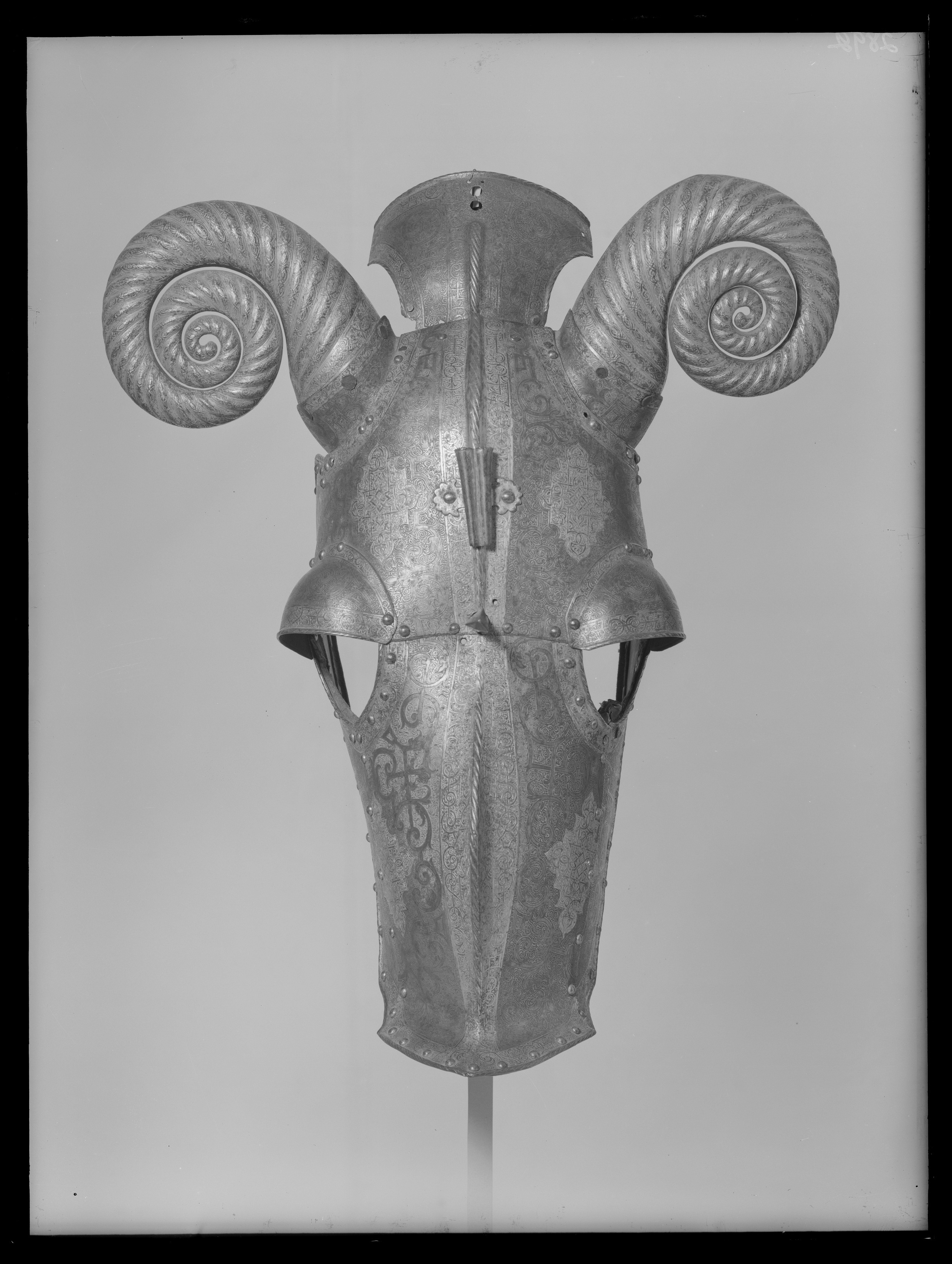 Driven stålplåt med på utsidan etsad och kallemaljerad dekor. Sammanlagt 11 delar, sammanfogade med nitar. Övre del, över pannan, av välvd plåt med sluttande sidor, driven nedåt avsmalnande mittås, h 9 mm. Rundade urtagningar för ögonen och över dessa välvd skena med rundade kanter, inre kant vinklad och nitad. Rundade urtagningar för öronen med på undersidan nitad skena, välvd och vinklad uppåt, h 45 mm. I denna ytterligare en nitad skena, välvd med öppen baksida och formad som ett gumshorn med uppdrivna vridna räfflor. H ca 220 mm. Upptill rak kant med vidhängande nackplåt. Denna väld med raka kanter och i främre sidorna rundade urtagningar. I bakre kant två cirkulära hål, diam 8 mm. Framtill driven avsmalnande mittås. Vid pannan över mittåsen en plymhållare, h 80 mm. Ur ett stycke drivet två rörformiga nedåt avsmalnande hylsor. Övre kanterna tandade. Åt sidorna två rundade, blomformiga vingar. Nedanför plymhållaren ett platt part med i mtten en spets. Cirkulärt tvärsnitt, uppåt avsmalnande och avslutad med triangulär spets, tot h 80 mm. Nedre del, över mulen, välvd med sluttande sidor, nedåt avsmalnande med driven mittås och främre kant mjukt vinklad uppåt till en krage, b 50 mm, med spetsigt mittparti. Rundade urtagningar för ögonen som tillsammans med övre plåten bildar runda hål. Sammanfogad med övre plåten i tvärgående nitad söm. Insidan svärtad med kantband av läder. Hornen målade med svart mönster mot vit bakgrund. På vänster sida vid kinden ett dubbelvikt läderband. Kanterna omvikta, rundsmidda och repstavsfilade. Runt kanterna en etsad och förgylld bård. Nitar i rad längs kanterna och längs plåtarnas skarvar.