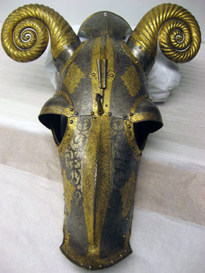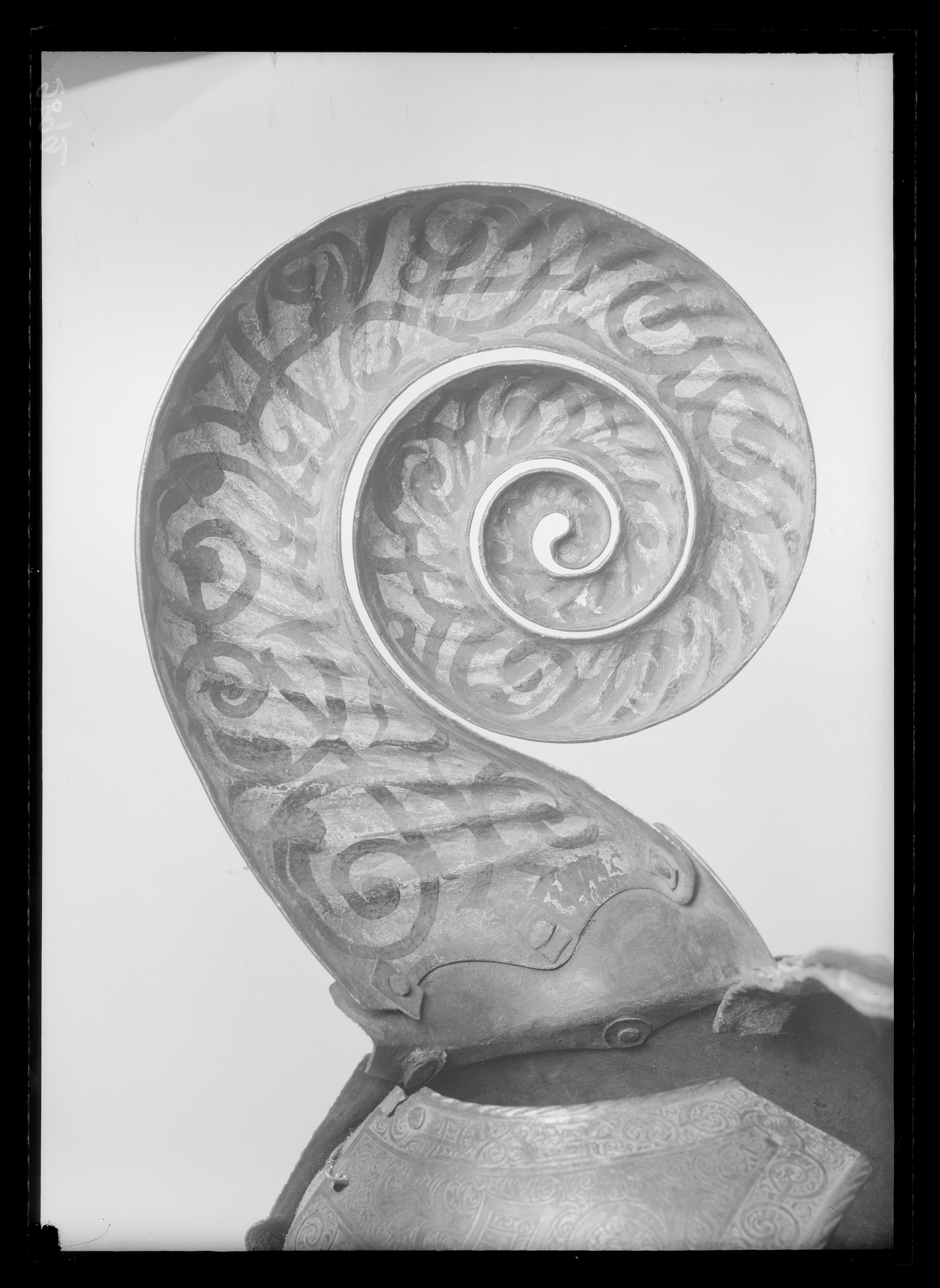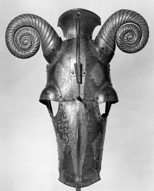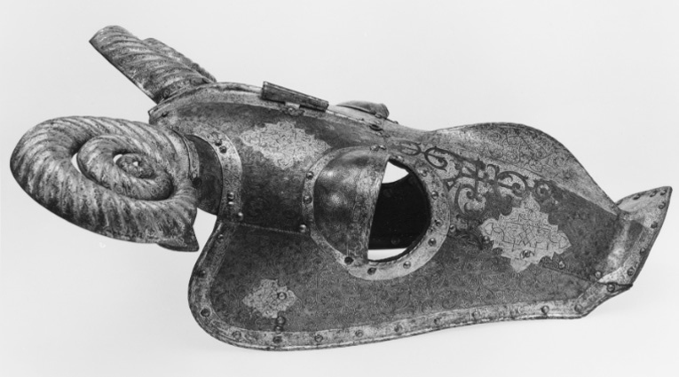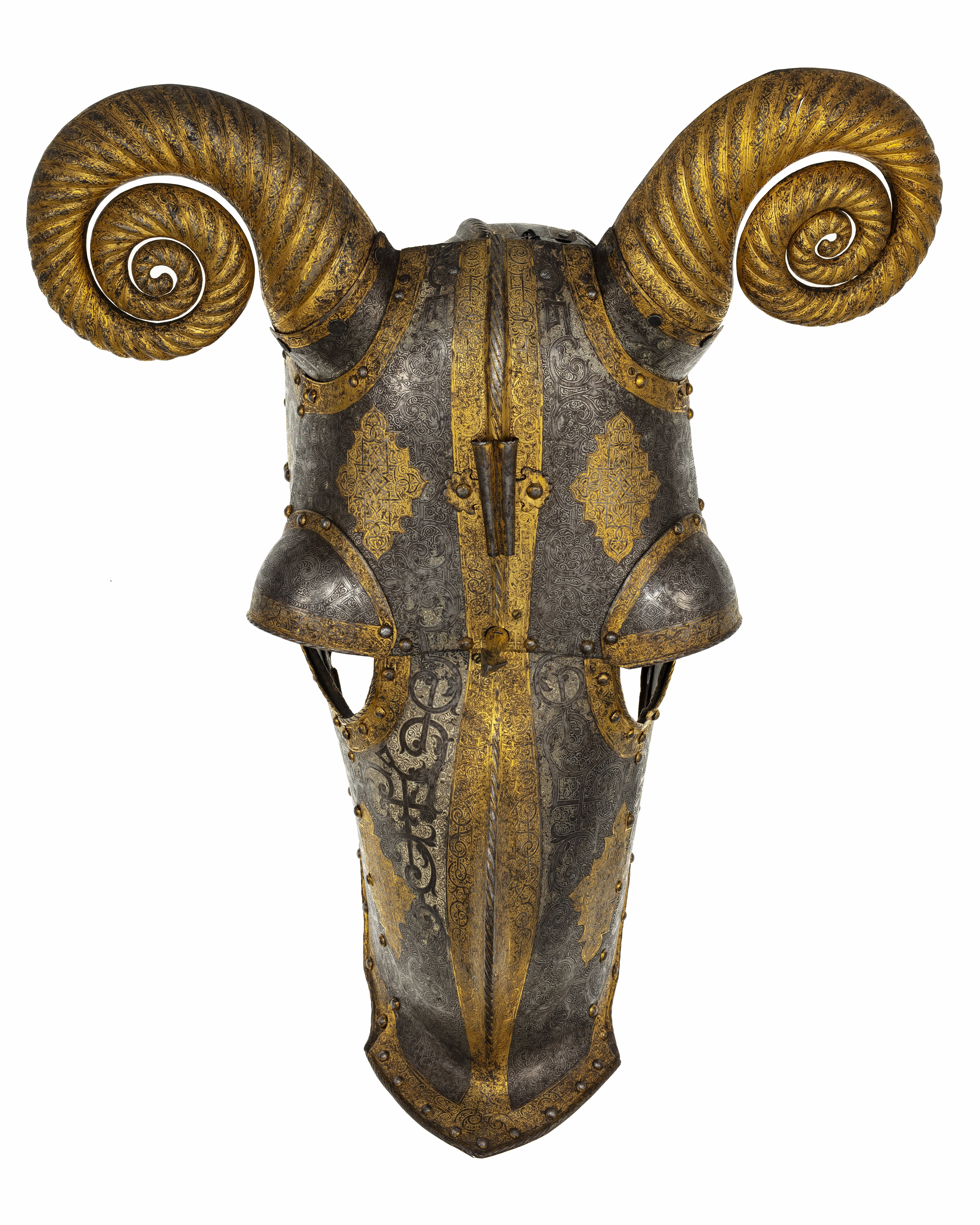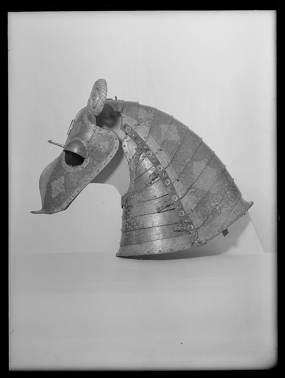 Driven stålplåt med på utsidan etsad och kallemaljerad dekor. Sammanlagt 11 delar, sammanfogade med nitar. Övre del, över pannan, av välvd plåt med sluttande sidor, driven nedåt avsmalnande mittås, h 9 mm. Rundade urtagningar för ögonen och över dessa välvd skena med rundade kanter, inre kant vinklad och nitad. Rundade urtagningar för öronen med på undersidan nitad skena, välvd och vinklad uppåt, h 45 mm. I denna ytterligare en nitad skena, välvd med öppen baksida och formad som ett gumshorn med uppdrivna vridna räfflor. H ca 220 mm. Upptill rak kant med vidhängande nackplåt. Denna väld med raka kanter och i främre sidorna rundade urtagningar. I bakre kant två cirkulära hål, diam 8 mm. Framtill driven avsmalnande mittås. Vid pannan över mittåsen en plymhållare, h 80 mm. Ur ett stycke drivet två rörformiga nedåt avsmalnande hylsor. Övre kanterna tandade. Åt sidorna två rundade, blomformiga vingar. Nedanför plymhållaren ett platt part med i mtten en spets. Cirkulärt tvärsnitt, uppåt avsmalnande och avslutad med triangulär spets, tot h 80 mm. Nedre del, över mulen, välvd med sluttande sidor, nedåt avsmalnande med driven mittås och främre kant mjukt vinklad uppåt till en krage, b 50 mm, med spetsigt mittparti. Rundade urtagningar för ögonen som tillsammans med övre plåten bildar runda hål. Sammanfogad med övre plåten i tvärgående nitad söm. Insidan svärtad med kantband av läder. Hornen målade med svart mönster mot vit bakgrund. På vänster sida vid kinden ett dubbelvikt läderband. Kanterna omvikta, rundsmidda och repstavsfilade. Runt kanterna en etsad och förgylld bård. Nitar i rad längs kanterna och längs plåtarnas skarvar.