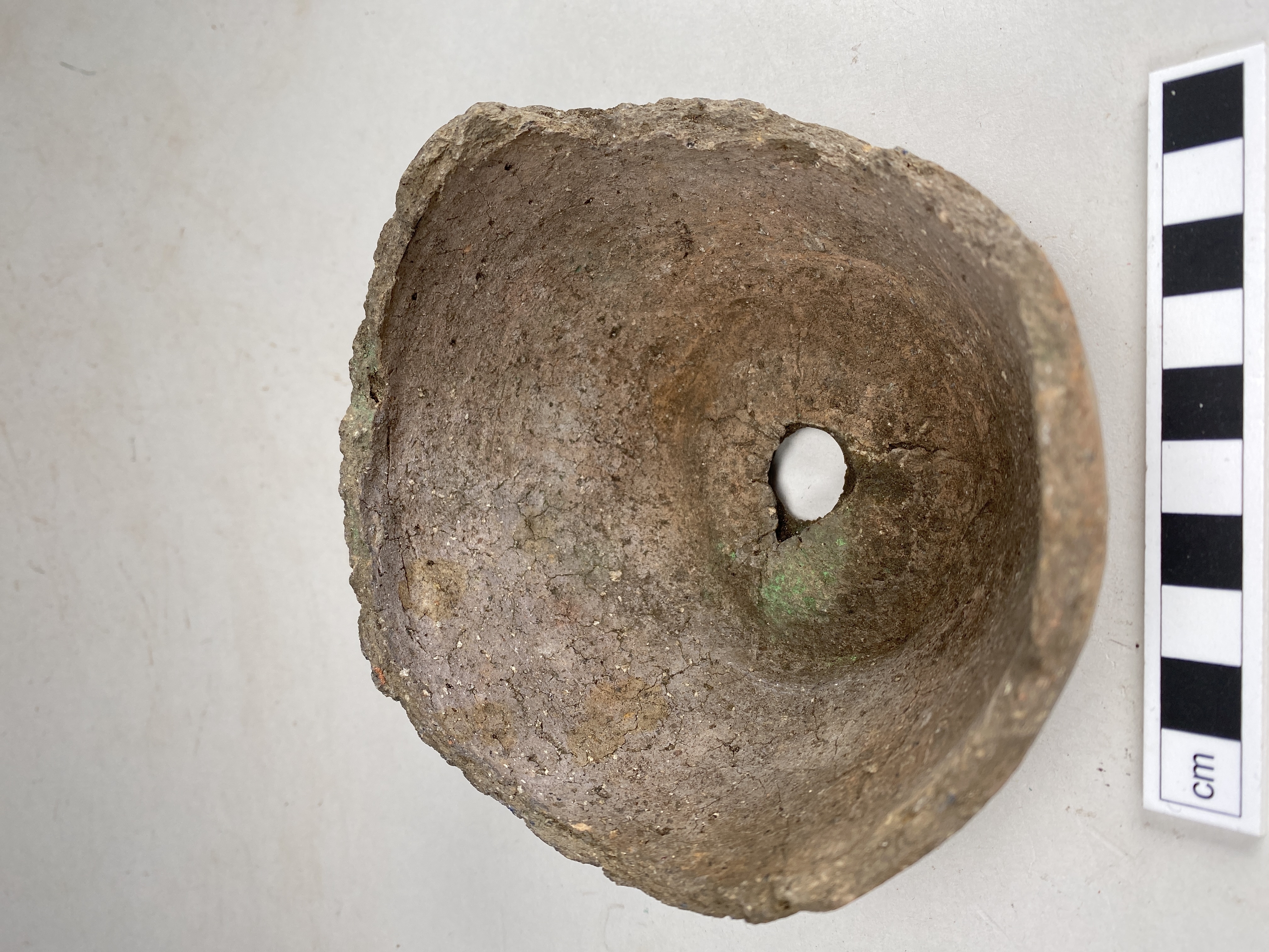 En så kallad fönsterurna med hål i botten för en glasbit. Glasbiten är förkommen. Hålet är rundat ca 17 mm diameter och har fasade kanter för glasbiten. Oxiderat bränd, delvis lätt sintrat gods. Sekundärbränt? Bergartsmagring. grov yta. Odekorerat. Bevarat upp till skuldran. Hals och mynning saknas