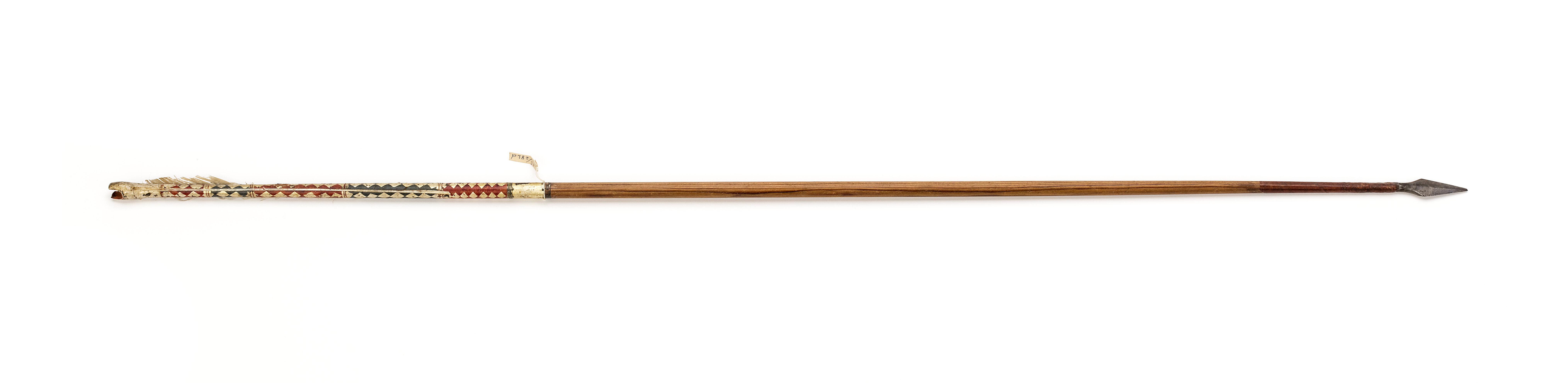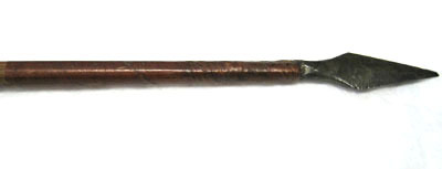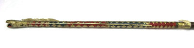Skaft av obehandlad furu, framåt avsmalnande med cirkulärt tvärsnitt. Framtill spets av mörkt stål, l 44 mm, rombisk, dubbeleggad och med tånge. Inslagen i skaftet med lindning av ljusbrun näver? 82 mm upp på skaftet. Pilens bakre 270 mm målade i sex fält, silver, röd och blå med röda och silverfärgade romber i rader. Rester av vita styrfjädrar. Silverfärgad bredare ände med rödmålad urtagning för strängen.