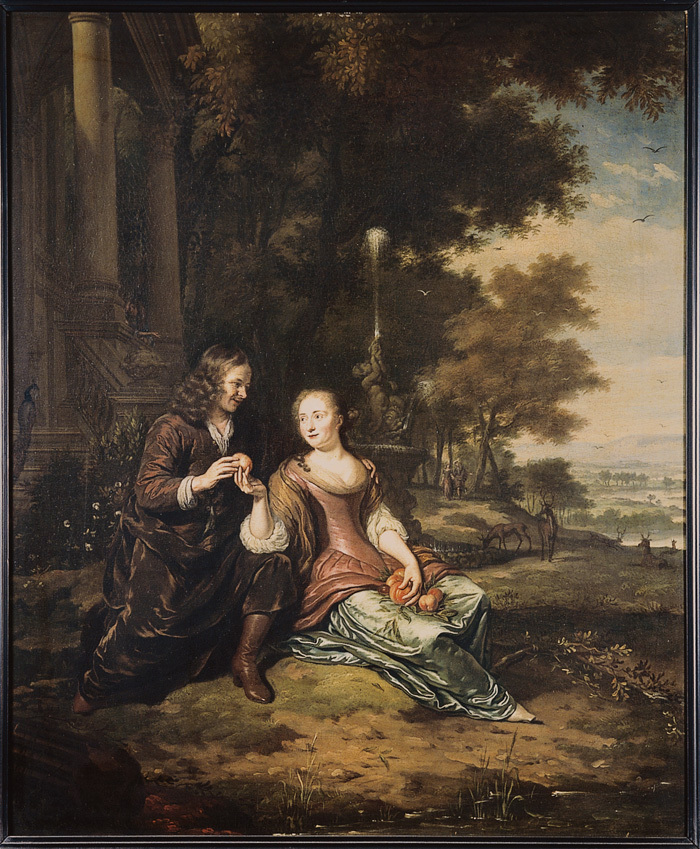 Detta unga par, nyligen trolovade eller gifta, är avbildat i en park. Parken tillhör ett imponerade lantgods med ett hjorthägn och erbjuder en vidsträckt vy över de lantliga omgivningarna. Ett typiskt porträtt av Michiel van Musscher med en lättsam ton och elegant färghållning. Landskapet kan eventuellt vara utfört av en annan kostnär. -*- This portrait of a young couple, recently betrothed or married, is set in the grounds of an imposing country house with a deer park and extensive views across the surrounding countryside. With its lightness of touch and elegant colouring, this is typical of Michiel van Musscher's portraits. The landscape may possibly be the work of a different artist. Kommentarer från forskare Dr. Phil.Robert Gerhard, Pennsylvania USA. (skriver katalog om van Musscher 2012) 2It is of a rather uncommon large size, 78 x 64.6 cm for Van Musscher; most of his works being smaller. Second, the background does not appear to be of his exacting detail. Amd it is certainly non-Nederlandisch. Particularly, some of the deer are anatomically disproportioned. I do note that the catalogue does mention that “The landscape may possibly be the work of a different artist.” The signature remnants do appear to be entirely consistent with his early, somewhat printed script. For the date, I have trouble deciding on the last digit - ? 5, 7, or 9. Since the early auction catalogues and museum catalogues state it is a “9,” I would not argue. The third digit clearly is a “7.” Michiel married his first wife Eva Visscher in August 1678, and it is tempting to suggest that your painting is a betrothal portrait. I think there is a slight resemblance of the woman to other portraits by Van Musscher of Eva, but several colleagues do not agree. In any event, the male does not resemble Van Musscher so I do not think we can advance the identities of the couple any further. All in all, I think it is an authentic, fairly early Van Musscher, albeit with an unusual depiction (for him).