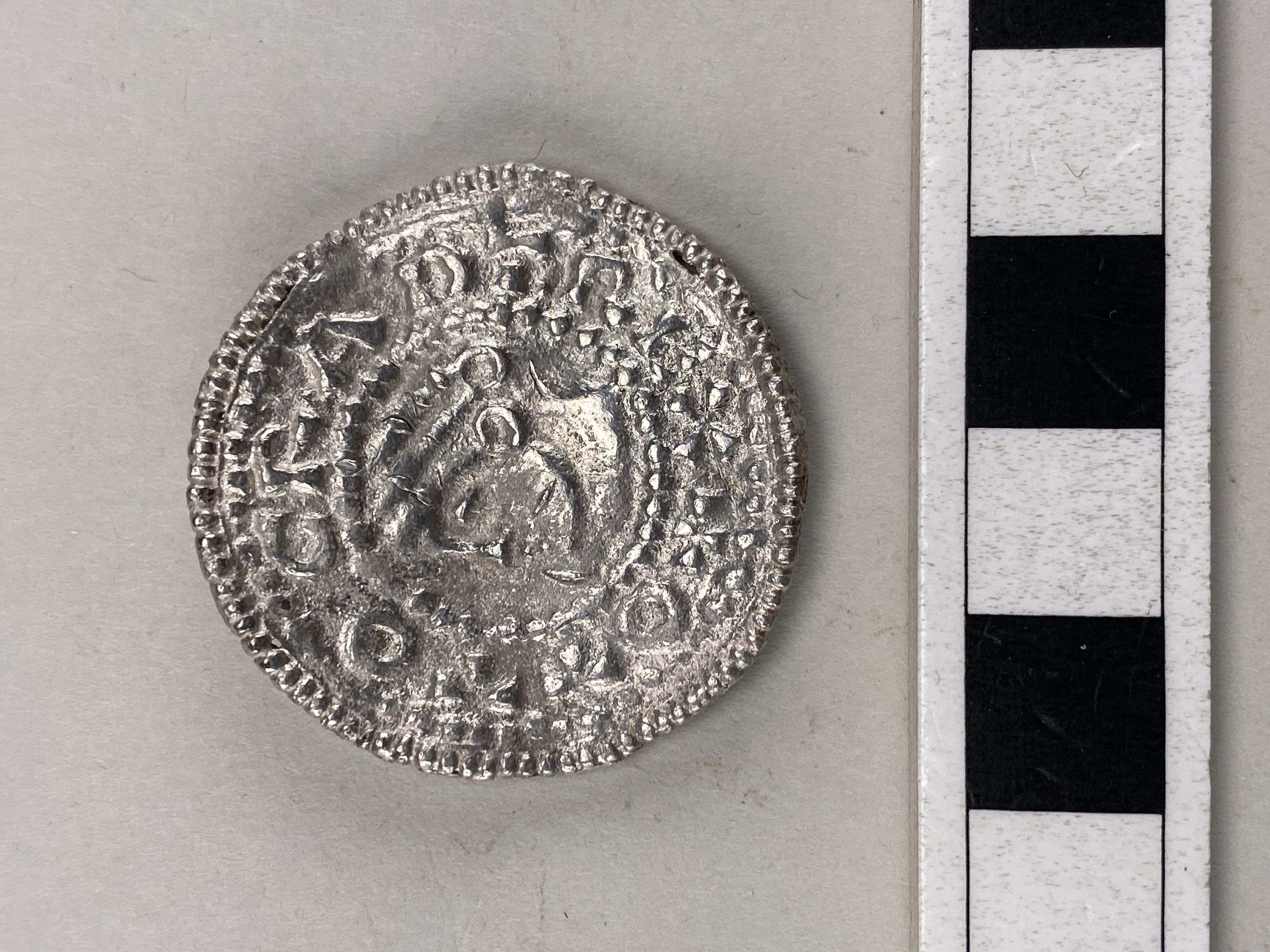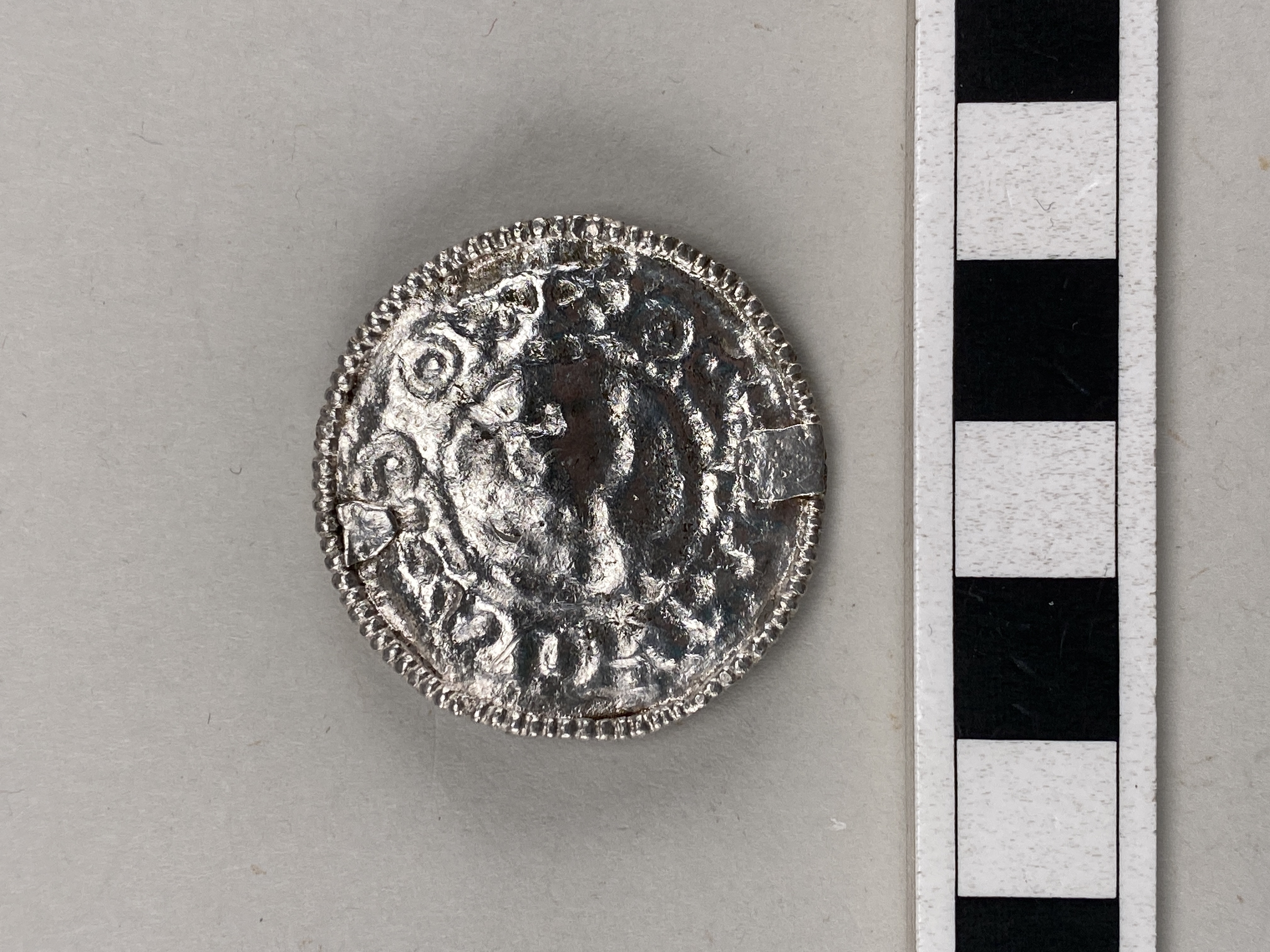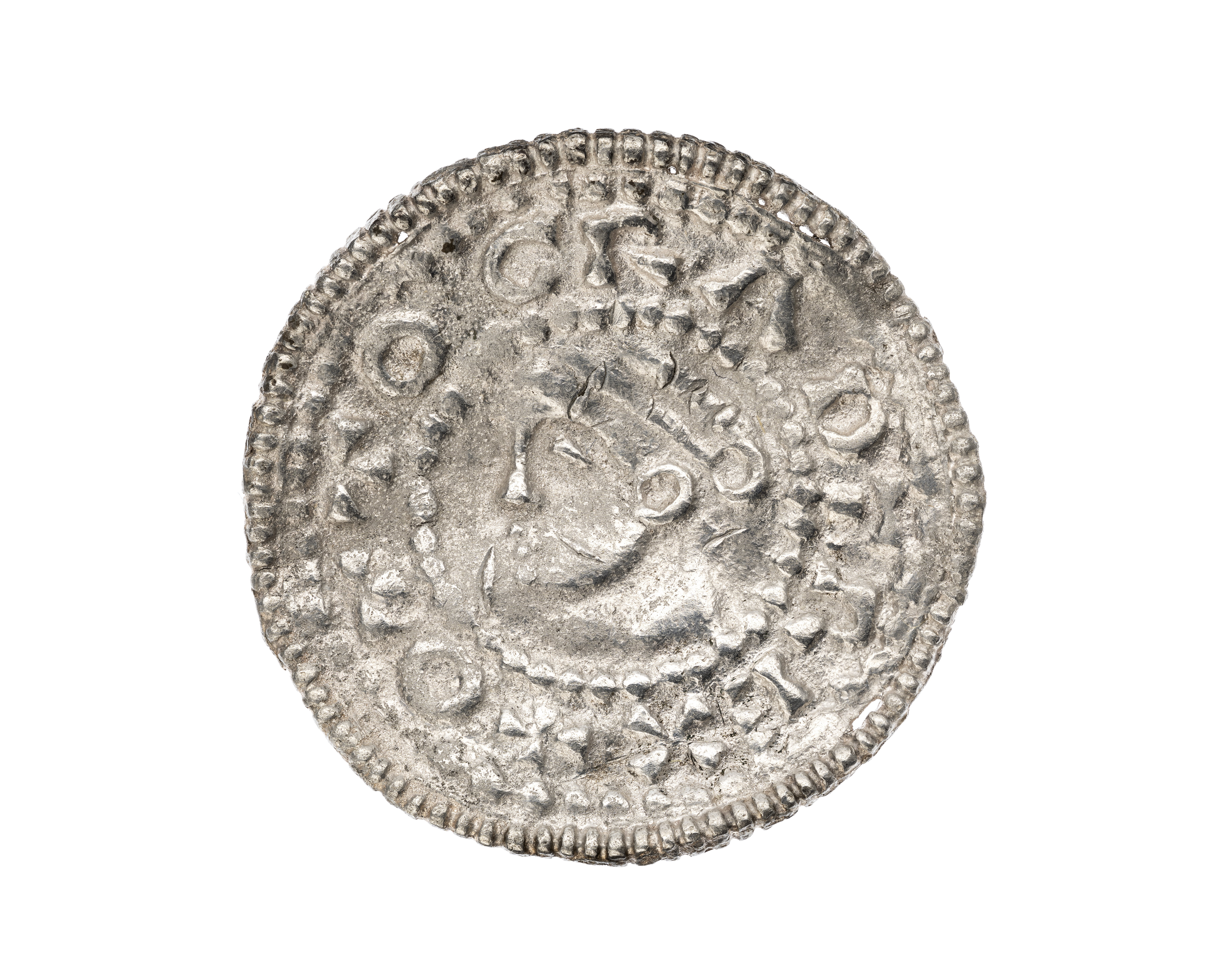 Smyckebrakteat, Otto III. Åtsida: porträtt inom pärlbård, därutanför text och kors inom en yttre pärlbård bestående av ett pålött strierat band. Frånsida: den yttre pärlbården/strierade bandet löper runt ytterkant. Två beslag i linje med huvudets hals och hjässa på baksidan (för upphäng- ning/montering?). Flera proberingsmärken på ansiktets framsida.