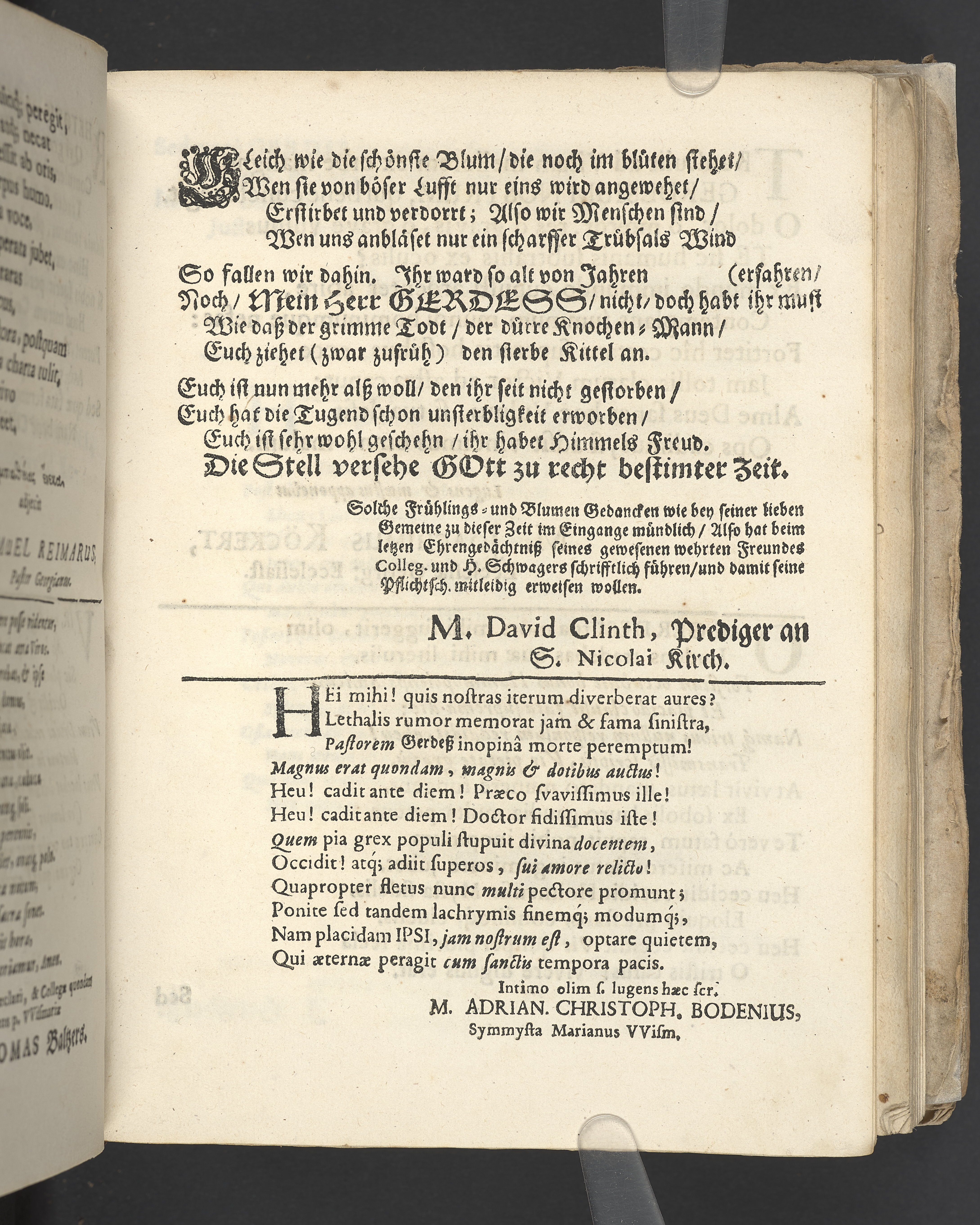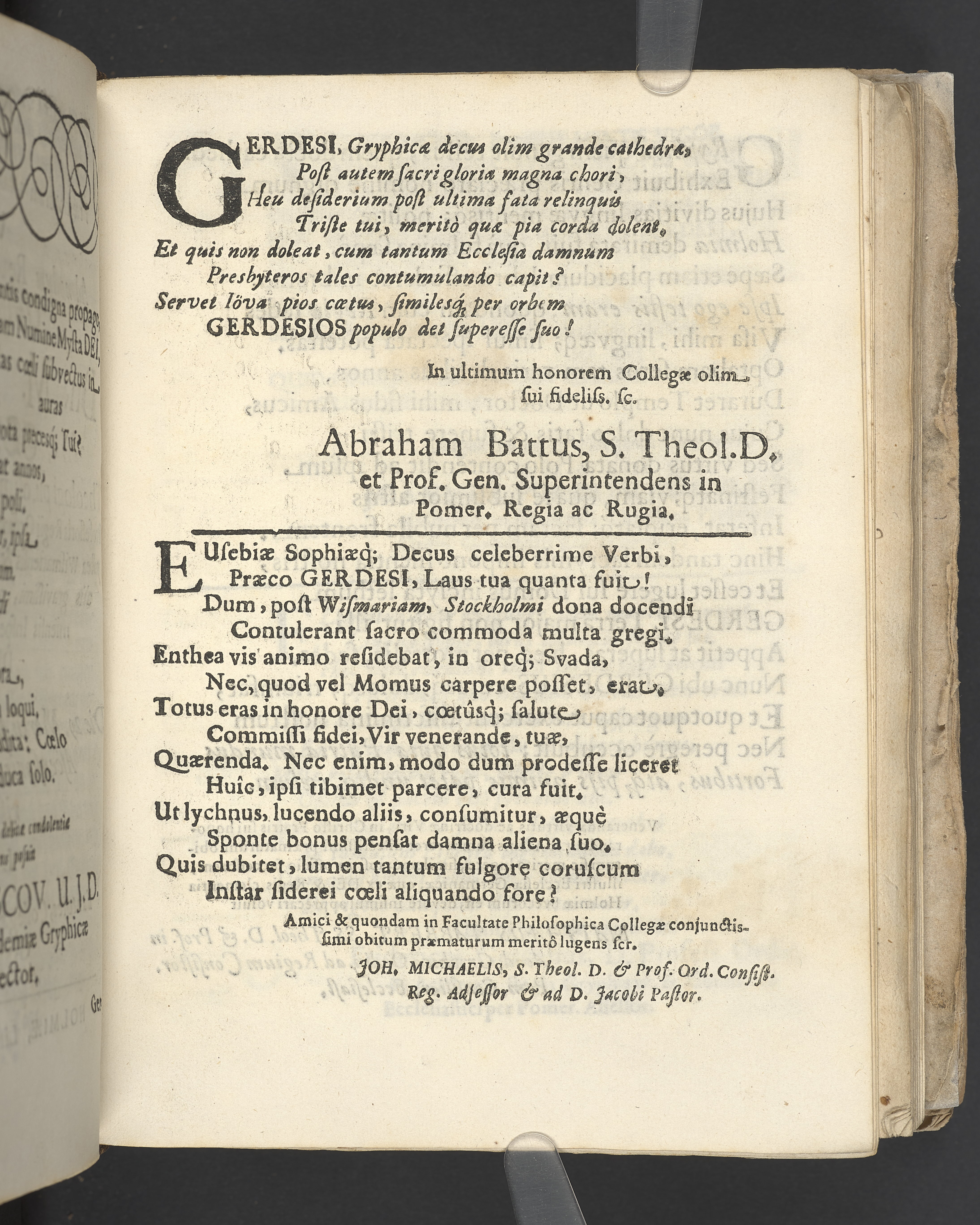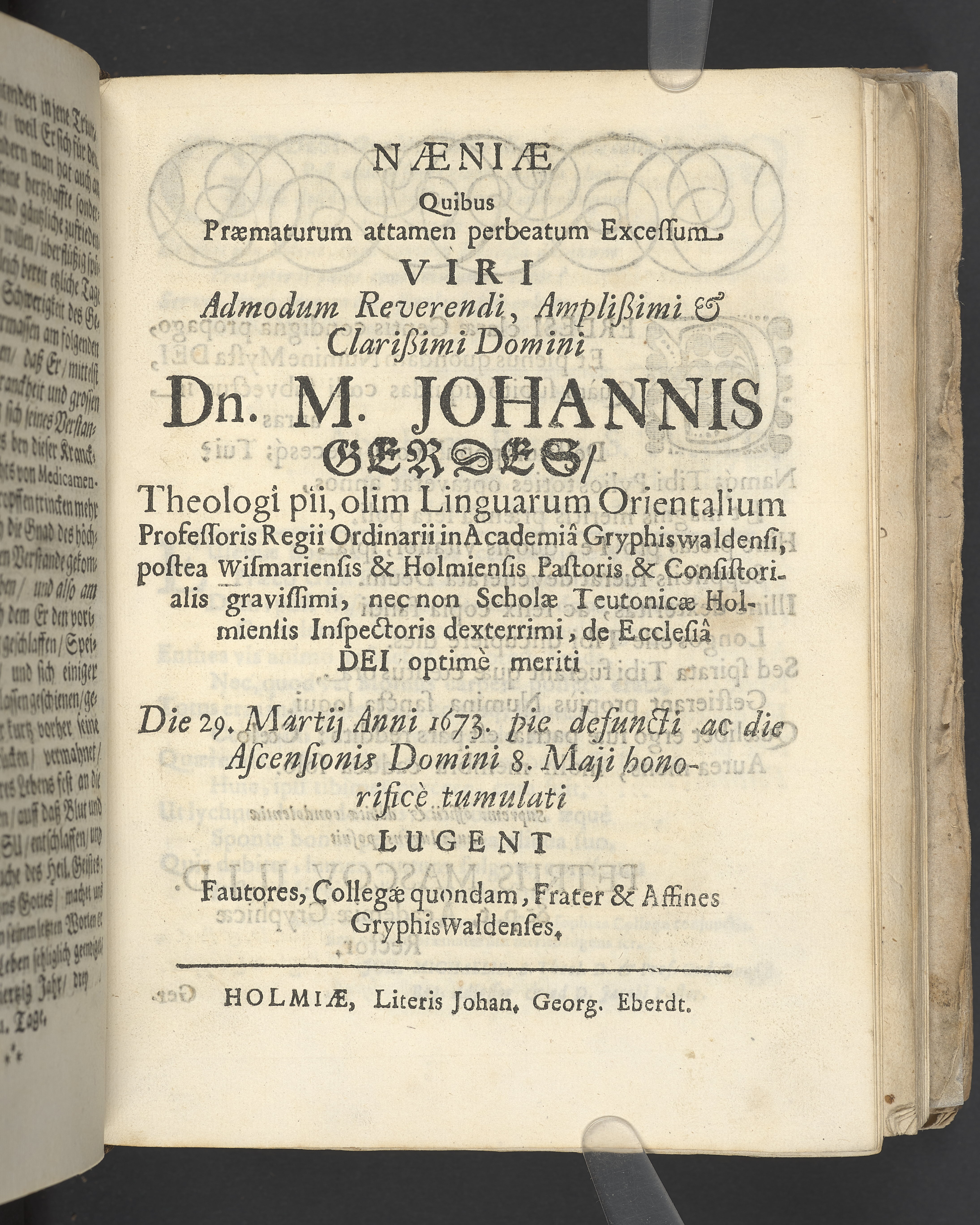 Naenie quibus praematurum attamen perbeatum excessum. Viri admodum reverendi, amplissimi & clarissimi domini Dn. M. Johannis Gerdes/ theologi pii, olim linguarum orientalium professoris regii ordinarii in academia Gryphiswaldensi, postea Wismariensis & Holmiensis pastoris & consistorialis gravissimi, nec non scholae teutonicae Holmiensis inspectoris dexterrimi, de ecclesia dei optime meriti, die 29. martij anni 1673. pie defuncti ac die ascensionis domini 8. maji honorifice tumulati. Lugent fautores, collegae quondam, frater & affines Gryphiswaldenses.
