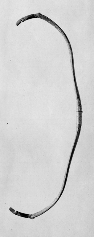 Sammansatt båge, rygg och buk av horn. Sidorna med ryggen överklädd med näver delvis förgylld och delvis målad med röd färg. Handtag med ovalt träsnitt. Vid bukens ytterändar ovala plattor av ljust horn, därutanför ett parti lindat med senor.