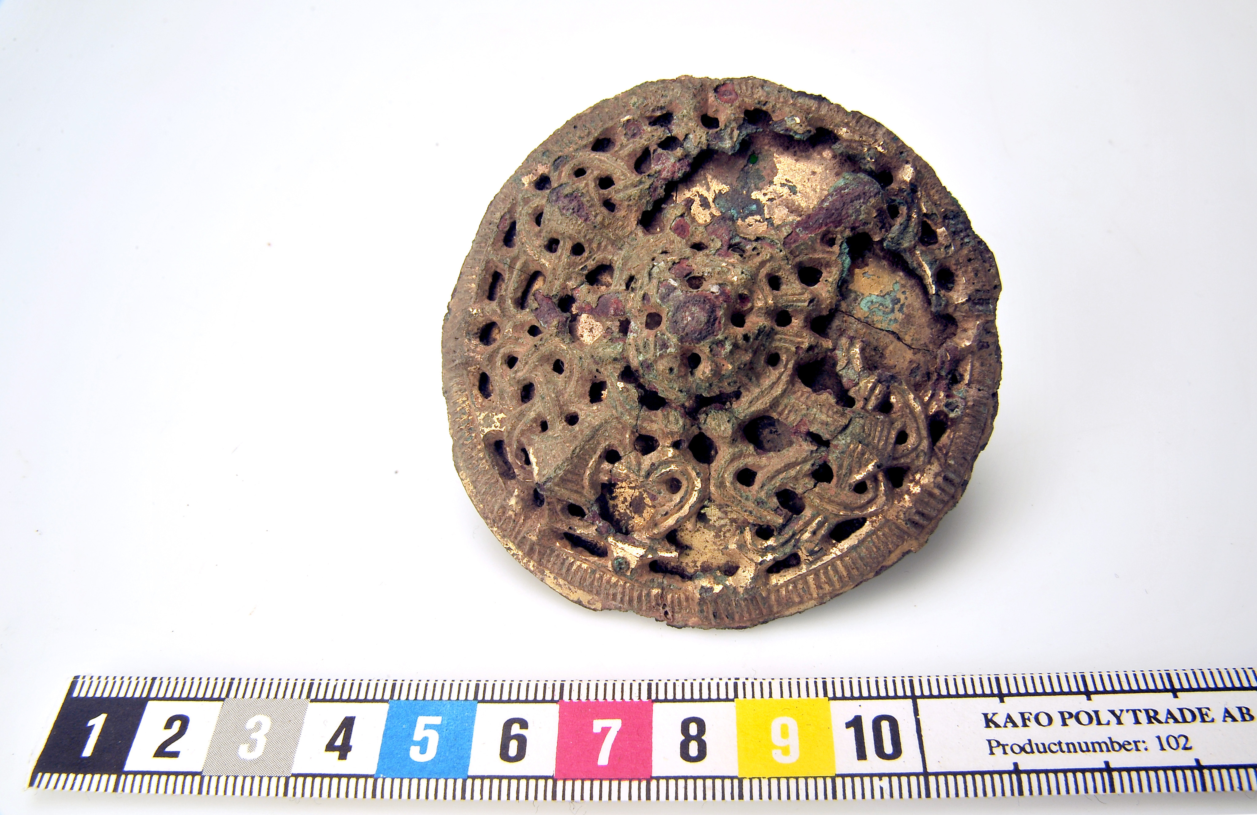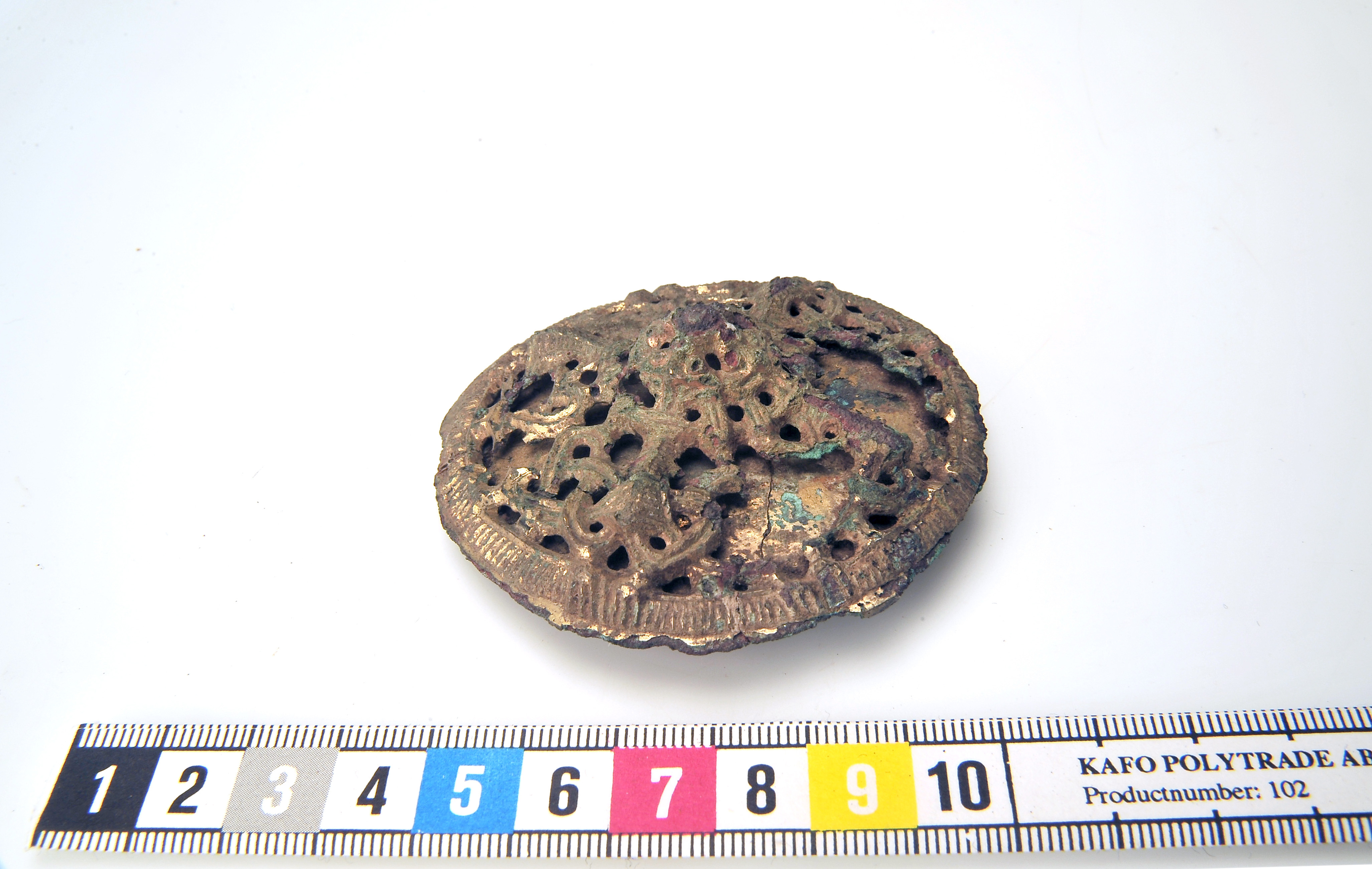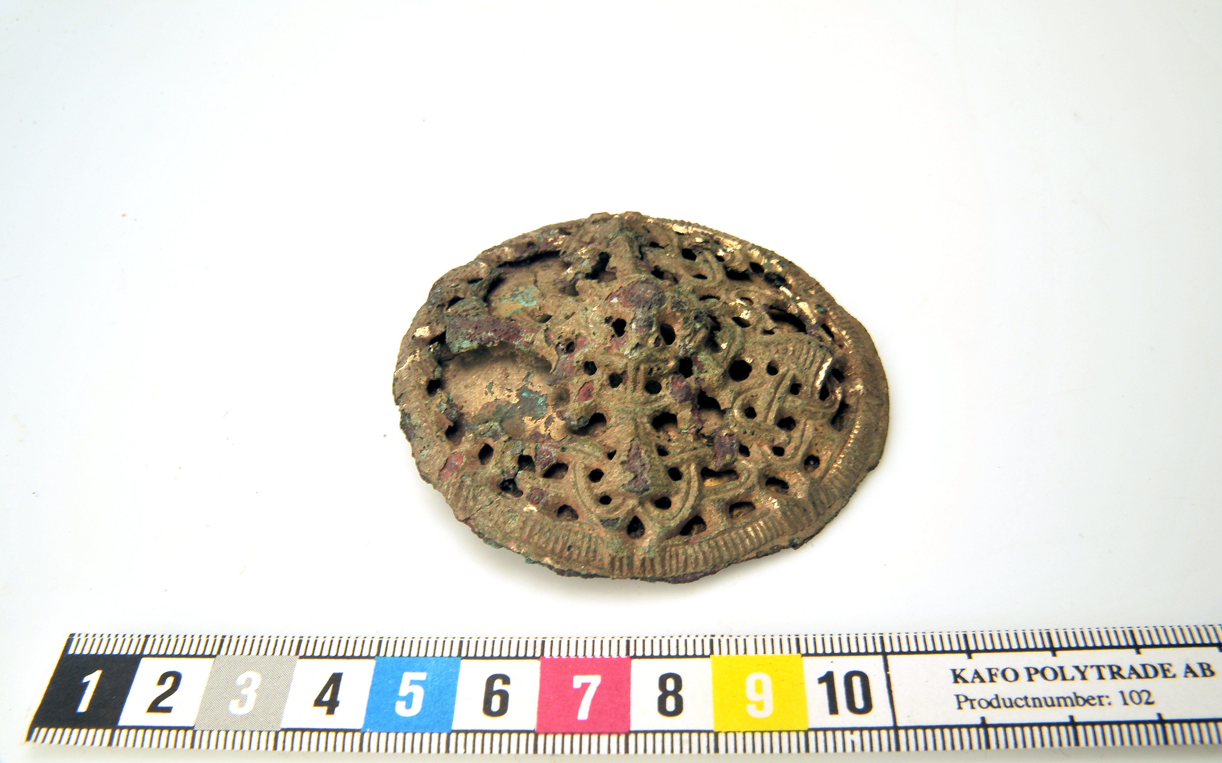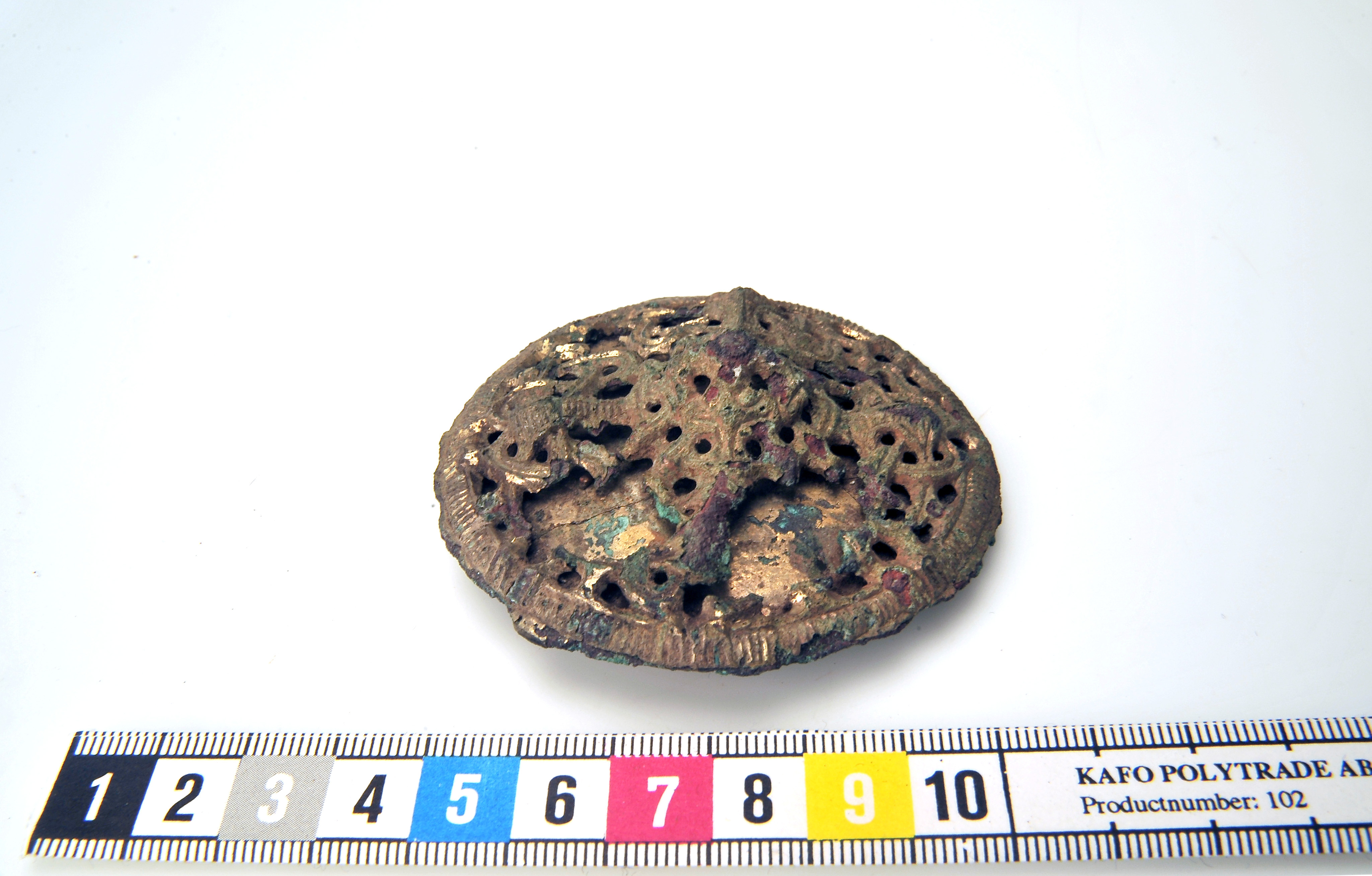 Förgyllt, dubbelskaligt bronsspänne med rester av järnnål. På den senare finns textilrester.