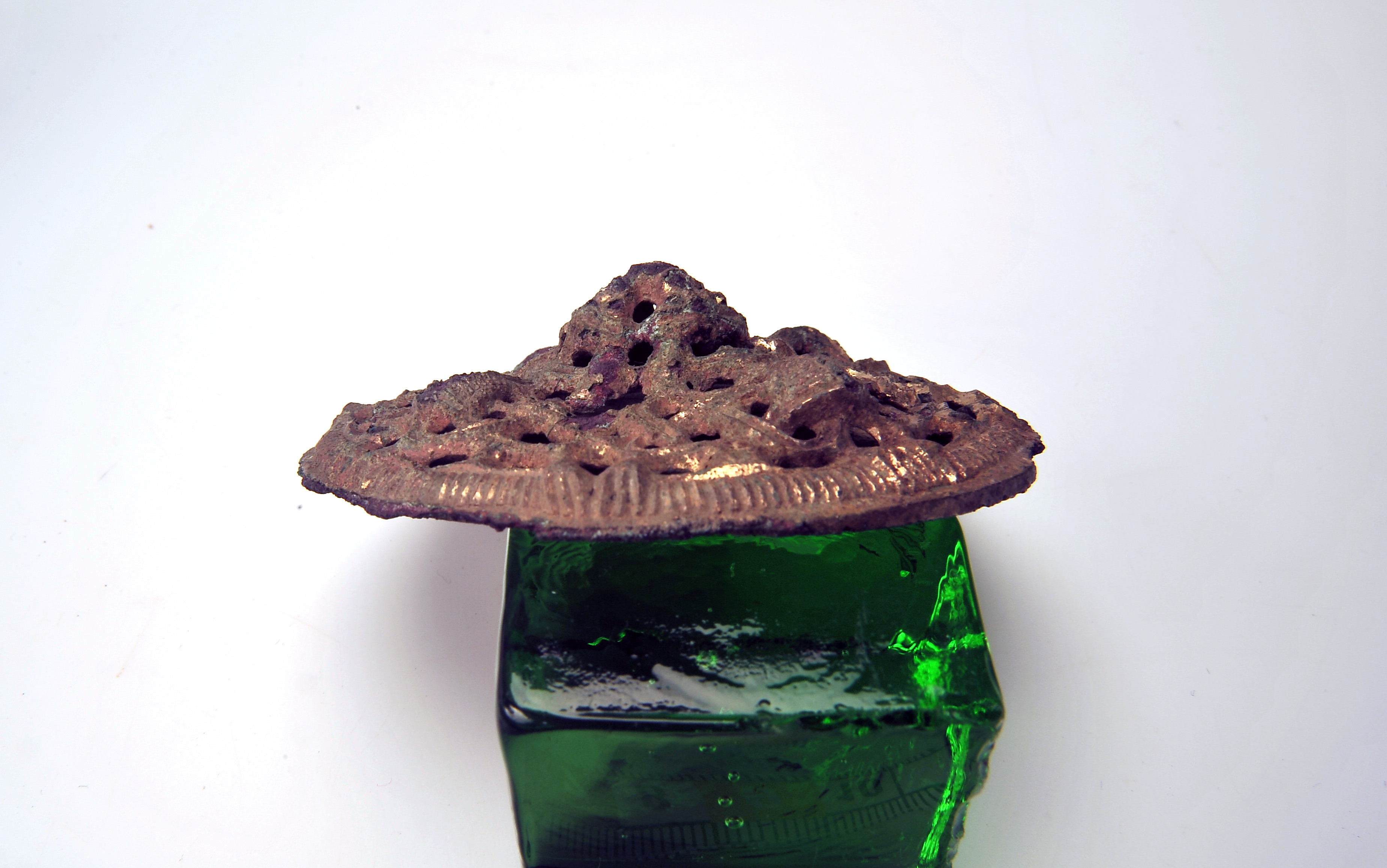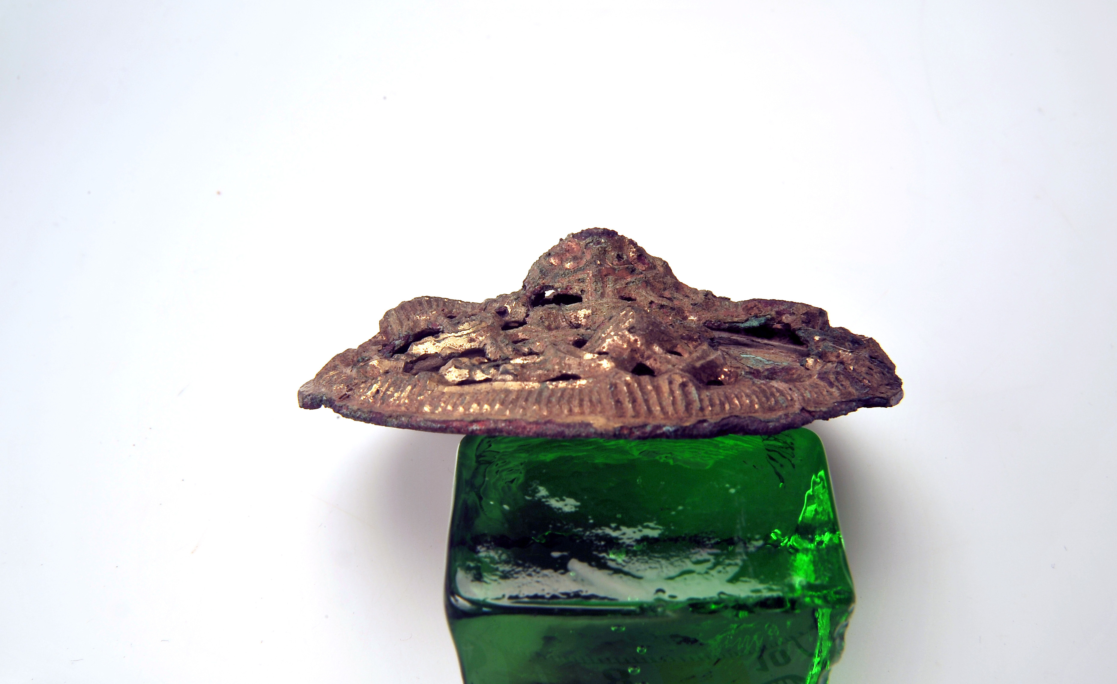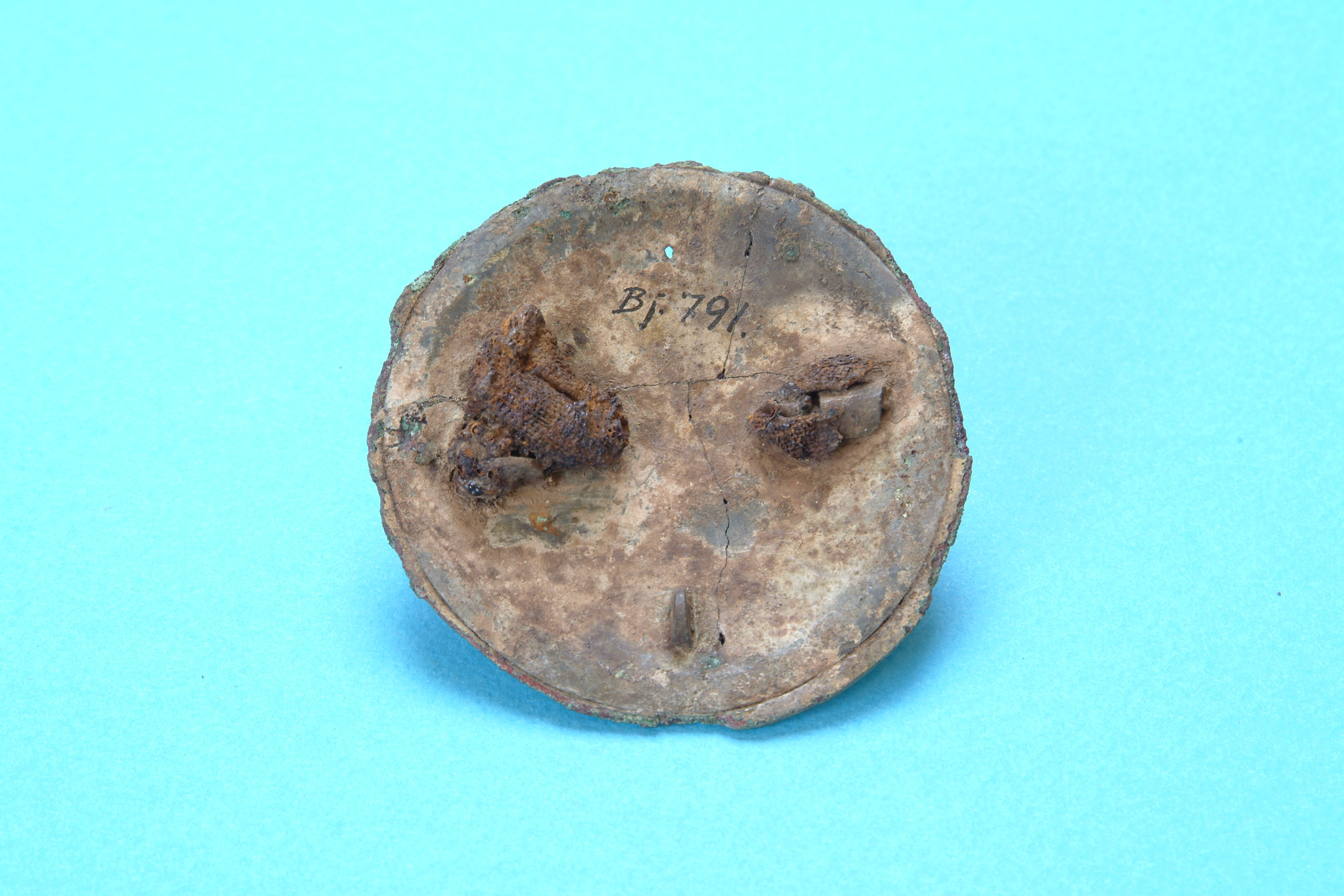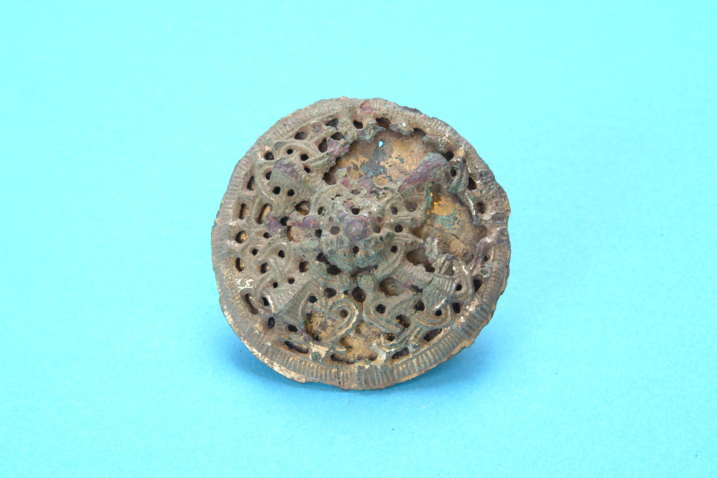 Förgyllt, dubbelskaligt bronsspänne med rester av järnnål. På den senare finns textilrester.
