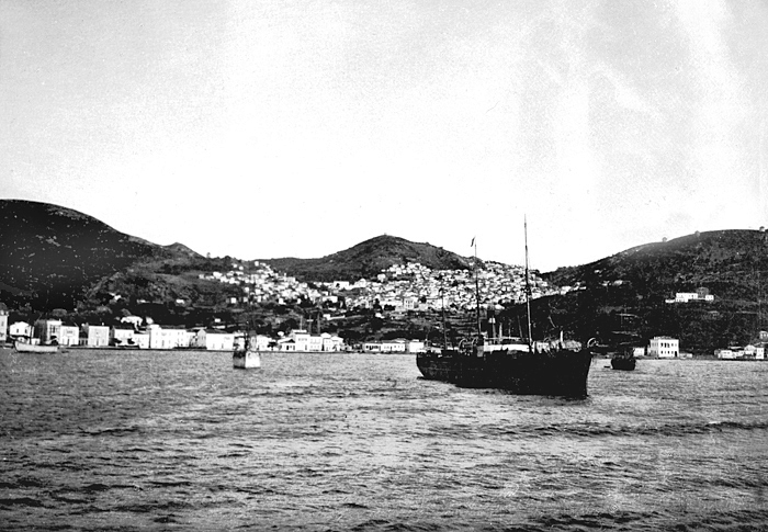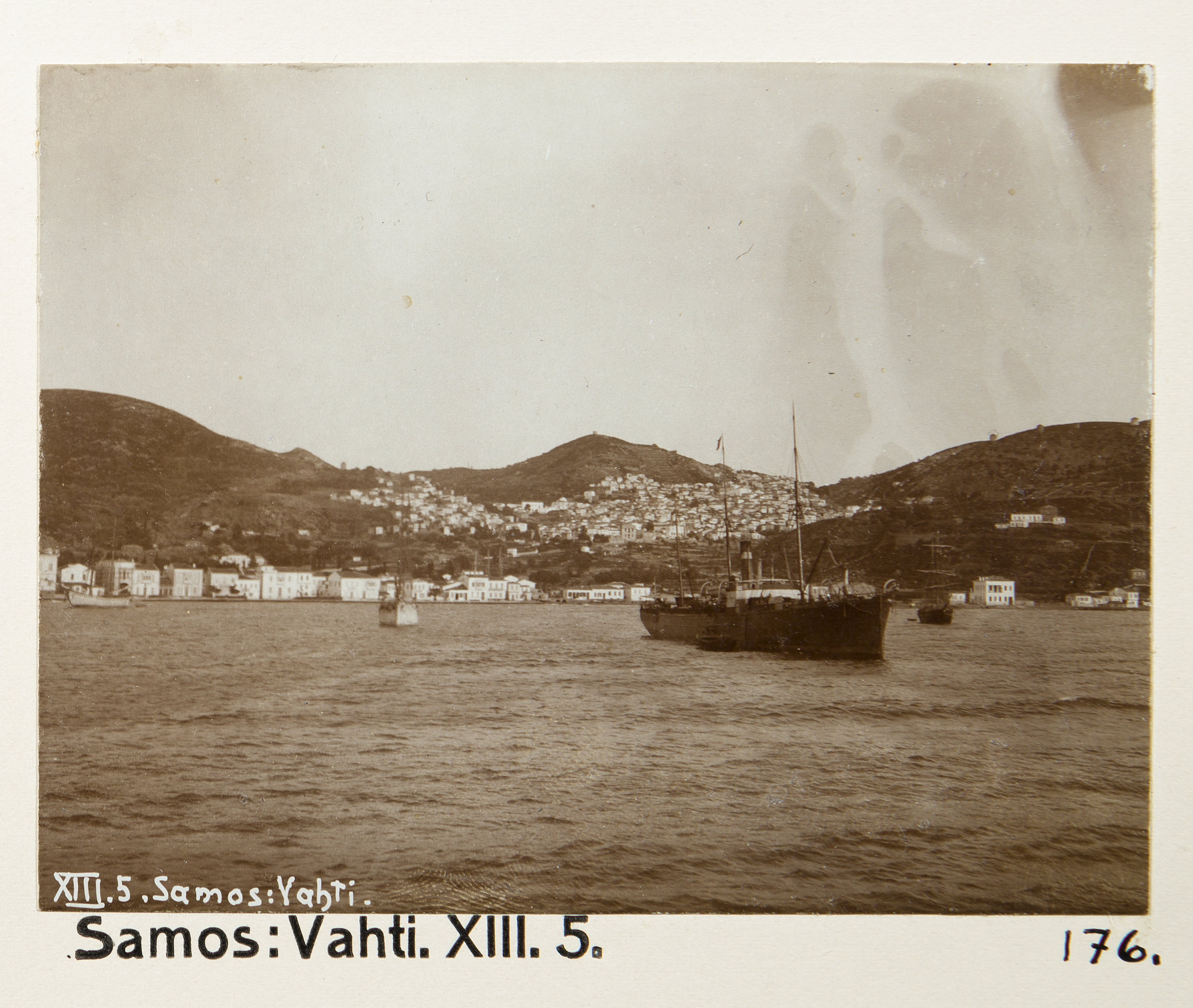 Vy över Vathy, Samos. Text på originalet: "XIII.5. Samos: Vahti." Fotografierna LXVI:N.01.-180. kommer från resan till Palestina och Syrien som Wilhelmina och Walther von Hallwyl gjorde den 30 mars-27 april 1901. De lämnade Sverige den 5 november 1900 för Egypten, där de stannade till den 28 mars 1901, då de fortsatte till Palestina. Med på resan var Wilhelminas sällskapsdam, fröken Ida Uhse. Den 27 april fortsatte de till Turkiet och Mindre Asien. De mindre fotografierna (utom de från Samos) LXVI:N.90.-100. är tagna av Wilhelmina själv, under en resa till häst från Jerusalem till Damaskus 8-20 april 1901. Övriga fotografier är inköpta av Wilhelmina i Jerusalem, Damaskus och Beirut. Alla uppgifter kommer från Ida Uhses reseanteckningar.