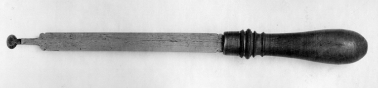 Profilstål med oval egg. Klinga med rektangulärt tvärsnitt, på sidorna, i var ände, dekorerad med ett tvärstreck. Svarvat, profilerat, kägelformigt skaft, dekorerat vid fästet med en större vulst, omgiven av två mindre, samt kring skaftets smalaste del en liten vulst. Fästet är skott med en mässingsring, dekorerad med 4 ringar. Mått: L 343, skaft L 138, största diam: 34,3, egg b: 14,5. Tureholm