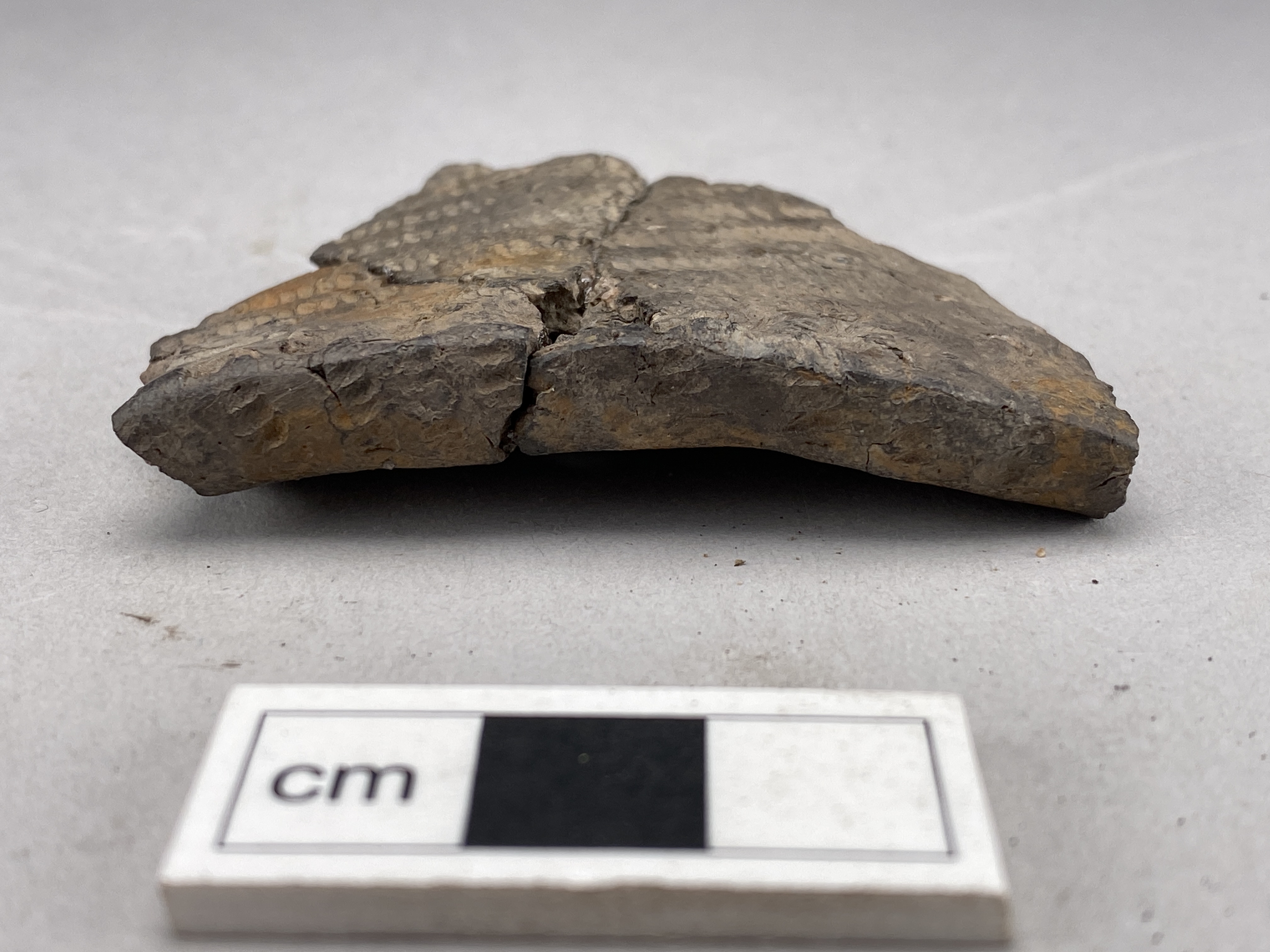 Mynningsskärva bestående av tre fragment. Tvärsnoddsdekor i flera horisontella rader, samt en rad stämpelintryck precis under mynningen. Fast bergartsmagrat gods. Provtagen för lipidanalys i mars 2025.
