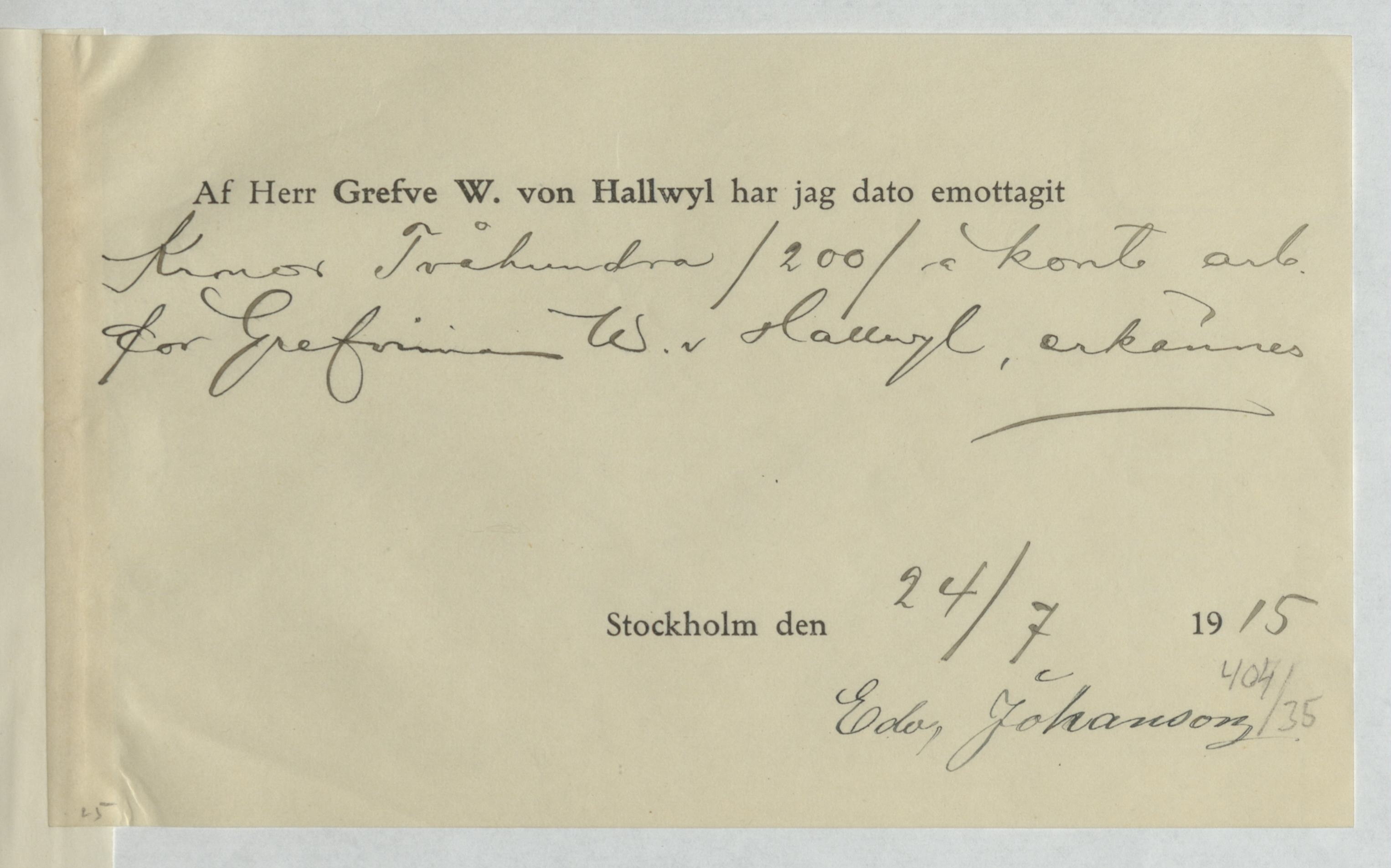 Kvitto från Edv. Johanson, Snickare. Gällande betalning för utfört arbete.