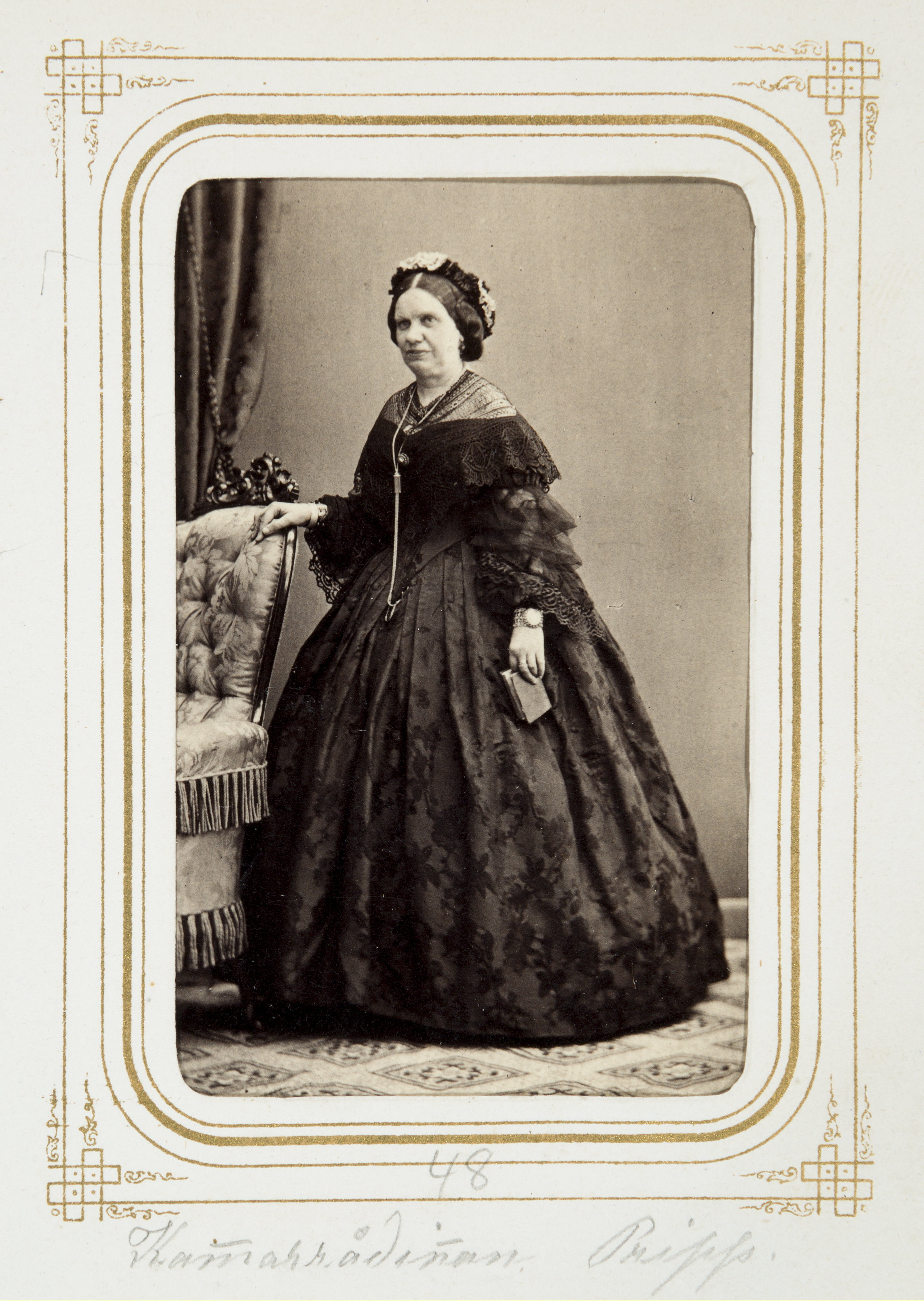 Biografi. Fotografiporträtt. 101 porträtt i album. KAMMARRÅDINNAN PRIPP. Erhållet av Johanna Kempe, f. Wallis på 1860-talet. 26,5x20,7x4 cm.