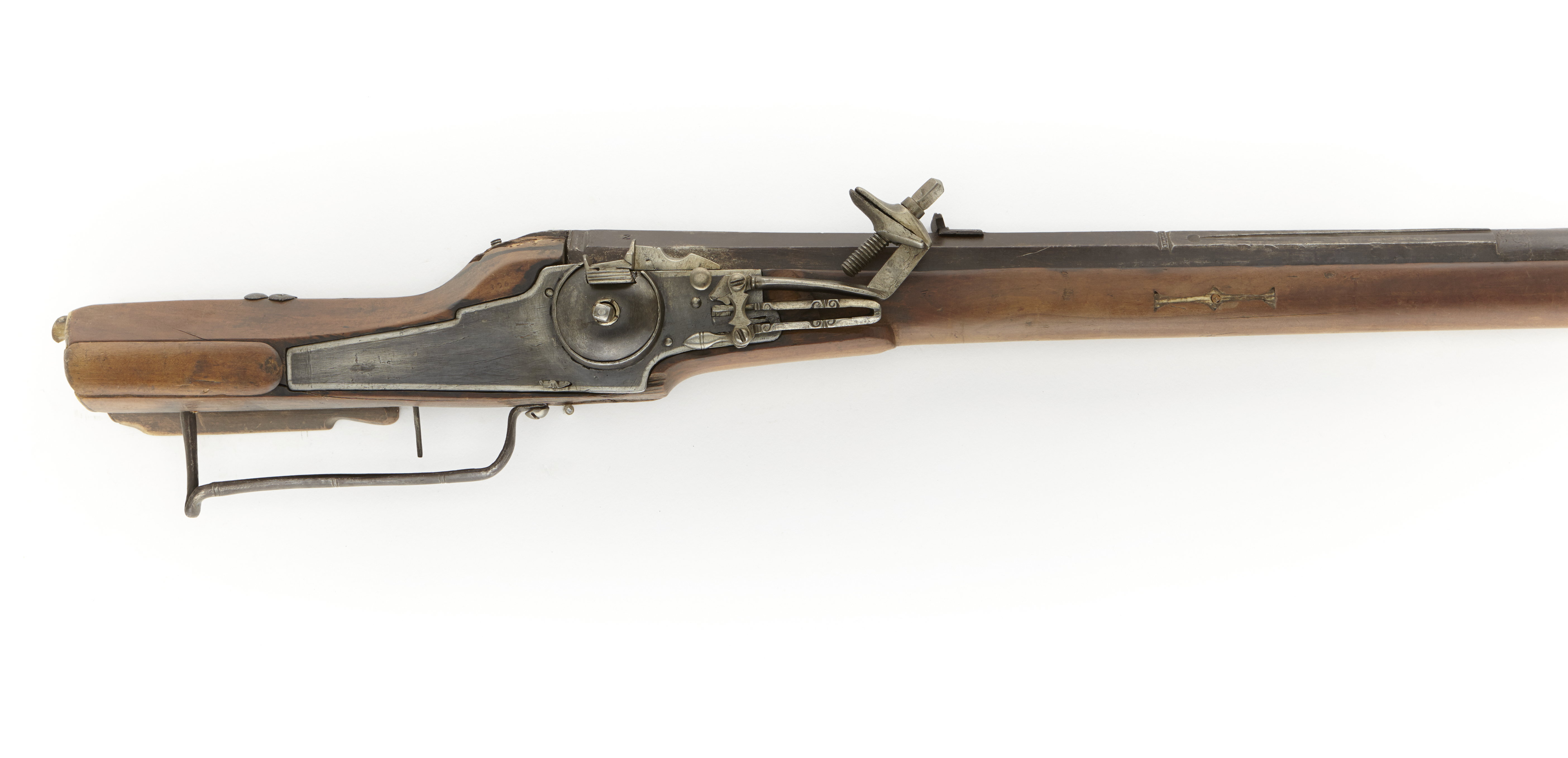 Tornpipa av brunnerat stål. Bakre delen åttkantig, främre rund, vid övergången därimellan tre mot siktet riktade spesar vilka avslutas i var sin rund punsad fördjupning. PÅ kammaren stämplad "NO" (ON?) samt årtalet 1635 (Stöckel nr 4198). Ståndsikte av stål. Knoppkorn av stål. Mellan svansskruvblad och sikte - siktränna. På pipans undersida stämpel liknande sabel, samt ett inslaget kryss. Hjullås. Blånerat låsbleck, tysk typ - bakåt avsmalnande genon två fall. Hög, kullrig hjulkapsel. Mycket låg krutskärm. Hanen med lös underkäke. Stock av ljust brunt trä. Tysk kolvtyp. Bakplåt och stödkula av horn. Kolvlådans lock odekorerat. PÅ kolvryggen två nithuvuden av stål. Bakom svansskruv-bladet liljeformad inläggning av naturhjorthorn. Mellan anslag och kolvhals snidad volut. Två låsskruvar (en saknas) med brickor av naturhjorthorn. Pipan fäst i rännan med tre pipstift, ej ursprungliga, horninläggningar runt pipstiftshålen. Hel laddstocksränna. Näsband saknas. Trågformig varbygel av stål, s.k. "holsteinsk". Tillbehör: Laddstock med doppsko av ben, bakände med gängat stålrör. Märkt: 396, ovanför låsblecket, stanstyp 5376. 369, ovanför den förra märkningen, stanstyp 5376.
