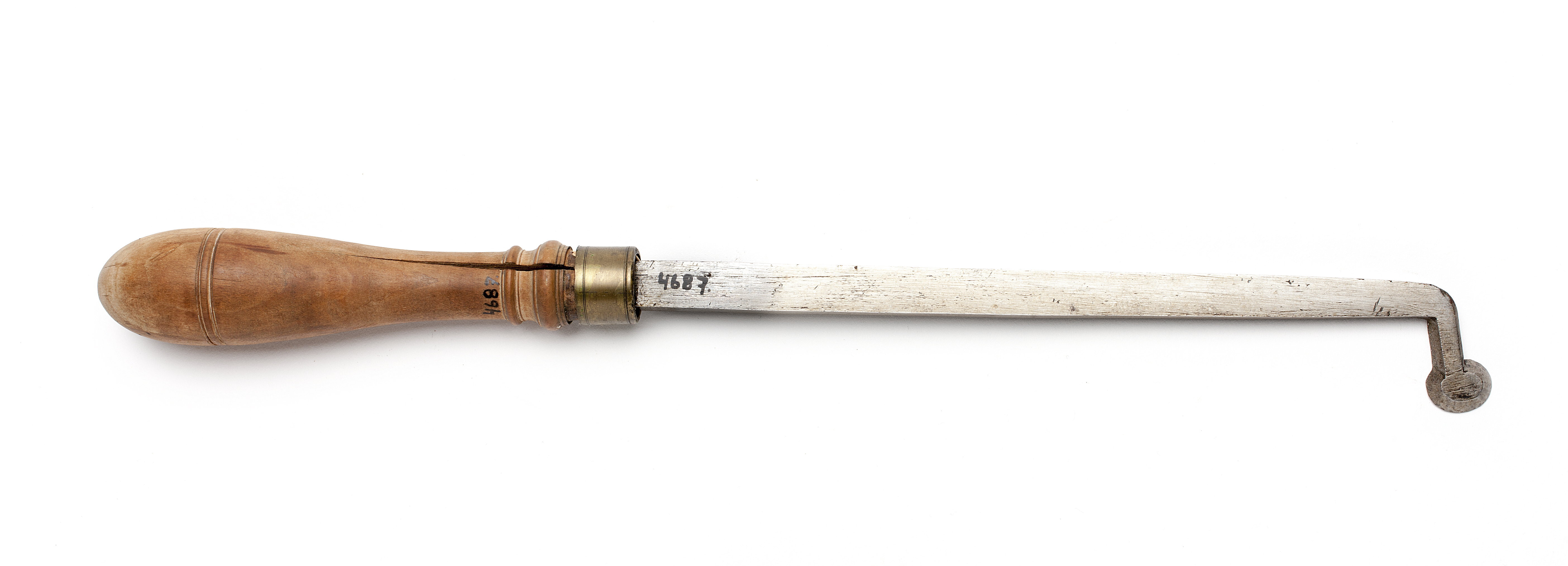 Klinga med rektangulär genomskärning. Smalare, böjd ände slutande i ovalt stål. Svarvat skaft av päronträ med två vulster nedtill ("skoklostertyp"). Mässingsring.