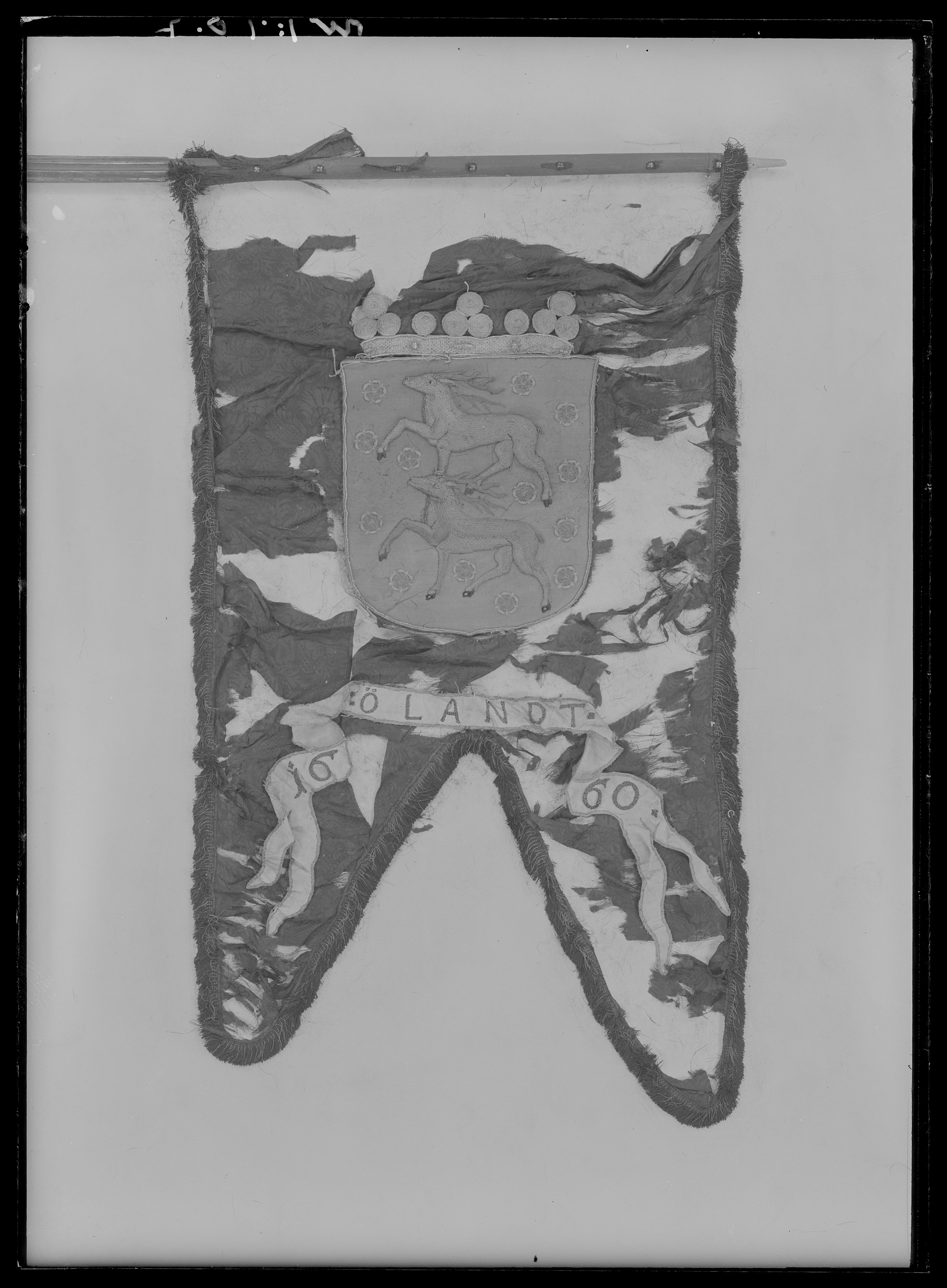 Broderier av Nils Stare. Mycket fragmentarisk duk av svart sidendamast, tvåtungad. Frans av svart silke med guldinslag Br 30 mm. På båda sidor applicerat Ölands vapen; två över varandra gående "rådjur" i reliefbroderi; delvis i silvertråd, omgivna av 13 små rosor broderade i rosa och grönt på en blå sidenatlas botten. Vapnet krönt av en reliefbroderad friherrekrona. Vapnet: 420 x 370 mm. Ett språkband bevarat, av ljus sidenatlas med text broderad i svart silke med guldinslag: "ÖLANDT / 1660". Stången, av svartmålad furu, kannelerad. Spår av förgyllning på ribborna. Slätt handgrepp. Saknar spets. Handgrepp: 225 mm. Total längd: 3530 mm.