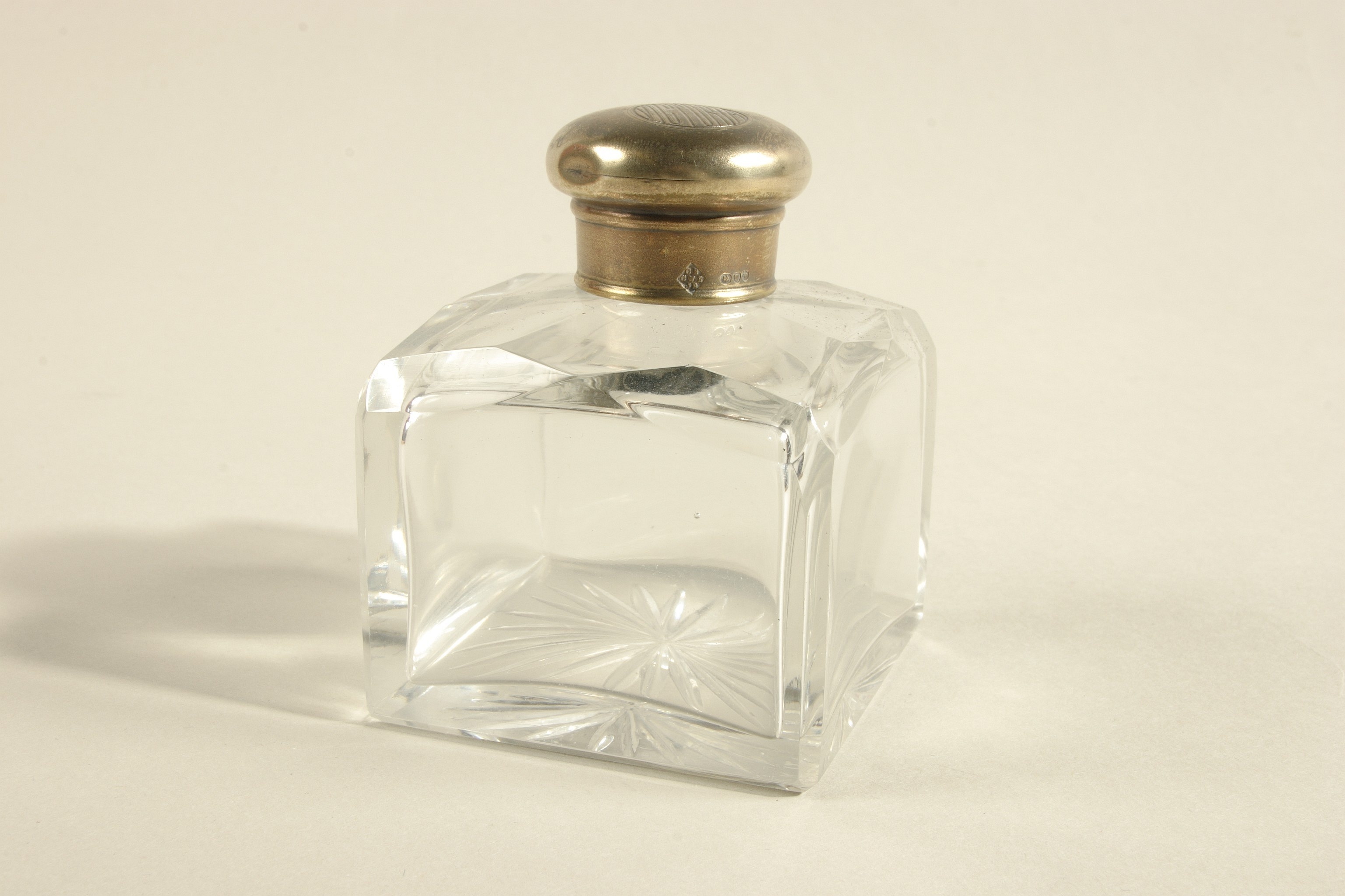 Fyrkantig glasburk med plan botten med inslipat stjärnmönster. Raka, plana sidor, avfasade kanter. Upptill fasetteringar. Påskruvat lock av förgyllt silver med invändig korkskiva och gummiskiva. Upptill på locket graverad krönt ring med : "VICTORIA". På kanten fyra sämplar: en romb med bokstäverna: G B // G W B // J B, ett lejon i en oval, en tom vapensköld inom en oval och ett P (1890) i ett vapen.