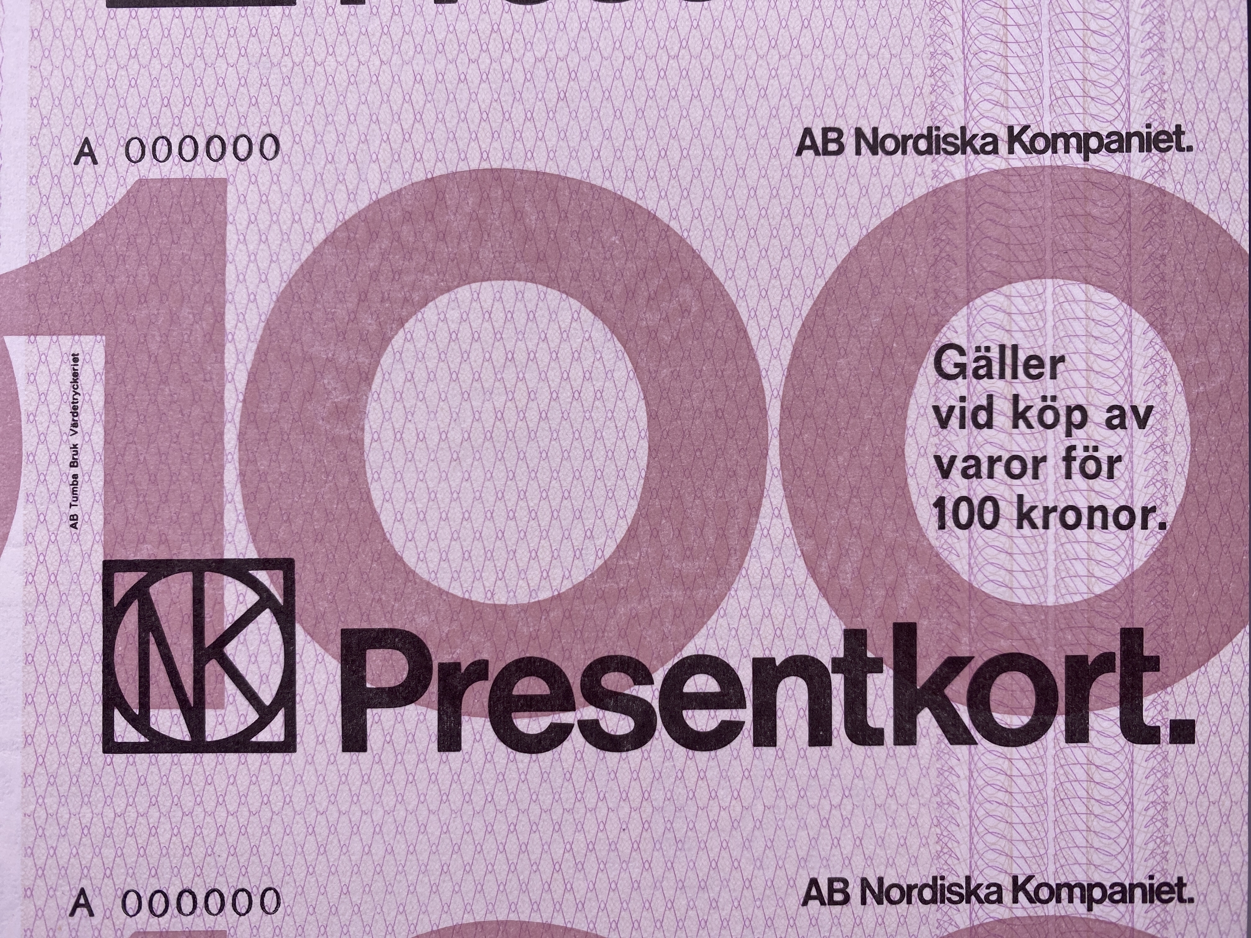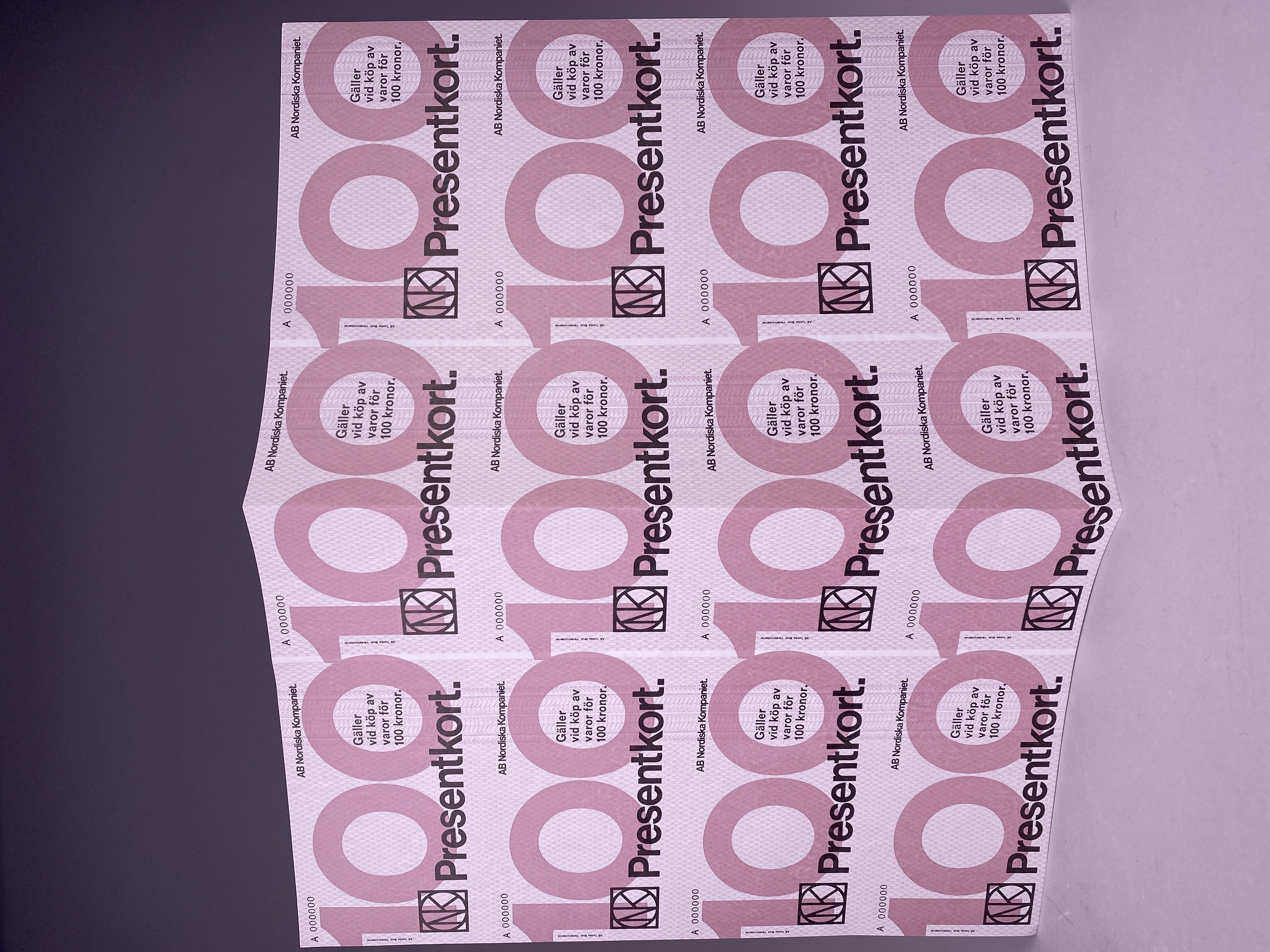 Provtryck av NKs presentkort med ett värde på 100 kronor. Svart text tryckt på röd/rosa bakgrund. Ej daterad ark. Har varit vikt.