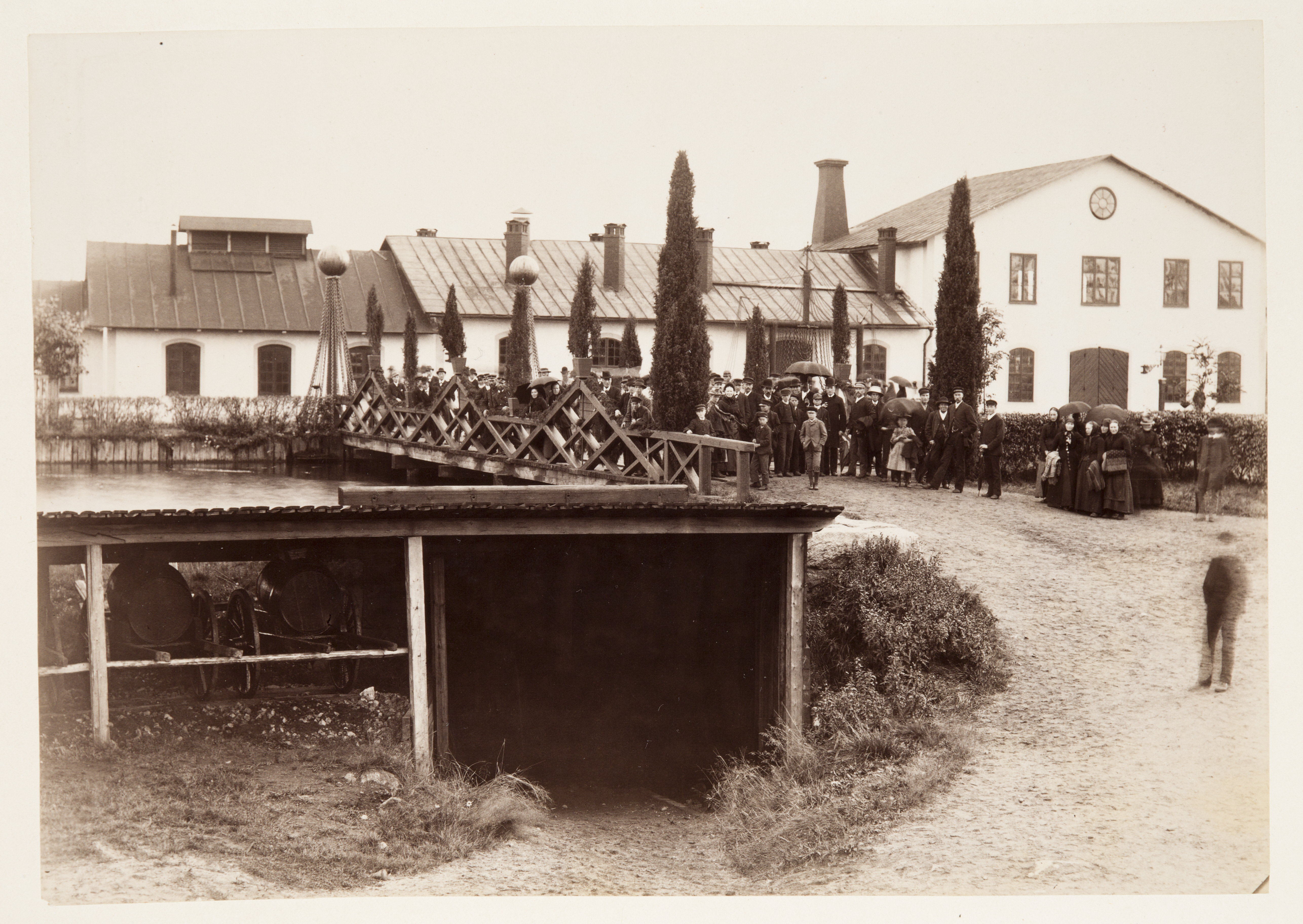 Fotografi från kungabesöket i Ljusne. Folket väntar på Oscar II vid kättingsmedjan. Äreport i kättingarbete.