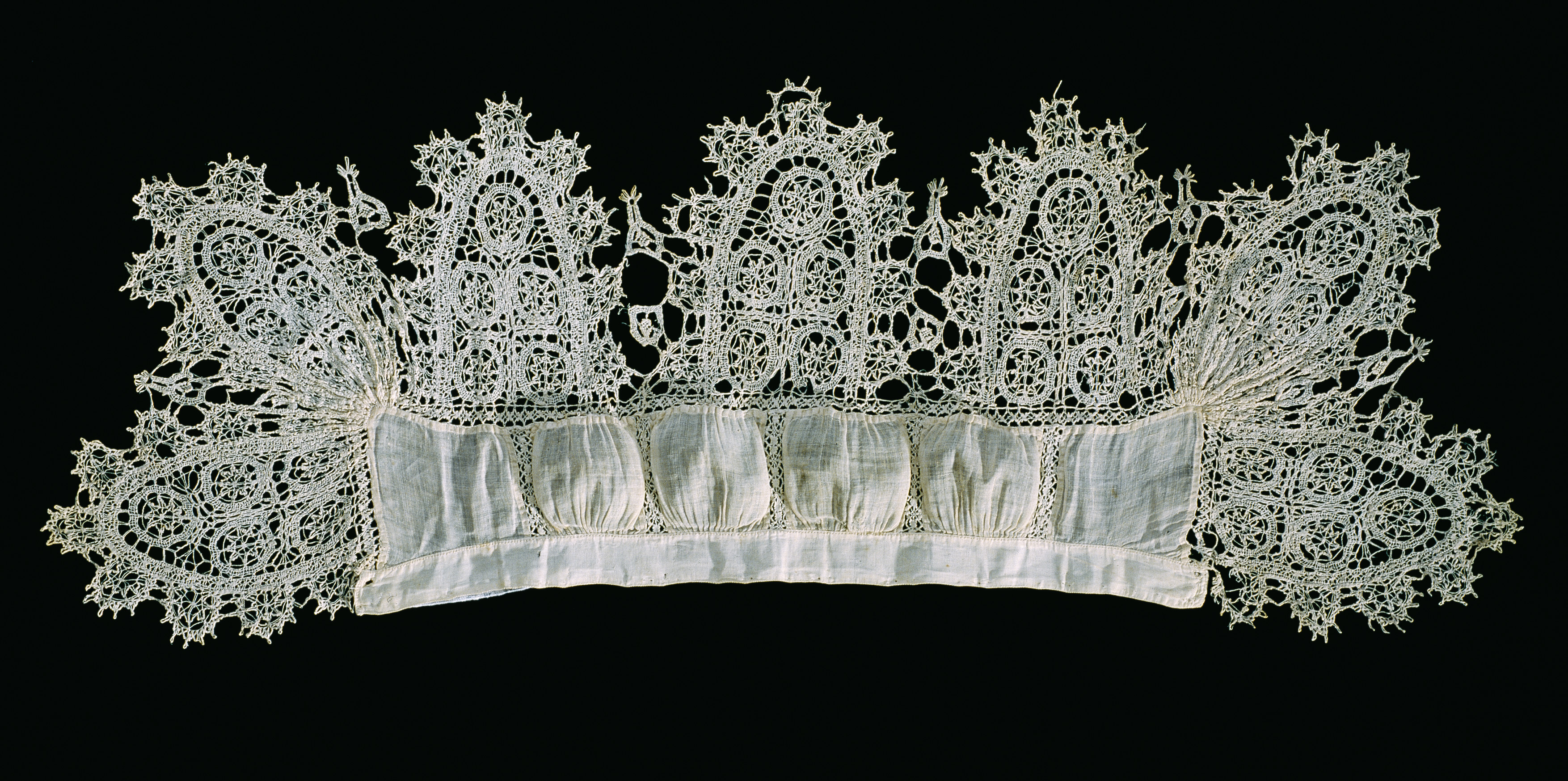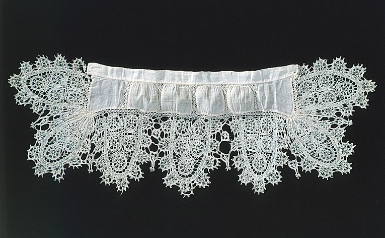 Spetskrage, indelad i fält av smala spetsar och kantad med breda, uddiga sådana. Överlämnad från Drottningholms slott 1863. Har enligt traditionen burits av Gustav II Adolf vid en bal i Augsburg den 30 maj 1632, och blivit sönderriven av kungens danspartner, jungfru Anna Maria Breesler (Breissler) och överlämnats till henne som gåva (jfr text nr 32.397). Kragen har troligen ärvts av hennes barnbarn, Jacobina Lauber, gift med den som skrivit texten. Överlämnad till LRK jämlikt k. brev av den 10 augusti 1932 från St. Historiska Museum, SHM nr 3121:18 "1 st spetskrage, hvilken, enligt uppgift, burits av Gustav II Adolf och av honom blivit skänkt jämte hans bild till jungfru Jacobina Lauber i Augsburg år 1632; enligt en bilagd Tysk anteckning skall jungfru Jacobina då konungen på en bal "dieselbe gnädigst liebkosete" hafva rifvit de hål, som finnas i kragen, "weil Sie sich aus Schamhafftigkeit ihm etwas geweigert", uppfästad på papper; förteckning 20".