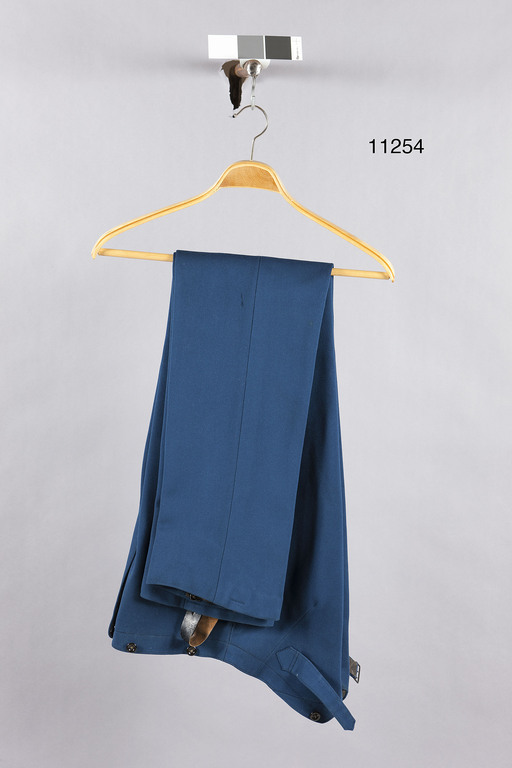 Långbyxor av mellanblått kläde knäppta med gylf med fem knappar, d: 13 mm. Linning med sex knappar, d: 16 mm. Mitt bak v-format sprund med spänntampar med svart lackerad sölja. Fickor i sidsömmen med dold knäppning. Nedtill på byxbenens insidor små knappar för hällor. Vid ena byxbenet hälla av svart lackskinn. Byxbenen skodda med smalt band på insidan. Foder upptill av grått siden. Fickor av lejonfärgad, kyprad bomull. Uniformen buren av Gustaf, prins av Vasa (1799-1877) såsom överste för det ungerska infanteriregementet nr 60, Gyulay. Skänkt av prinsens dotter, drottning Karolina av Sachsen till kammarherre Magnus Lagerberg 1877. Gåva av denne till LRK via Göteborgs museum (brev dnr 208:1907).