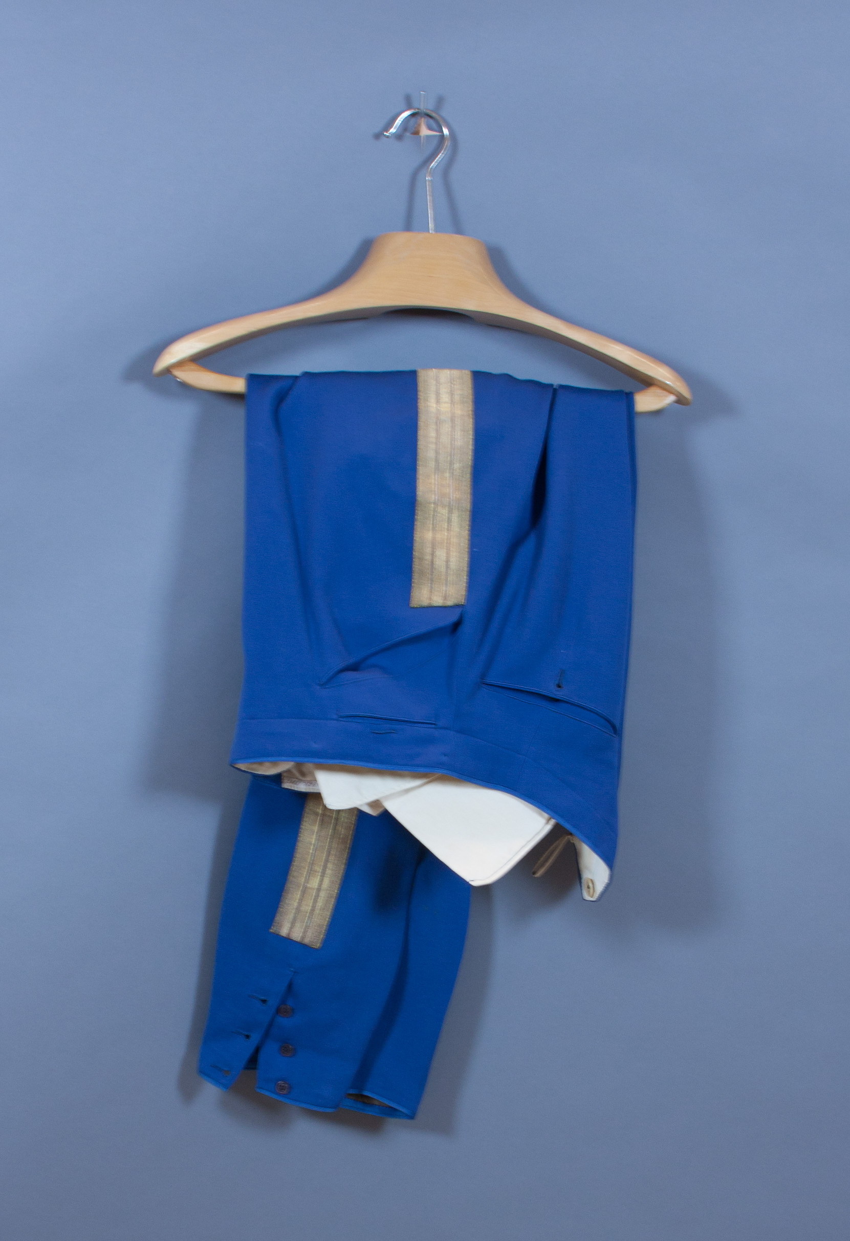 Ridbyxor av mellanblå diagonal, knäppt med gylf med fem blå knappar, d: 14 mm, med firmamärke: "J.M. JANSSON & WALLGREN". En bakficka höger, knäppt med knapp, lika som föregående. Snedställda stolpfickor framtill. Utmed sidsömmarna 44 mm breda guldgaloner, avslutade ca 150 mm nedifrån. 125 mm långa sprund, knäppta med vardera tre små translucida, plommonformiga knappar. Foder av vit bomull i linningen samt sex vita knappar, d: 17 mm med firmamärke: "J. M. JANSSON & WALLGREN". Spänntamp i midjan.
