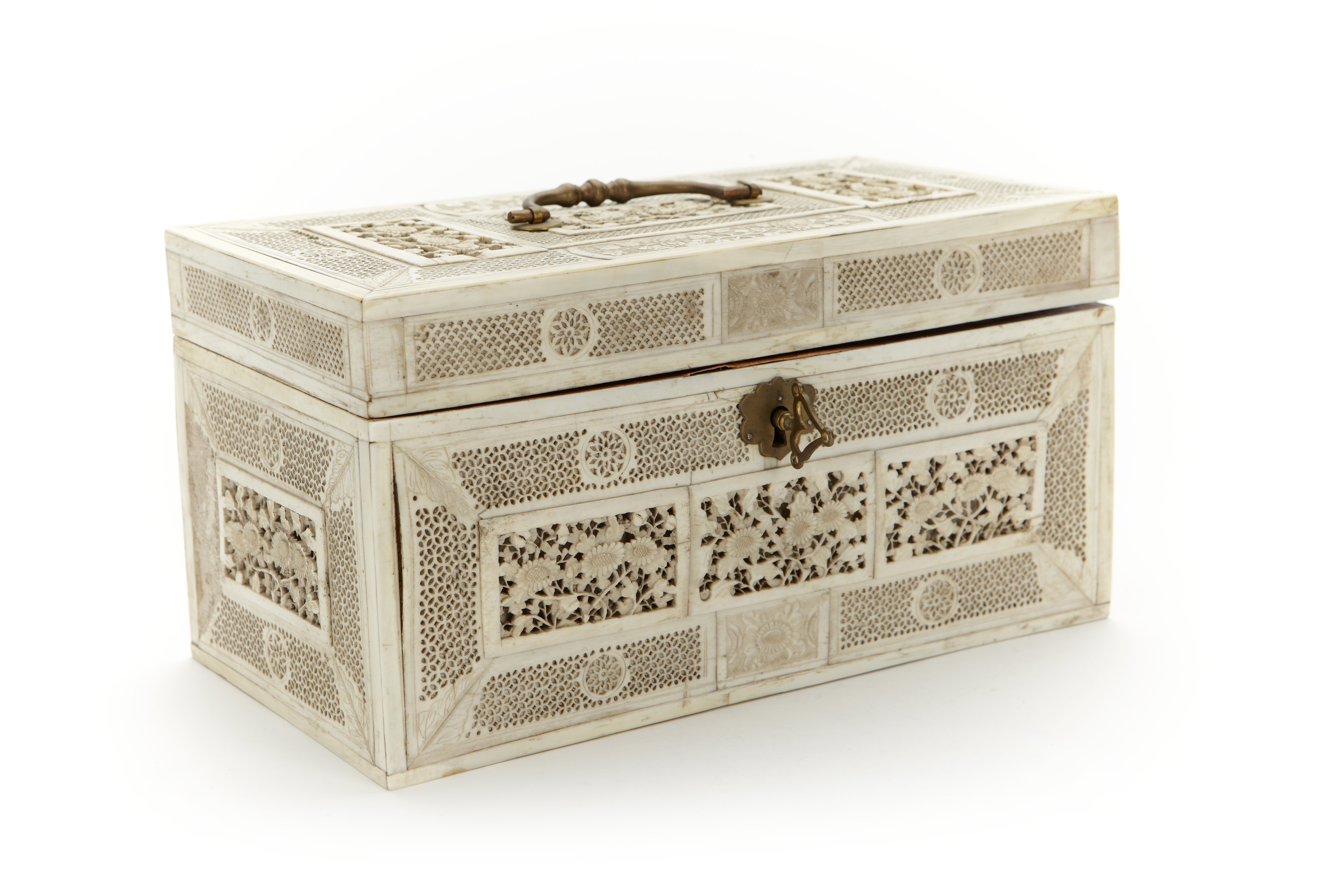 Skrin med lock, av elfenben, rikt snidat med geometriskt spetsverk samt fält med blommor.