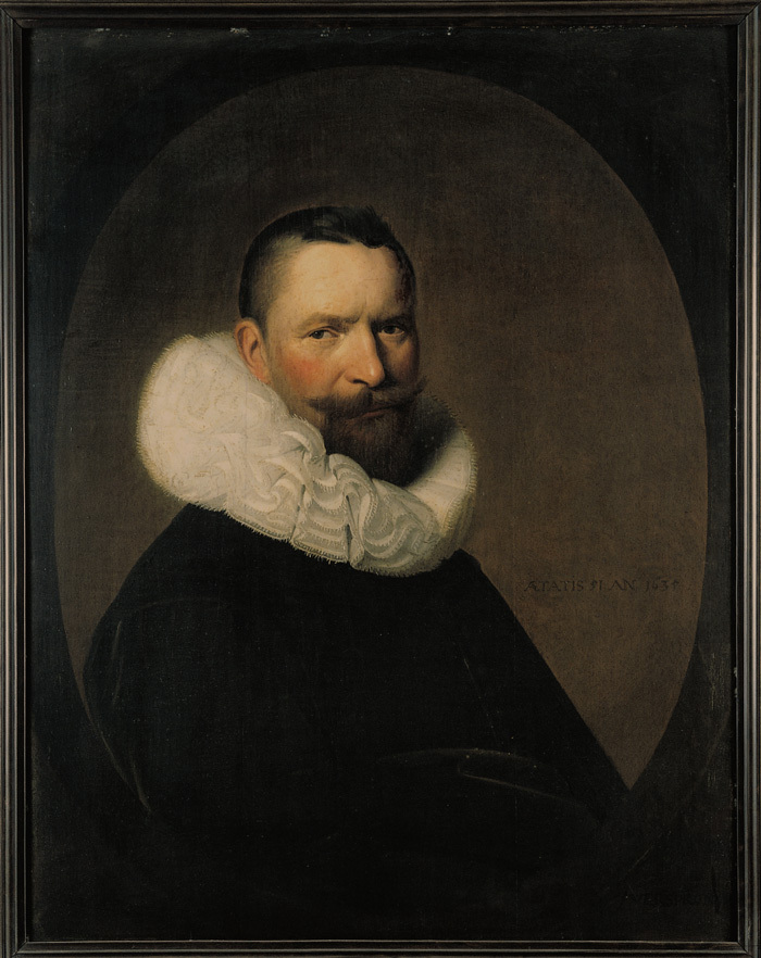 MÅLERI. Porträtt av. Detta porträtt finns i två exemplar, ett i Hallwylska museets samlingar och ett i en engelsk privatsamling. Båda kan anses vara original. En förklaring till detta kan vara att modellen, Josias van Herwynen, gjorde två beställningar år 1635, en till sig själv och en till dottern i samband med dennas giftermål detta år. * Hallwylska museets version bör i så fall ses som den målning som dottern fick. För en sådan slutsats talar dels det faktum att den såldes 1906 samtidigt med ett porträttpar av dottern och mågen, också utfört av Verspronck, dels att nämnda porträttpar trots en sannolik datering till 1650 - talet tyder på ett medvetet efterliknande av kompositionen av det tidigare porträttet från 1635 genom den ovala inramningen. There are two versions of this portrait, one in the collections of the Hallwyl Museum and one in an English private collection. Both can be regarded as original works. One explanation to this may be that the model, Josias van Herwynen, placed two orders in 1635, one on his own account and one for his daughter in connection with her marriage that year * If so, the Hallwyl Museum 's version should be regarded as the painting which went to the daughter. This is suggested by the fact of it having been sold in 1906 simultaneously with a pair of portraits of the daughter and son-in-law, also by Verspronck, added to which, the pair of portraits, although probably dating from the 1650s, suggest, through their oval framing, a deliberate compositional imitation of the earlier, 1635 portrait.