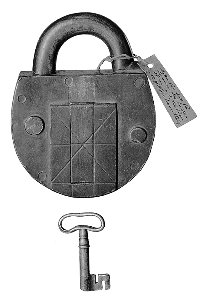 Låshus tjockt, platt, något mer än halvrunt samt med bågformig tjock rundstavig bygel. På låshusets framsida en pålagd rektangulär skiva, längs vars mitt, över nyckelhålet ett ingradat skjutlock med springfjäder; på skivan inskuret tre tvärgående ränder samt två diagonalt gående, som korsa varandra. På ömse sidor om skivan en rund platt tunn knapp, den vänstra sittande något högre upp, skjutbar åt vänster och förbunden med lockets springfjäder, den högra en s. k. blindknapp. På låshusets baksida en pålagd, över hörn ställd kvadratisk skiva med två korsade, diagonalt gående ränder. Nyckel (original): Ögla oval, flackstavig samt något stukad från överkanten; upptill på pipan en profilering. Tillhört inventarierna på Wilh. H. Kempes kontor, inrymt i Schinkelska huset, dåvarande adress Kornhamnstorg 2 (f. d. Lilla Nygatan 29, nuvarande Kornhamnstorg 4), Stockholm, 1843 -1883; därefter på firman Wilh. H. Kempes (innehavare Walther von Hallwyl och Johanna Kempe, f. Wallis) kontor, Blasieholmstorg II, 1884 - 30 September 1896, och Hamngatan 4, 1 Oktober 1896 - 1909; sedermera på Walther von Hallwyls privata kontor 1909 - 1921 samt slutligen på Wilhelmina von Hallwyls f. Kempe, kontor där från sistnämnda år t. o. m. 1930.