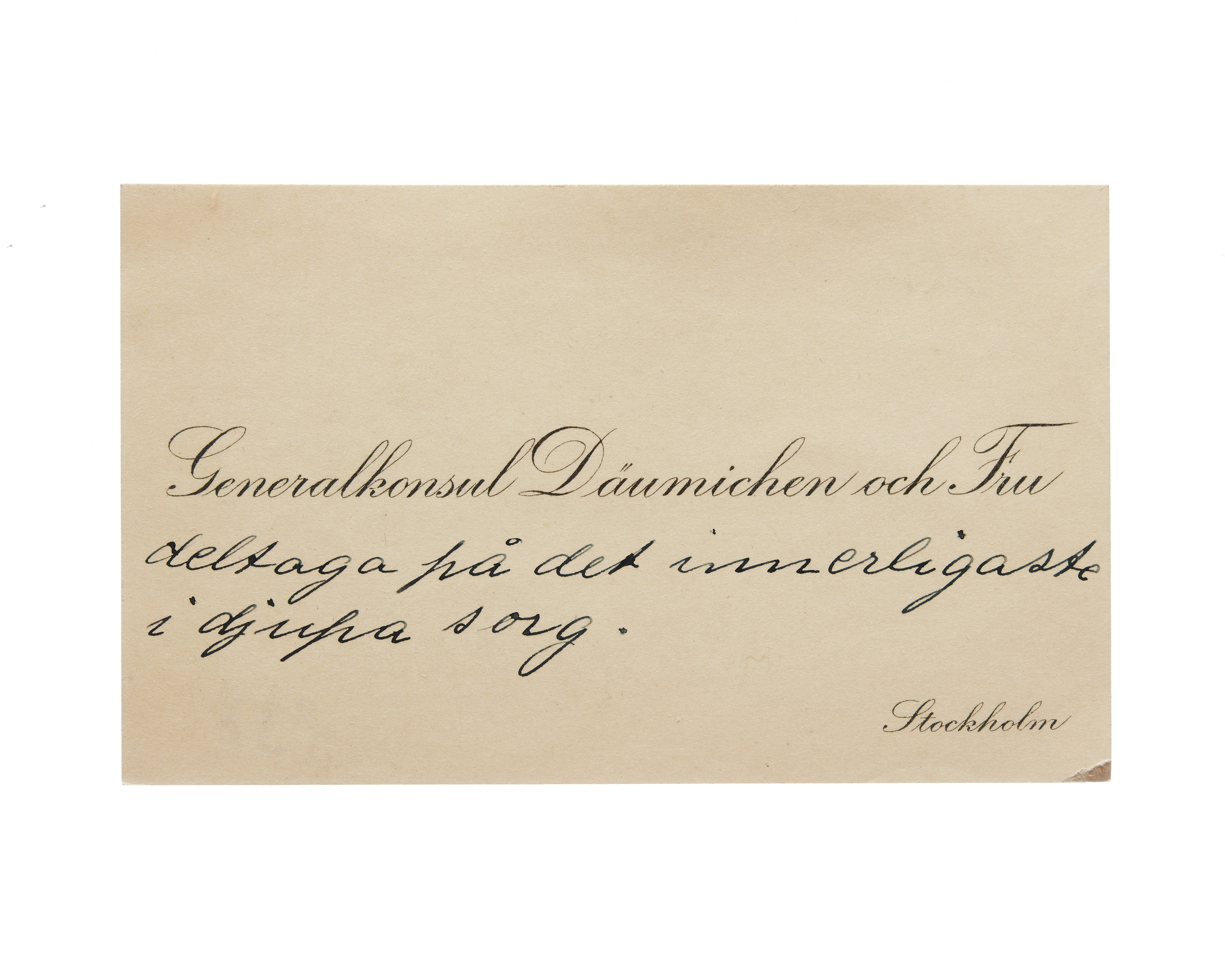 Ett visitkort från Generalkonsul Max Däumichen och fru, daterat 1921. Handskrift (nedanför namnet) "Deltaga på det innerligaste i djupa sorg". Adress (nedre högra hörnet) Stockholm.