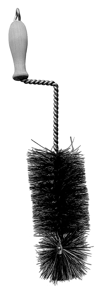 FLASKBORSTE Av svartbrunt tagel och vit svinborst samt järntråd. Cylindrisk, med borsten fäst mellan två sammanvridna förtenta järntrådar, som ovanför borsten bilda ett långt skaft med rätvinkligt omböjd ytterände, på dennas yttre vinkelben ett svarvat handtag av björk, långsträckt päronformigt samt rörligt på de sammanvridna trådarna, som utanför handtaget är avslutade i en rund ögla. På nedre änden en skivformig rund pensel med taglet fäst mellan två från trådarna utsmidda ovala plattor. Längd: omkring 30 cm.