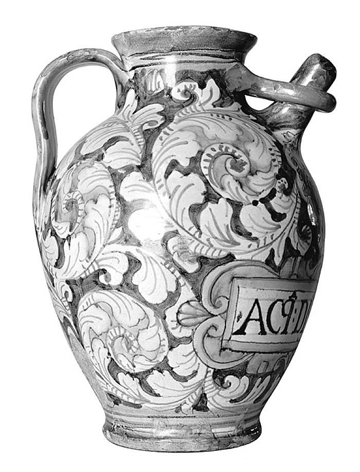 TILLÄGG: Polykrom äggformad apotekskanna föresedd med en henkel samt rundstavig pip med rundstavig ögla. Hela kärlets yta är täckt med det dekorativa mönstret "girali foliati a risparmio" i orange, gult, violett och grönt mot blå bakgrund. På kannans framsida ett språkband märkt med det medikament som kannan skulle fyllas med: "ACq:DI.VIOLE" (Acqua di Viole, det vill säga violvatten). Språkbandet är krönt av ett heraldiskt vapen. Kannans baksida är märkt "DO" i en vit medaljong. Initialerna kan referera till beställaren. Kannan är ett typiskt exempel på den typ av keramik som producerades till privata apotek i Montelupo. Dekorationen har klassificerats av den italienska experten Fausto Berti. Denna typ av dekoration är en av många dekorativa stilar i Montelupos dekorationsrepertoar, som intensifierades i slutet av 1500-talet. Det finns mängder av liknande kannor, albarelli och kärl bevarade.