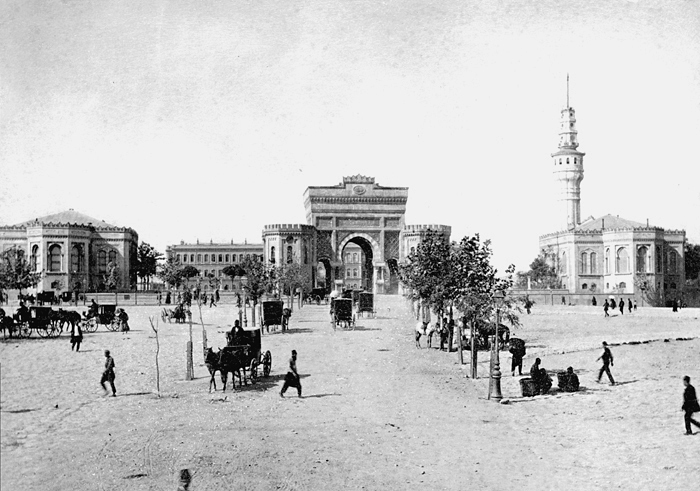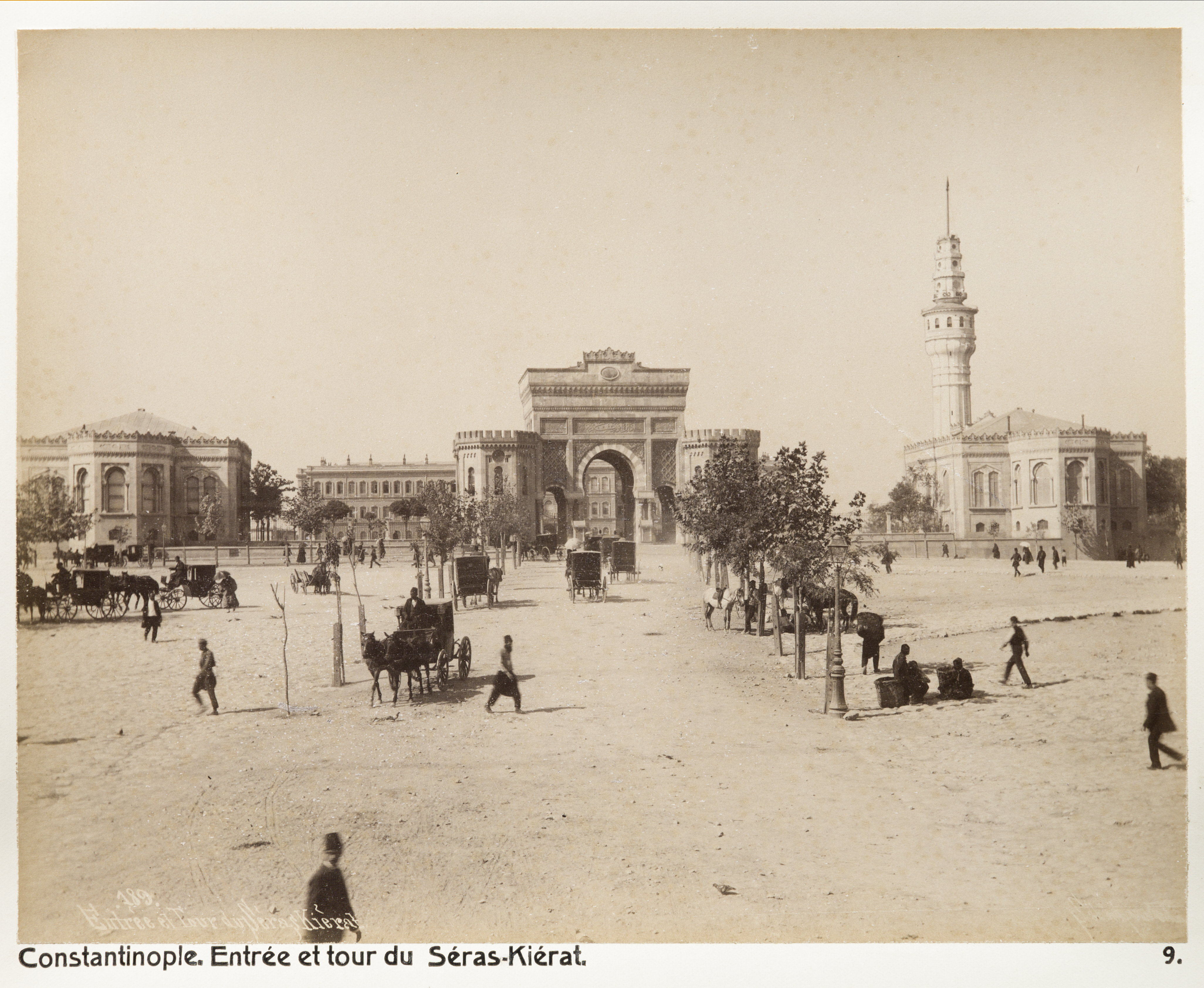 Beyazıt-torget och ingången till universitetet. Text på originalet: "Constantinople. Entrée et tour du Séras-Kiérat." Fotografierna LXVI:O.01.-54. kommer från resan till Turkiet och Mindre Asien som Wilhelmina och Walther von Hallwyl gjorde den 27 april - 20 juni 1901. De lämnade Sverige den 5 november 1900 för Egypten, där de stannade till den 28 mars 1901, då de fortsatte till Palestina. Den 27 april fortsatte de till Turkiet och Mindre Asien. Med på resan var Wilhelminas sällskapsdam, fröken Ida Uhse. I Konstantinopel (Istanbul) anslöt sig Wilhelminas mor Johanna Kempe och kusindottern Elma Hök. Fotografierna är inköpta av Wilhelmina i Konstantinopel (Istanbul) och Brussa. Alla uppgifter kommer från Ida Uhses reseanteckningar.