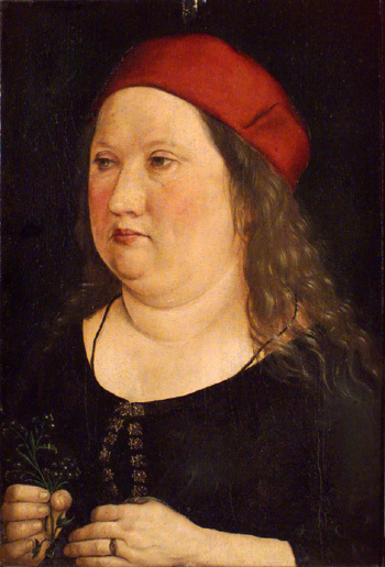 Bröstbild, fas vänster. Långt hår, röd mössa. brungrön dräkt med guldhakar fram. På vänster hand med ring med text "IHS", i högra handen förgätmigej. Baksidan svärtad. Skrivet med rödkrita "Skrifwet (uti) fatt(e)bur(en", med vit krita "No 116". Enkel profilerad ram, på insidan målad i ockra och svart. Nedtill skrivet med svart färg .IM.1.4.9.7.IAR.GEMACHT.MEINS.ALTERS.IM.35. Inscription on the bottom of the frame in black .IM.1.4.9.7.IAR.GEMACHT.MEINS.ALTERS.IM.35. The portrait is executed in a realistic and delicate style typical of the southern German renaissance. Epecially the hands and the reproduction of the hair show the skill of a true master. The painting corresponds well with the other portraits executed by Dürer in Nürnberg during the late 1490s. The portrait was first attributed to Albrech Dürer. Since then the painting has been associated with both Holbein and most lately Bernard Strigel. Although the portrait show some similarity to a few portraits executed by Striegel it can not be ignored that all of those derives from around the year 1520. His name is not mentioned in any of the known sources until he appears in the tax records of Memmingen in 1505. There he is recorded as member of the council in 1517, and later as chief warden of the Painters Guild, before being active in Vienna in 1520, 1522 and 1525. It is therefore highly unlikely that he would have executed this portrait in 1497. In contrast, it fits in well with the chronology of Dürer, as this was precisely the type of portraits that he executed during the last years of the 1490s in Nürnberg. This was originally one of two paintings connected to Dürer owned by Carl Gustaf Wrangel. The other one, a hare on parchment signed and dated with the Dürer monogram AD 1502, was sold at the auction of the Magnus Brahe Collection, in Stockholm 1845, lot 89. Both of them possibly belonged to the collection of Rudolf II in Prague and were taken as war booty by the Swedish army in 1648. Wrangel 1676: nr 694, lott 1:149 "ein Weibsbild". Trasig Wrangellapp med text "No 694 Ein wei.........". 1728: "En Bild med röd mössa uppå. N:23 12:-" 1756: "1 st d:o mindre En Fruentimbersbild med röd mössa på" el. "1st Fruentimmers Portrait på träd målad". 1823: "1 st Ett okänt Fruntimmer, måladt på Träd" (likaså 1793) 1910: "Bernhard Striegel Själfporträtt".