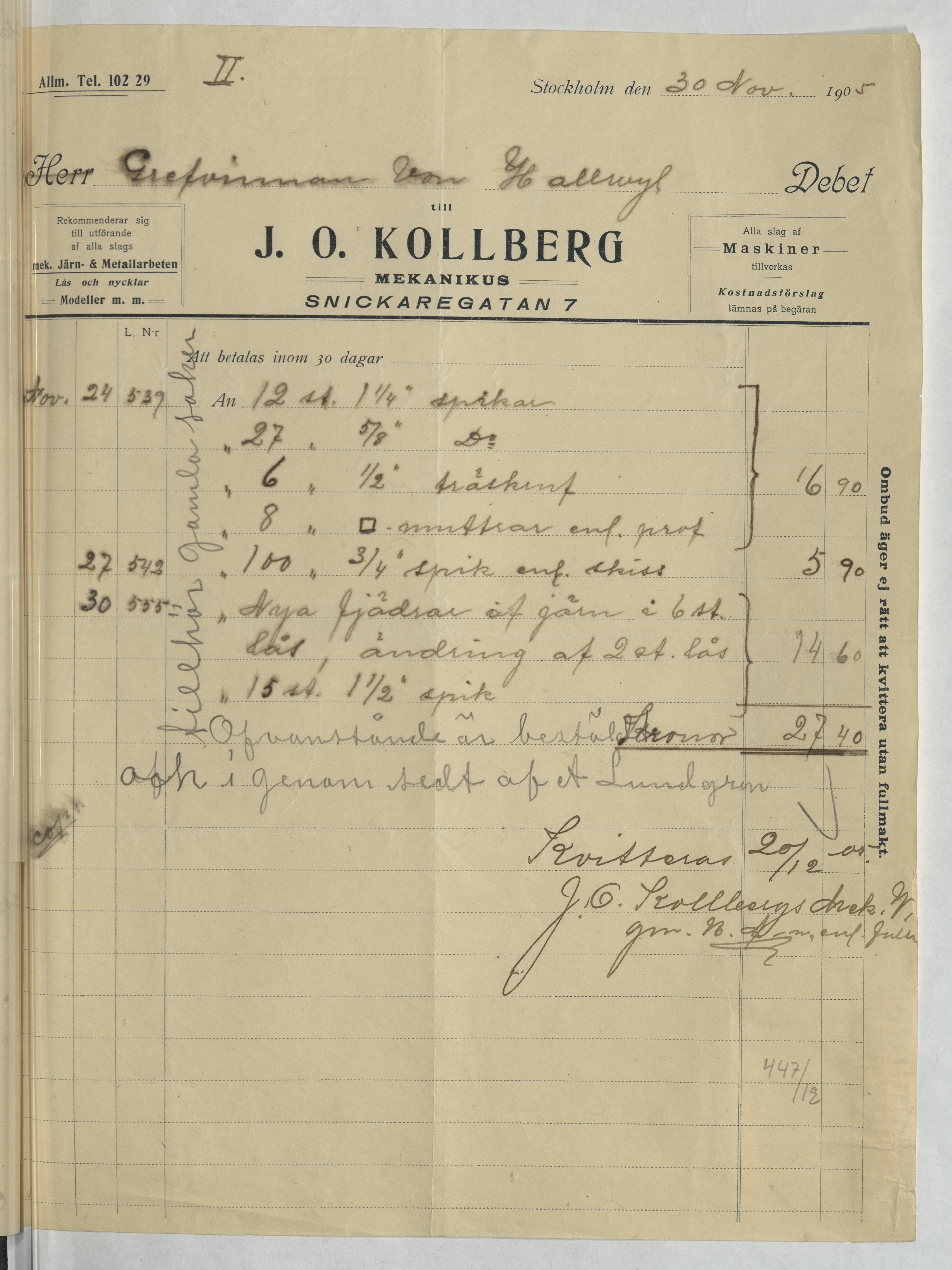 Kvitto från J. O. Kollberg, Mekanikus