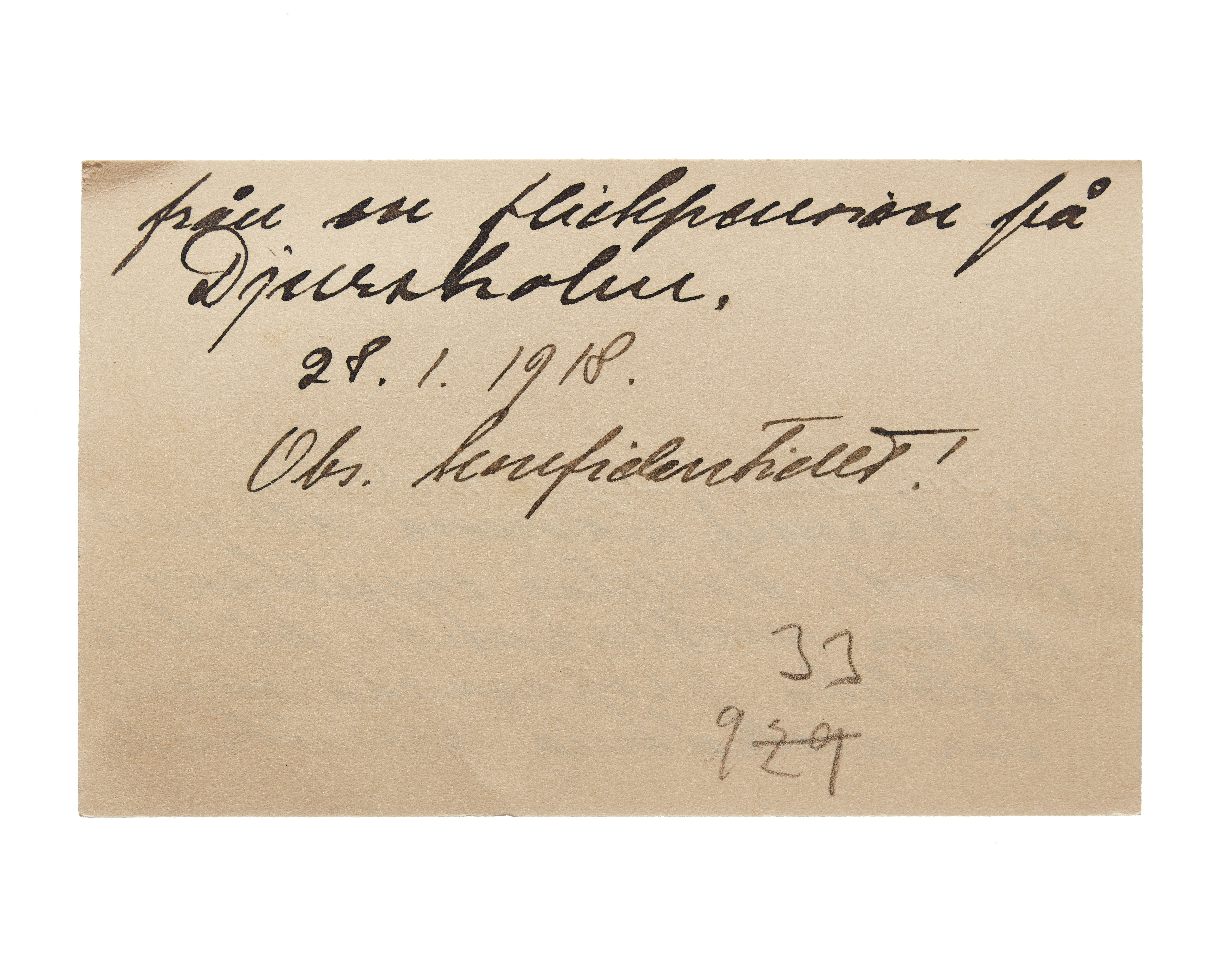 Ett visitkort från Fil Doktor Lydia Wahlström, daterat 28.01.1918. Handskrift ”får härmed nämna att följande kallelse egentligen avser motverkande av den katolska propaganda man har anledning misstänka (forts. baksida) från en flickpension på Djursholm. 28.1.1918. Obs. konfidentiellt!”