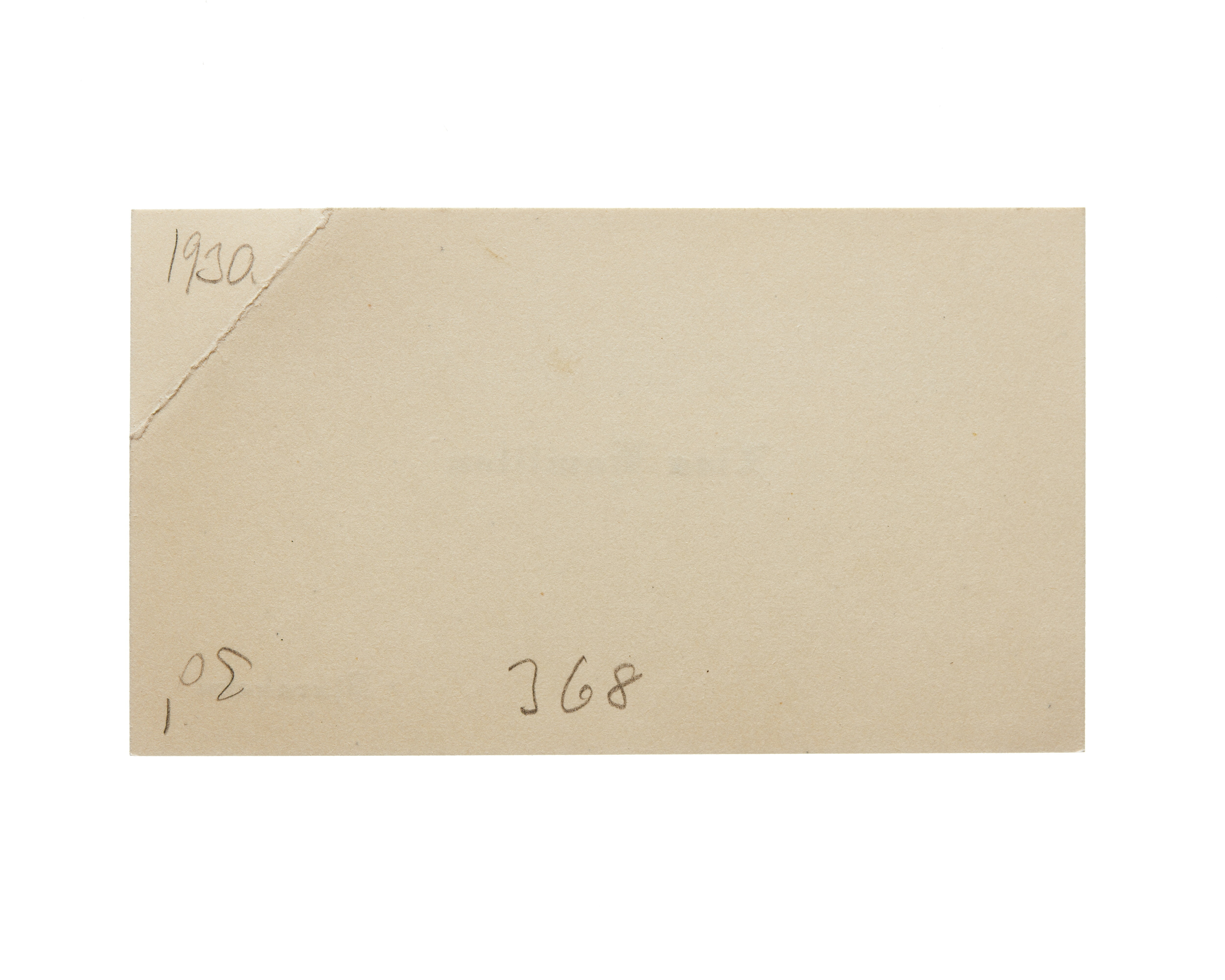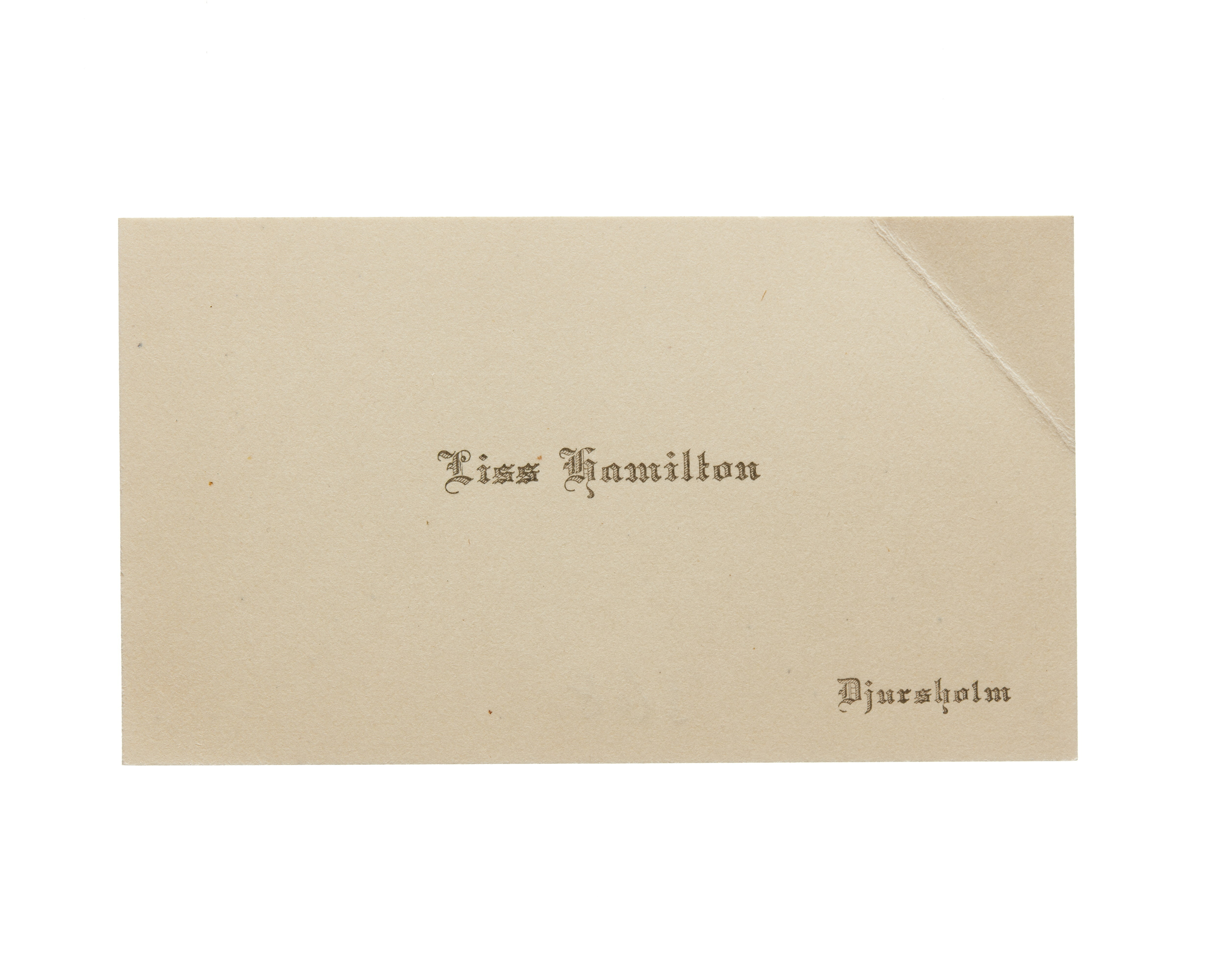 Ett visitkort från Liss Hamilton, daterat 1930, vikt i övre högra hörnet. Adress (nedre högra hörnet) Djursholm.