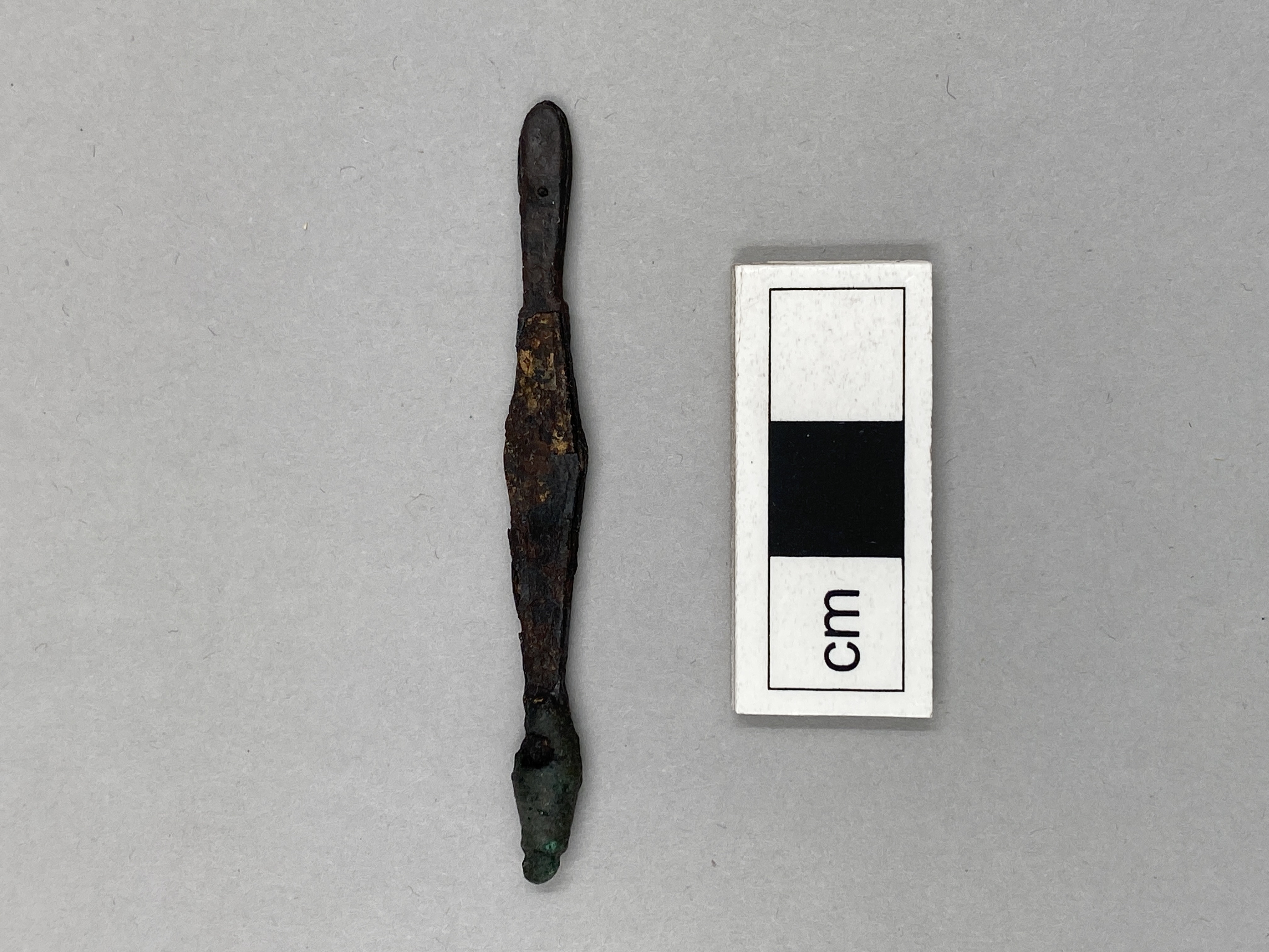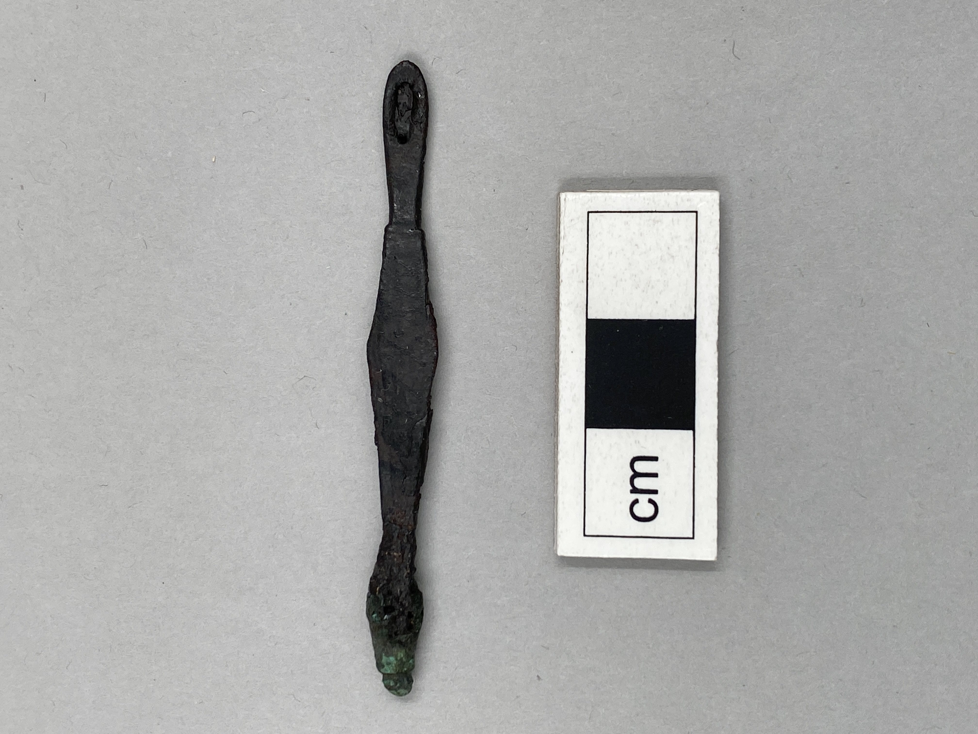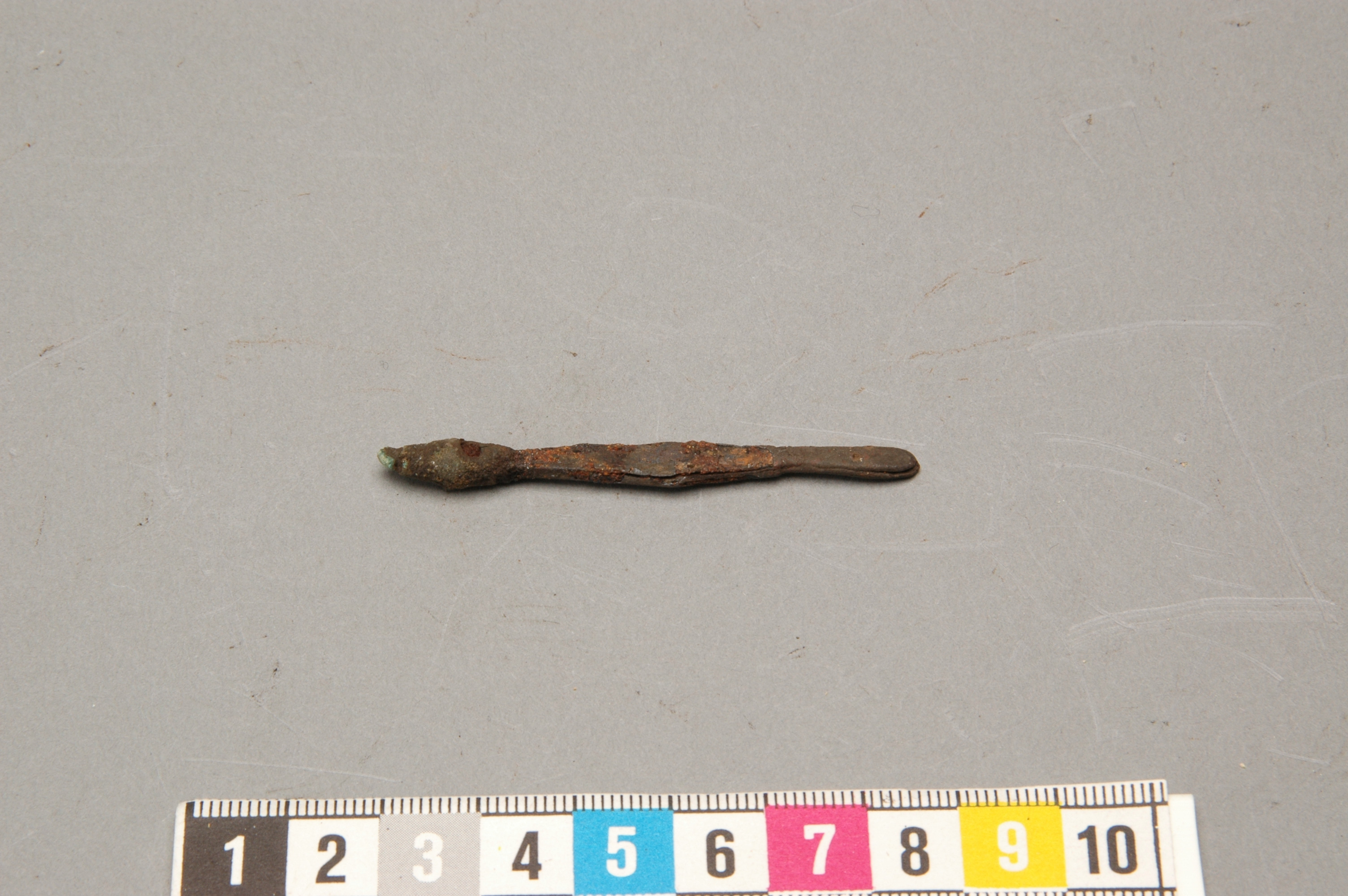 Örslev av brons, spetsen är kluven, på ena sidan urgröpt så att ett hål har uppkommit genom den ena fliken. Den övre delen är avbruten och har varit försedd med ett hål.