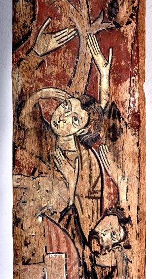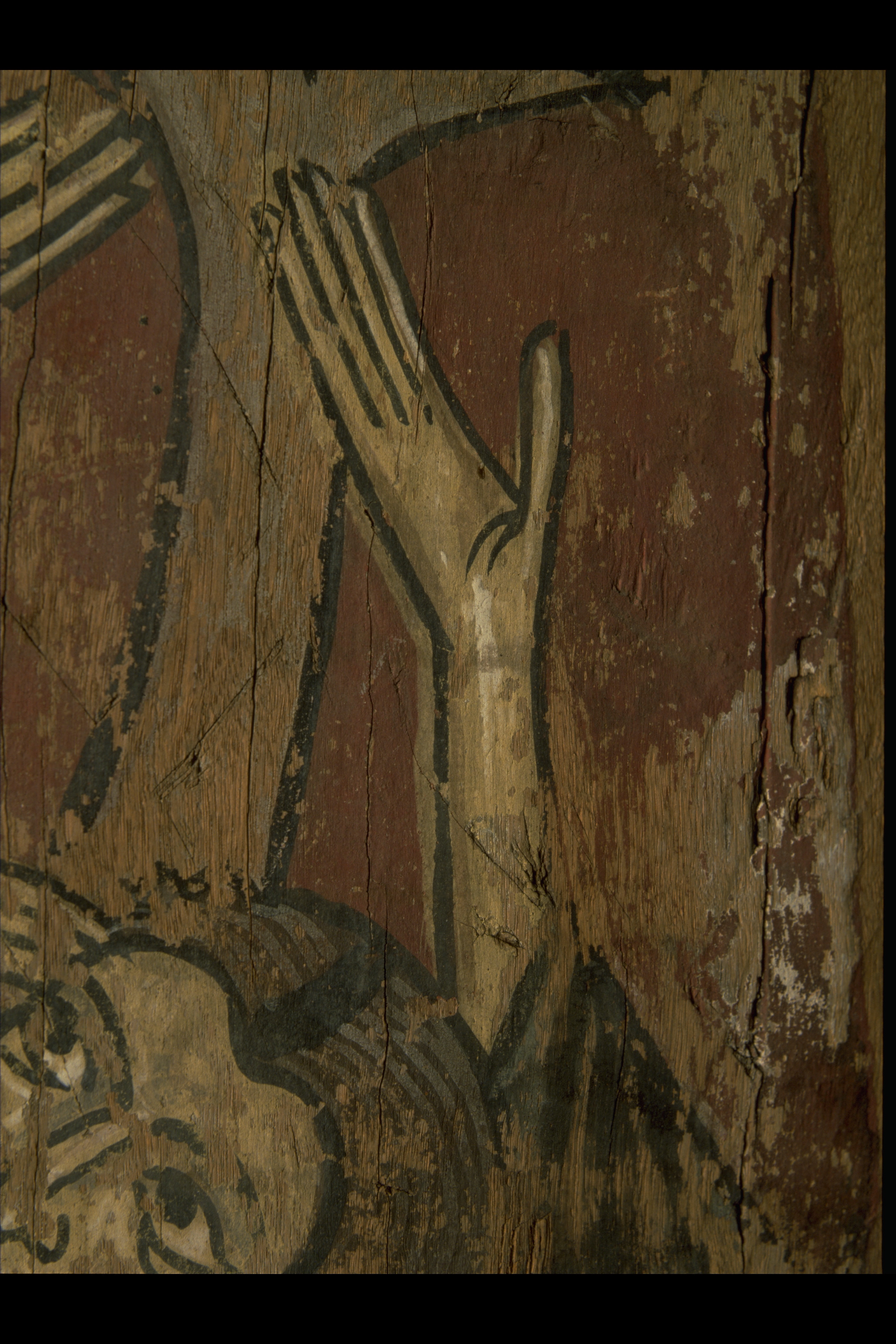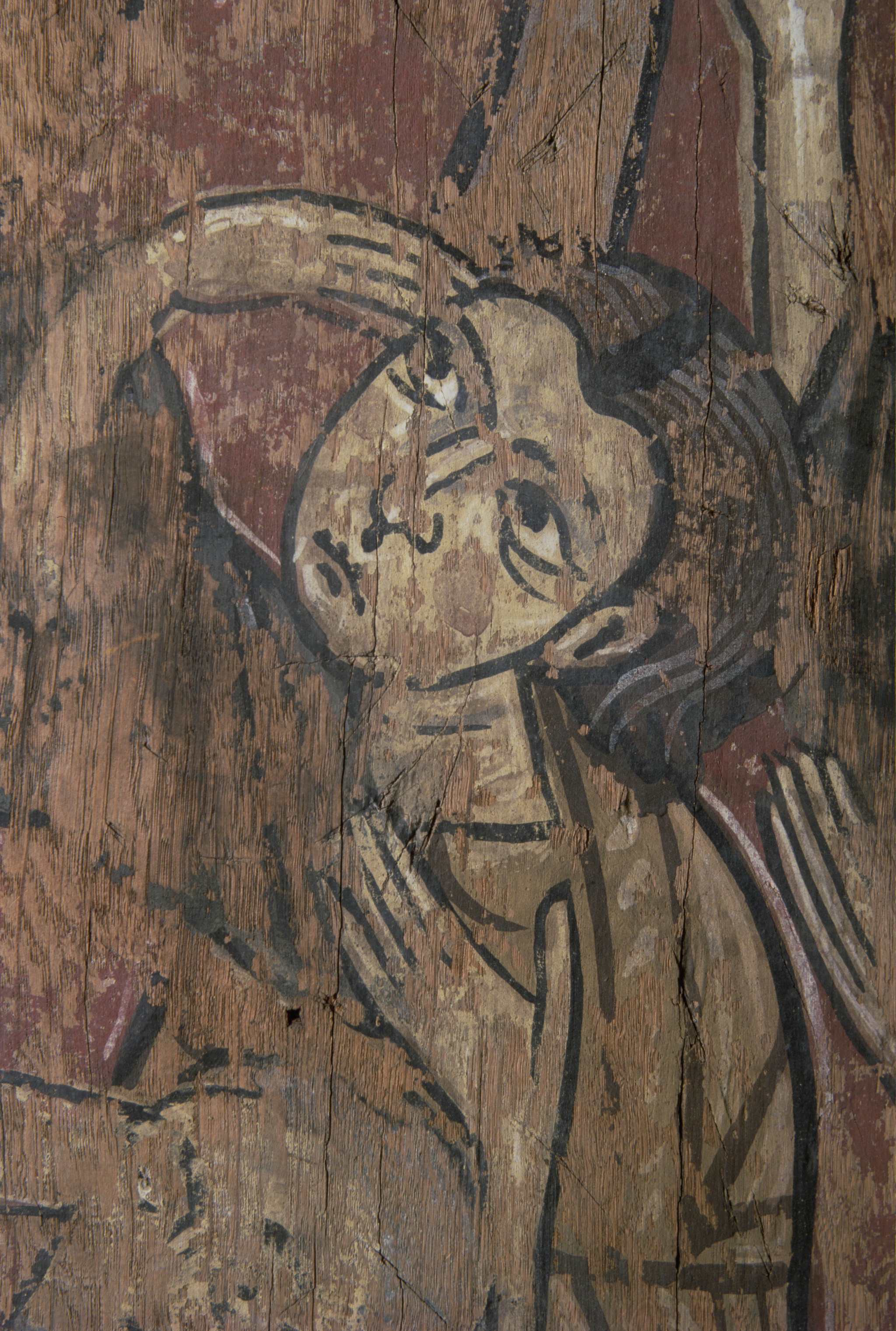 Kondition: . Färg: den målade bildframställningen är nött och fragmentarisk.