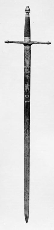 Korsfäste av mörkanlöpt stål med genomgående ornering av vertikala (knappen), horisontella (kavelns övre och nedre beslag) samt snedställda (parerstänger och kryss) räfflor. Kavel av ebenholts med rundat, rektangulärt tvärsnitt och avsmalnande uppåt, på bredsidorna av rutmönster, på smalsidorna längsgående ränder. Inskuren ornering. Klinga rak, tvåeggad, sexsidigt slipad. Starka delen med etsad, förgylld ornering mot blånerad botten. På den ena sidan räknat från basen en tunn blad- och blomranka, monogram i skrivstil M J K(?), häröver en sluten krona, trofégrupp, bladornament. På den andra sidan likartad dekor, dock med skillnaden att mellan de två översta ornamenten har tillkommit en oval bladkrans. Utmed klingbasen etsad mästarsignatur i skrivstil, på ena sidan: "P. Knecht", på den andra "in Solingen" (Peter Knecht 1798-1850).